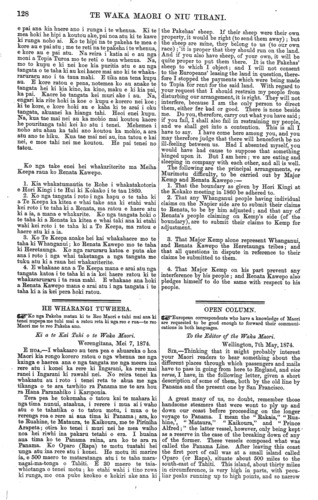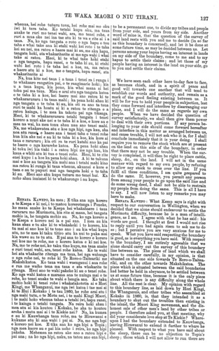 TE WAKA MAORI O NIU TIRANI. 127 whenua, hei rohe tuturu tonu, hei rohe mai mo oku iwi ki tera taha. Ko tetahi kupu aku, ma taua anake te ruri mo tenei wahi, ara, mo tenei rohe, e ruri a mua ake nei ina tae atu ki te wa e rite ai i a taua. Na, ko nga tangata o roto o nga hapu o tou taha e whai take ana ki etahi wahi kei roto i te taha kei au nei, ma ratou e haere mai ki au, me aku hapu, tangata hoki, ata whakariterite ai mo nga wahi i whai take ai ratou. Heoi, ki te whai take hoki etahi o nga tangata, hapu ranei, o te taha ki au, ki etahi wahi kei roto i te taha kei a koe, na, ma ratou e haere atu ki a koe, me o tangata, hapu ranei, ata whakariterite ai Na, kua kite nei taua i a taua i tenei ra i runga i te whakaaro rangatira pai, o te rangimarie hoki; kia u a taua kupu, kia pono, kia whai mana ai hei tohu pai ma taua. Mau e arai atu nga tangata katoa o te taha ki a koe, kei haere mai ano ratou ki te whakararuraru i ta taua mahi; ka pena hoki ahau ki nga tangata o te taha ki au, kia oti ra ano ta taua ruri te mahi ka hoatu ai ki a ratou te ritenga o a ratou kainga, i te mea ka takoto pai nga tikanga. Heoi, ki te whakararuraru tetahi tangata i tenei korero a muri ake nei o te taha ki a koe, e kore au e mea na wai, ka mea tonu ahau nau ano tenei mahi. Na, me whakawatea atu e koe nga hipi, nga kau, aha noa atu ranei e haere ana i tenei taha o tenei rohe kua kiia ake nei e au ki te taha ki a koe, kia kore ai taua e raruraru; kia oti ra te ruri katahi ano ka pai te haere o nga kararehe katoa. Ka pena hoki ahau ki toku iwi kia tiaki i a ratou hipi me nga kau, kia kaua e whiti atu ki tua o tenei rohe. Heoi, ki te rite enei kupu i a koe ka pena hoki ahau. A ki te tukuna mai e koe au tangata kia mahi aua i tetahi mahi kino ma ratou ki runga ki taua whenua, akuanei e kore e taea e au te pupuri mai nga tangata hoki o te taha ki au. Heoi ano aku kupu tuturu mo tenei hui. Ka noho ahau inaianei ki te whakarongo i au kupu. RENATA KAWEPO, ka mea; E tika ana nga korero a te Keepa e ki nei, i to matou korerotanga i Poneke, ko maua anake ko te Keepa hei whakahaere i taua raruraru mo Murimotu, kia rite ai maua, hei tangata mohio ia, he tangata mohio au. Na, ko nga korero a te Keepa e korero nei ia e pai ana. I mea au kia kaua ahau e tu ake ki te whakahoki i to korero, kia tu mai ai ano koe ki te tono ano i au kia whai kupu atu, no te mea ki taku titiro atu ka nui to puka mai kia wawe au te tu atu. E pai ana to korero e korero nei koe mo te rohe, me o korero katoa e ki nei koe. Na, mo te rohe nei, ko taku tino kupu, ma taua anake e ruri tenei wahi, ara, tenei rohe katoa. Ko te wahi hei ata whakarite ritenga ma taua, hei nga wahanga o nga rohe nei, te rohe ki Te Roro-o-Taiteariki me Makahikatoa. Ko taua wahi i waenganui i aua rohe e rua me waiho tena ma taua e ata whakarite te ritenga. Heoi ano te wahi pakeke ki au o tenei rohe. Ko nga wahi katoa e marama ana te nuinga mai o te rohe, ko tenei anake te wahi e hengia ana. Ko taku mohio hoki ki tenei rohe i whakatakotoria ai e Hori Kingi, me Whanganui, me nga iwi katoa i tae mai ai ki te Hui i Kokako i te tau 1860, he rohe arai atu i nga mahi tutu, o te Motu nei, i te mahi Kingi Maor], i te mahi hoko whenua tahae a tetahi iwi, hapu ranei i te kainga o tetahi tangata. Na reira hoki ahau i mea atu ai kia koutou i Kokako, he aha to koutou aroha i mutu mai ai i te Kiekie nei ? Na, ka kumea e au ki Kauwhanga taua rohe, ma te Hirawanui e kukume atu ki ana wahi i pai ai. Na, mo nga hipi e korero nei koe. E tika ana ko nga hipi a Topia; nga mea kaore au e pai kia noho i reira, ko nga hipi pakeha. Mehemea na ratou ake ano a ratou hipi e pai ana; na ko nga hipi, naku, na tatou ano ena hipi, to be a permanent one, to divide my tribes and people from your side, and yours from my side. Another word of mine is, that the question of the survey of said land rests with you and me to decide (in so far as this boundary is concerned), and let it be done at some future time, as maybe decided between us. Let persons among your hapus having an interest in lands on my side of the boundary, come to me and to my hapus to settle their claims ; and let those of my people having an interest in the land on your side, go to you and settle their claims. We have seen each other here to-day face to face, as becomes chiefs, and in a spirit of peace and good will towards one another that will tend to establish our words and authority, and remain as a mark of the good feeling existing between us. It will be for you to hold your people in subjection, lest they come forward and interfere by disarranging our plans, and I will do the same as regards my own people. When we have decided the question of survey satisfactorily, we shall then give them power to deal with their own portions. If any person be- longing to your side should come forward hereafter and interfere in this matter as arranged between us, and cause trouble, I will not ask who it is, for I shall conclude immediately that it is your doing. I shall require you to remove the stock which are at present on the land on this side of the boundary, in order that there may not be any trouble. When the sur- vey is completed, it will then be right to place cattle, sheep, &c., on the land. I will act in the same manner with regard to my own people, by refusing to allow any stock to cross over the line. If you fulfil all these conditions, I am quite prepared to do the same. If, however, you permit any person from among your people to go upon the said line and do some wrong deed, I shall not be able to restrain my people from doing the same. This is all I have to say. I will now listen to any remarks you may have to make. RENATA KAWEPO : What Kemp says is right with respect to our conversation in Wellington, when we decided that we alone should endeavour to settle the Murimotu difficulty, because he is a man of intelli- gence, as I am. I agree with what he has said: his words are good. I thought at first I would not rise to reply until you had again ris