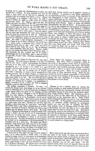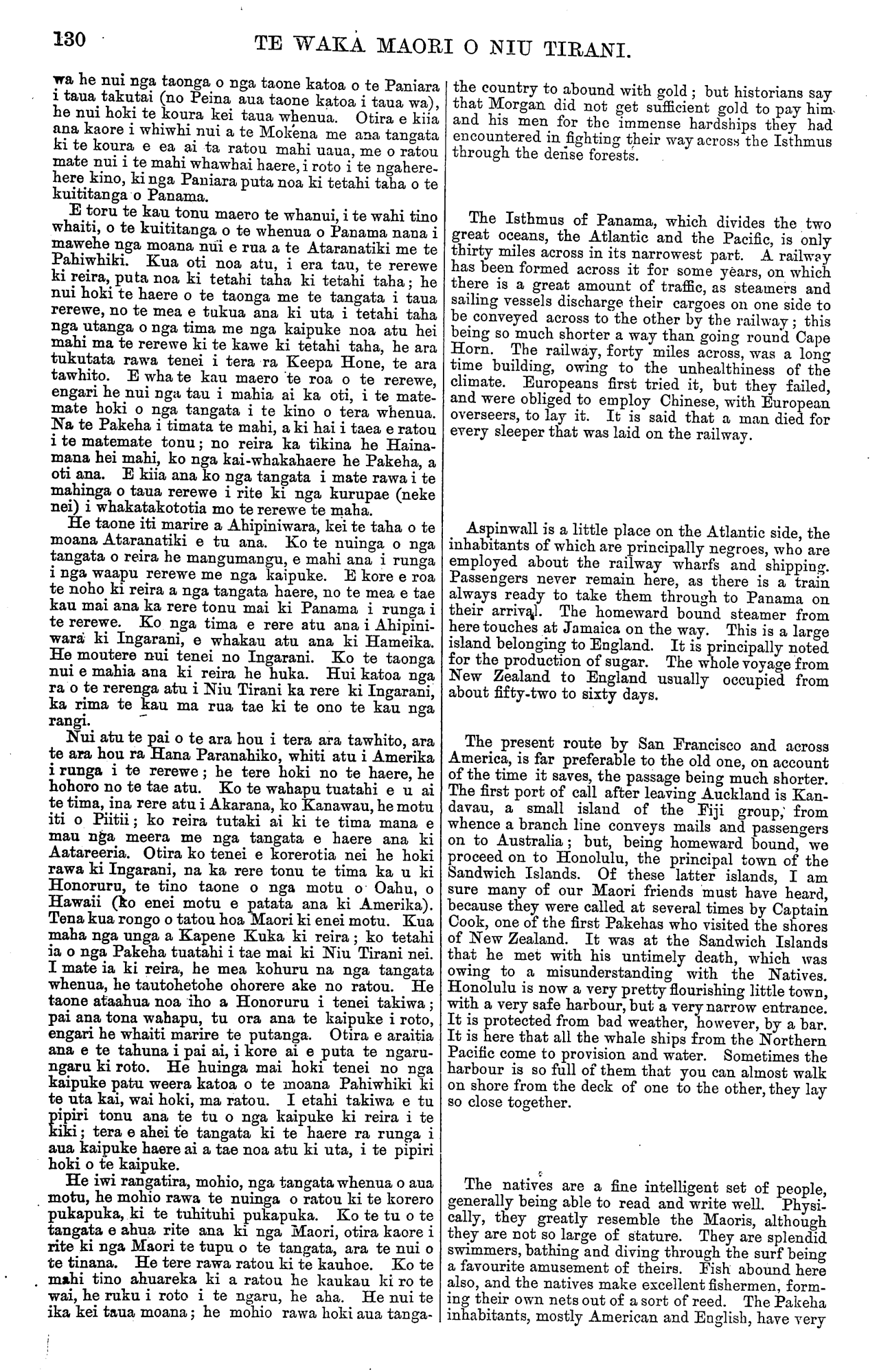 130 TE WAKA MAORI O NIU TIRANI. wa he nui nga taonga o nga taone katoa o te Paniara i taua takutai (no Pema aua taone katoa i taua wa), he nui hoki te koura kei taua whenua. Otira e kiia ana kaore i whiwhi nui a te Mokena me ana tangata ki te koura e ea ai ta ratou mahi uaua, me o ratou mate nui i te mahi whawhai haere, i roto i te ngahere- here kino, ki nga Paniara puta noa ki tetahi taha o te kuititanga o Panama. E toru te kau tonu maero te whanui, i te wahi tino whaiti, o te kuititanga o te whenua o Panama nana i mawehe nga moana nui e rua a te Ataranatiki me te Pahiwhiki. Kua oti noa atu, i era tau, te rerewe ki reira, puta noa ki tetahi taha ki tetahi taha; he nui hoki te haere o te taonga me te tangata i taua rerewe, no te mea e tukua ana ki uta i tetahi taha nga utanga o nga tima me nga kaipuke noa atu hei mahi ma te rerewe ki te kawe ki tetahi taha, he ara tukutata rawa tenei i tera ra Keepa Hone, te ara tawhito. E wha te kau maero te roa o te rerewe, engari he nui nga tau i mahia ai ka oti, i te mate- mate hoki o nga tangata i te kino o tera whenua. Na te Pakeha i timata te mahi, a ki hai i taea e ratou i te matemate tonu; no reira ka tikina he Haina- mana hei mahi, ko nga kai-whakahaere he Pakeha, a oti ana. E kiia ana ko nga tangata i mate rawa i te mahinga o taua rerewe i rite ki nga kurupae (neke nei) i whakatakotoria mo te rerewe te maha. He taone iti marire a Ahipiniwara, kei te taha o te moana Ataranatiki e tu ana. Ko te nuinga o nga tangata o reira he mangumangu, e mahi ana i runga i nga waapu rerewe me nga kaipuke. E kore e roa te noho ki reira a nga tangata haere, no te mea e tae kau mai ana ka rere tonu mai ki Panama i runga i te rerewe. Ko nga tima e rere atu ana i Ahipini- wara ki Ingarani, e whakau atu ana ki Hameika. He moutere nui tenei no Ingarani. Ko te taonga nui e mahia ana ki reira he huka. Hui katoa nga ra o te rerenga atu i Niu Tirani ka rere ki Ingarani, ka rima te kau ma rua tae ki te ono te kau nga rangi. Nui atu te pai o te ara hou i tera ara tawhito, ara te ara hou ra Hana Paranahiko, whiti atu i Amerika i runga i te rerewe : he tere hoki no te haere, he hohoro no te tae atu. Ko te wahapu tuatahi e u ai te tima, ina rere atu i Akarana, ko Kanawau, he motu iti o Piitii; ko reira tutaki ai ki te tima mana e mau nga meera me nga tangata e haere ana ki Aatareeria. Otira ko tenei e korerotia nei he hoki rawa ki Ingarani, na ka rere tonu te tima ka u ki Honoruru, te tino taone o nga motu o Oahu, o Hawaii (ko enei motu e patata ana ki Amerika). Tena kua rongo o tatou hoa Maori ki enei motu. Kua maha nga unga a Kapene Kuka ki reira ; ko tetahi ia o nga Pakeha tuatahi i tae mai ki Niu Tirani nei. I mate ia ki reira, he mea kohuru na nga tangata whenua, he tautohetohe ohorere ake no ratou. He taone ataahua noa iho a Honoruru i tenei takiwa; pai ana tona wahapu, tu ora ana te kaipuke i roto, engari he whaiti marire te putanga. Otira e araitia ana e te tahuna i pai ai, i kore ai e puta te ngaru- ngaru ki roto. He huinga mai hoki tenei no nga kaipuke patu weera katoa o te moana Pahiwhiki ki te uta kai, wai hoki, ma ratou. I etahi takiwa e tu pipiri tonu ana te tu o nga kaipuke ki reira i te kiki; tera e ahei te tangata ki te haere ra runga i aua kaipuke haere ai a tae noa atu ki uta, i te pipiri hoki o te kaipuke. He iwi rangatira, mohio, nga tangata whenua o aua motu, he mohio rawa te nuinga o ratou ki te korero pukapuka, ki te tuhituhi pukapuka. Ko te tu o te tangata e ahua rite ana ki nga Maori, otira kaore i rite ki nga Maori te tupu o te tangata, ara te nui o te tinana. He tere rawa ratou ki te kauhoe. Ko te mahi tino ahuareka ki a ratou he kaukau ki ro te wai, he ruku i roto i te ngaru, he aha. He nui te ika kei taua moana; he mohio rawa hoki aua tanga- the country to abound with gold : but historians say that Morgan did not get sufficient gold to pay him and his men for the immense hardships they had encountered in fighting their way across the Isthmus through the dense forests. The Isthmus of Panama, which divides the two great oceans, the Atlantic and the Pacific, is only thirty miles across in its narrowest part. A railway has been formed across it for some years, on which there is a great amount of traffic, as steamers and sailing vessels discharge their cargoes on one side to be conveyed across to the other by the railway; this being so much shorter a way than going round Cape Horn. The railway, forty miles across, was a long time building, owing to the unhealthiness of the climate. Europeans first tried it, but they failed, and were obliged to employ Chinese, with European overseers, to lay it. It is said that a man died for every sleeper that was laid on the railway. Aspinwall is a little place on the Atlantic side, the inhabitants of which are principally negroes, who are employed about the railway wharfs and shipping. Passengers never remain here, as there is a train always ready to take them through to Panama on their arrival. The homeward bound steamer from here touches at Jamaica on the way. This is a large island belonging to England. It is principally noted for the production of sugar. The whole voyage from New Zealand to England usually occupied from about fifty-two to sixty days. The present route by San Francisco and across America, is far preferable to the old one, on account of the time it saves, the passage being much shorter. The first port of call after leaving Auckland is Kan- davau, a small island of the Fiji group,' from whence a branch line conveys mails and passengers on to Australia : but, being homeward bound, we proceed on to Honolulu, the principal town of the Sandwich Islands. Of these latter islands, I am sure many of our Maori friends must have heard, because they were called at several times by Captain Cook, one of the first Pakehas who visited the shores of New Zealand. It was at the Sandwich Islands that he met with his untimely death, which was owing to a misunderstanding with the Natives. Honolulu is now a very pretty 