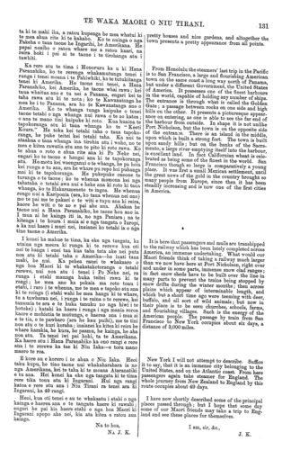 TE WAKA MAORI O NIU TIRANI. 181 ta ki te mahi ika, a ratou kupenga he mea whatui ki te mea ahua rite ki te kakaho. Ko te nuinga o nga Pakeha o taua taone he Ingarihi, he Amerikana. He papai noaiho o ratou whare me a ratou kaari, na reira hoki i pai ai te taone i te tirohanga atu i tawhiti. Ka rere atu te tima i Honoruru ka u ki Hana Paranahiko, ko te rerenga whakamutunga tenei i runga i tenei moana i te Pahiwhiki, ko te tutukitanga tenei ki Amerika. He taone nui tenei, a Hana Paranahiko, kei Amerika, he taone whai rawa; kei taua whaitua ano e tu nei a Panama, engari kei te taha rawa atu ki te nota; ko te Kawanatanga he mea ke i to Panama, ara ko te Kawanatanga ano o Amerika. Ko te whanga tunga kaipuke o tenei taone tetahi o nga whanga nui rawa o te ao katoa ; o ana te mano tini kaipuke ki roto. Kua huaina te tapokoranga atu ki taua whanga ko te " Keeti Koura." He toka kei tetahi taha o taua tapoko- ranga, he puke teitei kei tetahi taha. Ka nui te ataahua o taua whanga ina tirohia atu i waho, no te mea e kitea rawatia atu ana te pito ki roto rawa. Ko te ahua o roto e ahua rite ana ki Po Neke nei, engari ko te taone e hangai ana ki te tapokoranga atu. He motu kei waenganui o te whanga, he pa hoia kei runga e tu ana, ara he whare pu repo hei puhanga mai ki te tapokoranga. He pukepuke oneone te turanga o te taone; ko te whenua momona kei nga tahataha o tetahi awa nui e heke ana ki roto ki taua whanga, ko te Hakarameneto te ingoa. He whenua rongo nui a Kariponia (ara, ko taua whenua nei ano) mo te pai me te pakari o te witi e tupu ana ki reira, kaore he witi o te ao e pai ake ana. Ahakoa he taone nui a Hana Paranahiko, he taone hou ano ia. I mua ai he kainga iti ia, no nga Paniara; na te kitenga i te koura i muia ai e nga tangata o luropi, a ka nui haere i muri nei, inaianei ko tetahi ia o nga tino taone o Amerika. I konei ka mahue te tima, ka eke nga tangata, ka utaina nga meera ki runga ki te rerewe kua oti nei te hanga i enei tau kua taha tata ake nei puta noa atu ki tetahi taha o Amerika—he inati taua mahi, he nui. Ka pehea ranei te whakaaro o nga hoa Maori ki te whakatakotoranga o tetahi rerewe, nui noa atu i tenei i Po Neke nei, ra runga i etahi maunga huka teitei rawa ki te rangi; he mea ano ka pokaia ma roto tonu i etahi, i raro i te whenua, me te mea e tapoko atu ana ki te reinga (i etahi wahi he mea hanga ki te whare, tu a tawharau nei, i runga i te raina o te rerewe, kei tanumia te ara e te huka tanuku no nga hiwi i te hotoke) ; katahi ka haere i runga i nga mania roroa kaore e mohiotia te mutunga, e haerea ana i mua ai e te tia, e te pawharo (ara he kau puihi), me te tini noa atu o te kuri koraha; inaianei ka kitea ki reira he whare karakia, he kura, he paamu, he kainga, he aha noa atu. Ta tenei iwi pai hoki, ta te Amerikana. Ka haere atu i Hana Paranahiko ka ono rangi e rere ana i te rerewe ka tae ki Niu Iaka—e toru mano maero te roa. E kore au e korero i te ahua o Niu laka. Heoi taku kupu, he tino taone nui whakaharahara ia no nga Amerikana, kei te taha ki te moana Ataranatiki e tu ana. Hei konei ka eke nga tangata ki te tima rere tika tonu atu ki Ingarani. Hui nga rangi katoa e rere atu ana i Niu Tirani ra tenei ara ki Ingarani, ka 49 rangi. - Heoi, kua oti tenei e au te whakaatu i etahi o nga kainga e haerea ana e te tangata haere ki rawahi ; engari he pai kia haere etahi o nga hoa Maori ki Ingarani apopo ake nei, kia ata kitea e ratou aua kainga. Na to hoa, NA J. K. pretty houses and nice gardens, and altogether the town presents a pretty appearance from all points. From Honolulu the steamers' last trip in the Pacific is to San Francisco, a large and flourishing American town on the same coast a long way north of Panama, but under a different Government, the United States of America. It possesses one of the finest harbours in the world, capable of holding any number of ships. The entrance is through what is called the Golden Gate : a passage between rocks on one side and high hills on the other. It presents a picturesque appear- ance on entering, as one is able to see the far end of the harbour from outside. In shape it is not unlike Port Nicholson, but the town is on the opposite side of the entrance. There is an island in the middle, upon which is built a strong fort. The town is built upon sandy hills : but on the banks of the Sacra- mento, a large river emptying itself into the harbour, is excellent land. In fact Californian wheat is cele- brated as being some of the finest in the world. San Francisco though so large is comparatively a young place. It was first a small Mexican settlement, until the great news of the gold in the country brought so many people from Europe, since then it has been steadily increasing and is now one of the first cities in America. It is here that passengers and mails are transhipped to the railway which has been lately completed across America, an immense undertaking. What would our Maori friends think of taking a railway much larger than we now have here at Port Nicholson, right over and under in some parts, immense snow clad ranges; in fact snow sheds have to be built over the line in. many parts to prevent the trains being stopped by snow drifts during the winter months: then across plains which appear of interminable length, and which but a short time ago were teeming with deer, buffalo, and all sort of wild animals; but now in their place is to be seen churches, schools, farms, and flourishing villages. Such is the energy of the American people. The passage by train from San Francisco to New York occupies about six days, a distance of 3,000 miles. New York I will not attempt to describe. Suffice it to say, that it is an immense city belonging to the United States, and on the Atlantic coast. From here passengers again take steamer for England. The whole journey from New Zealand to England by this route occupies about 49 days. I have now shortly described some of the principal places passed through; but I hope that some day some of our 