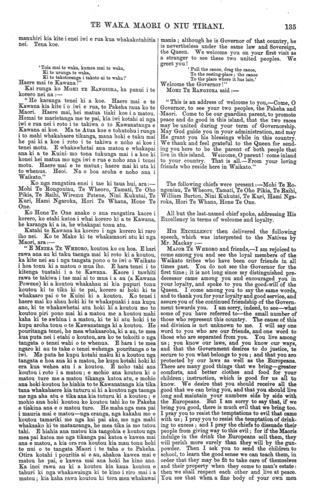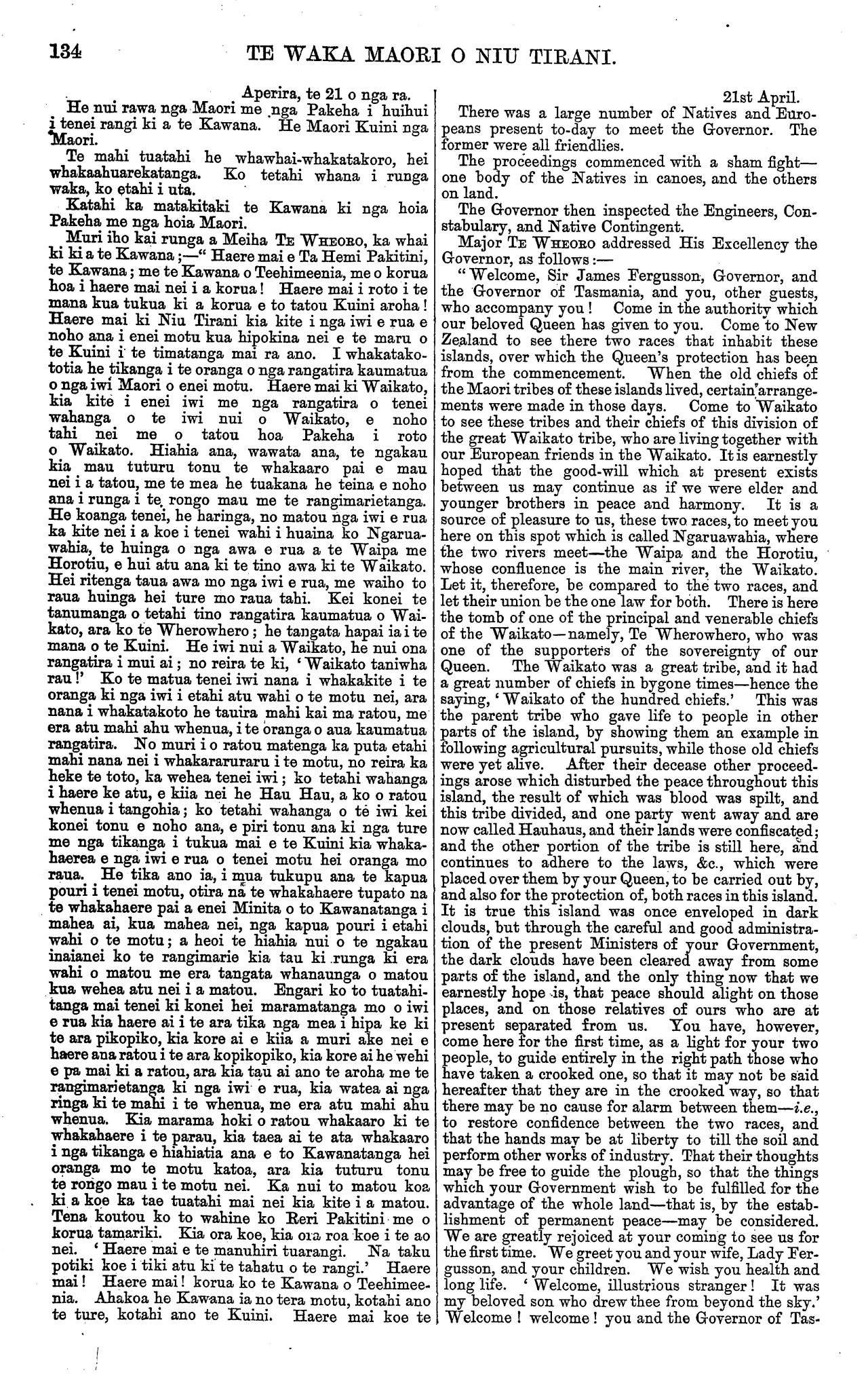 TE WAKA MAORI O NIU TIRANI. 135 manuhiri kia kite i enei iwi e rua kua whakakotahitia nei. Tena koe. ' Toia mai te waka, kumea mai te waka, Ki te urunga te waka, Ki te takotoranga i takoto ai te waka!' Haere mai te Kawana!" Kai runga ko MOHI TE RANGIORA., ka panui i te korero nei na :— "He karanga tenei ki a koe. Haere mai e te Kawana kia kite i o iwi e rua, te Pakeha raua ko te Maori. Haere mai, hei matua tiaki koe i a matou. Homai te marietanga me te pai, kia iwi kotahi ai nga iwi e rua nei i roto i te takiwa o to Kawanatanga e Kawana ai koe. Ma te Atua koe e tohutohu i runga i to mahi whakahaere tikanga, mana hoki e tuku mai he pai ki a koe i roto i te takiwa e noho ai koe i tenei motu. E whakawhetai ana matou e whakapai ana ki a te Kuini mo tona tukunga mai i a koe ki konei hei matua mo nga iwi e rua e noho ana i tenei motu. Haere mai e te matua; haere mai ki uta ki to whenua. Heoi. Na o hoa aroha e noho ana i Waikato." Ko nga rangatira enei i tae ki taua hui, ara:— Mohi Te Rongoniau, Te Wheoro, Tamati, Te Oho Pikia, Te Raihi, Wiremu Patene, Nini Kukutai, Te Kuri, Hami Ngaroka, Hori Te Whana, Hone Te One. Ko Hone Te One anake o aua rangatira kaore i korero, ko etahi katoa i whai korero ki a te Kawana, he karanga ki a ia, he whakapai tonu atu. Katahi te Kawana ka korero i nga korero ki raro iho nei. Ko te Make ki te whakamaori atu ki nga Maori, ara:— " E MEIHA TE WHEORO, koutou ko ou hoa. E hari rawa ana au ki taku taenga mai ki roto ki a koutou, ka kite nei au i nga tangata pono o te iwi o Waikato i hoa tonu ki a matou o mua iho. E hara tenei i to kitenga tuatahi i a te Kawana. Kaore i tawhiti rawa te takiwa i tae mai ai to mua ia au (a Kawana Powene) ki a koutou whakahau ai kia pupuri tonu koutou ki te tika ki te pai, korero ai hoki ki te whakaaro pai o te Kuini ki a koutou. Ko tenei i haere mai ko ahau hoki ki te whakapuaki i aua kupu ano, ki te whakawhetai atu hoki ki a koutou mo to koutou, piri pono mai ki a matou me a koutou mahi kaha ki te awhina i a matou, ki te ki atu hoki i te kupu aroha tonu o te Kawanatanga ki a koutou. He pouritanga tenei, he mea whakaaroha, ki a au, te mea kua puta nei i etahi o koutou, ara ko te tokoiti o nga tangata o tenei wahi o te whenua. E hara i te mea ngaro ki au te take o tenei wehenga pouritanga o te iwi. Me puta he kupu kotahi maku ki a koutou nga tangata e hoa ana ki a matou, he kupu kotahi hoki ki era kua wehea atu i a koutou. E noho tahi ana koutou i roto i a matou; e mohio ana koutou ki o matou ture me a matou tikanga katoa atu, e mohio ana hoki koutou he hiahia to te Kawanatanga kia tika tana whakahaere kia tuturu ai ki a koutou nga taonga me nga aha atu e tika ana kia tuturu ki a koutou ; e mohio ana hoki koutou ko koutou tahi ko te Pakeha e tiakina ana e o matou ture. He maha nga mea pai i mauria mai e matou—nga oranga, nga kakahu mo o koutou tamariki me nga kai pai ake, me nga mahi whakaako ki te matauranga, he mea tika ia mo tatou tahi. E hiahia ana matou kia tangohia e koutou nga mea pai katoa me nga tikanga pai katoa e kawea mai ana e matou, a kia ora roa koutou kia mau tonu hoki te nui o te tangata Maori i te taha o te Pakeha. Otira kotahi i pouritia ai e au, ahakoa kawea mai e matou he pai, e kawea mai ana hoki he kino ano. Ka inoi rawa au ki a koutou kia kaua koutou e tahuri ki nga whakawainga ki te kino i riro mai i a matou; kia kaha rawa koutou ki tera mea whakawai mania : although he is Governor of that country, he is nevertheless under the same law and Sovereign, the Queen. We welcome you on your first visit as a stranger to see these two united peoples. We greet you I ' Pull the canoe, drag the canoe, To the resting-place; the canoe To the place where it has lain. Welcome the Governor!" MOHI TE RANGIORA said :— " This is an address of welcome to you,—Come, O Governor, to see your two peoples, the Pakeha and Maori. Come to be our guardian parent, to promote peace and do good in this island, that the two races may be united during your term of Governorship. May God guide you in your administration, and may He grant you his blessings while in this country. We thank and feel grateful to the Queen for send- ing you here to be the parent of both people that live in this island. Welcome, O parent! come inland to your country. That is all.—From your loving friends who reside here in Waikato." The following chiefs were present:—Mohi Te Ro- ngomau, Te Wheoro, Tamati, Te Oho Pikia, Te Raihi, William Barton, Nini Kukutai, Te Kuri, Hami Nga- roka, Hori Te Whana, Hone Te One. All but the last-named chief spoke, addressing His Excellency in terms of welcome and loyalty. His EXCELLENCY then delivered the following speech, which was interpreted to the Natives by Mr. Mackay :— MAJOR TE WHEORO and friends,—I am rejoiced to come among you and see the loyal members of the Waikato tribes who have been our friends in all times past. You do not see the Governor for the first time: it is not long since my distinguished pre- decessor came among you and encouraged you in your loyalty, and spoke to you the good-will of the Queen. I come among you to say the same words, and to thank you for your loyalty and good service, and assure you of the continued friendship of the Govern- ment towards you. I am sorry, indeed, to see—what some of you have referred to—the small number of those who represent this country. The cause of this sad division is not unknown to me. I will say one word to you who are our friends, and one word to those who are separated from you. You live among us : you know our laws, and you know our ways, and that the Government desires to do justice, te secure to you what belongs to you : and that you aro protected by our laws as well as the Europeans. There are many good things that we bring—greater comforts, and better clothes and food for your children; instruction, which is good for us all to know. We desire that you should receive all the good that we can bring you, and that you should live long and maintain y