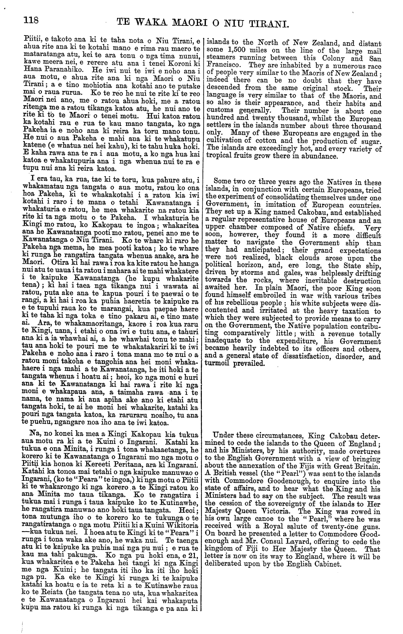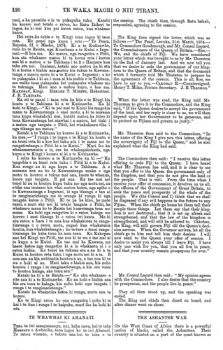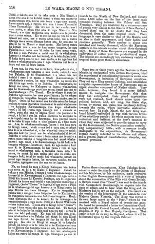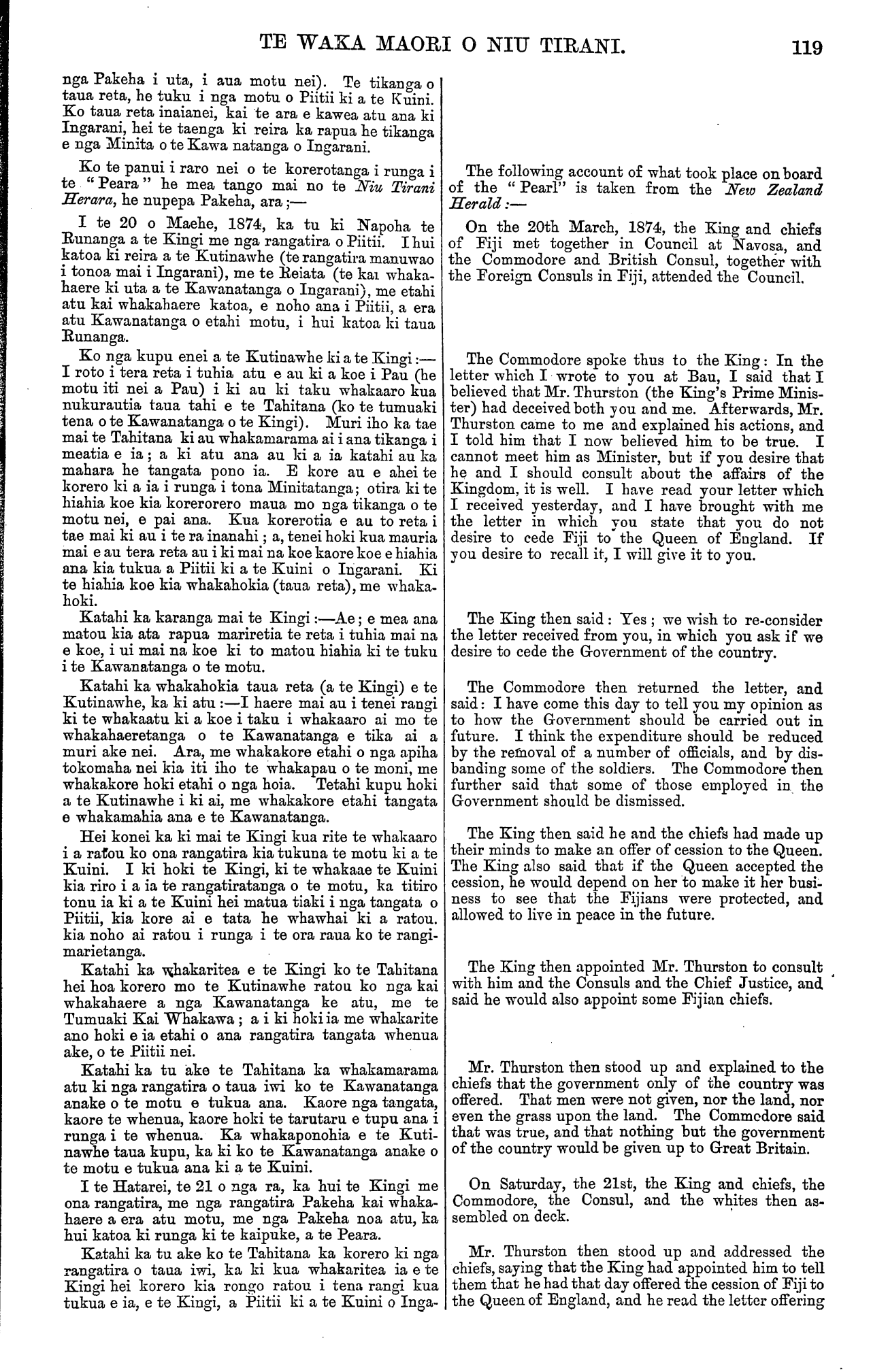 TE WAKA MAORI O NIU TIRANI. 119 nga Pakeha i uta, i aua motu nei). Te tikanga o taua reta, he tuku i nga motu o Piitii ki a te Kuini. Ko taua reta inaianei, kai te ara e kawea atu ana ki Ingarani, hei te taenga ki reira ka rapua he tikanga e nga Minita o te Kawa natanga o Ingarani. Ko te panui i raro nei o te korerotanga i runga i te "Peara" he mea tango mai no te Niu Tirani Herara, he nupepa Pakeha, ara;— I te 20 o Maehe, 1874, ka tu ki Napoha te Runanga a te Kingi me nga rangatira o Piitii. I hui katoa ki reira a te Kutinawhe (te rangatira manuwao i tonoa mai i Ingarani), me te Reiata (te kai whaka- haere ki uta a te Kawanatanga o Ingarani), me etahi atu kai whakahaere katoa, e noho ana i Piitii, a era atu Kawanatanga o etahi motu, i hui katoa ki taua Runanga. Ko nga kupu enei a te Kutinawhe ki a te Kingi:— I roto i tera reta i tuhia atu e au ki a koe i Pau (he motu iti nei a Pau) i ki au ki taku whakaaro kua nukurautia taua tahi e te Tahitana (ko te tumuaki tena o te Kawanatanga o te Kingi). Muri iho ka tae mai te Tahitana ki au whakamarama ai i ana tikanga i meatia e ia; a ki atu ana au ki a ia katahi au ka mahara he tangata pono ia. E kore au e ahei te korero ki a ia i runga i tona Minitatanga; otira ki te hiahia koe kia korerorero maua mo nga tikanga o te motu nei, e pai ana. Kua korerotia e au to reta i tae mai ki au i te ra inanahi; a, tenei hoki kua mauria mai e au tera reta au i ki mai na koe kaore koe e hiahia ana kia tukua a Piitii ki a te Kuini o Ingarani. Ki te hiahia koe kia whakahokia (taua reta),me whaka- hoki. Katahi ka karanga mai te Kingi:—Ae; e mea ana matou kia ata rapua mariretia te reta i tuhia mai na e koe, i ui mai na koe ki to matou hiahia ki te tuku i te Kawanatanga o te motu. Katahi ka whakahokia taua reta (a te Kingi) e te Kutinawhe, ka ki atu :—I haere mai au i tenei rangi ki te whakaatu ki a koe i taku i whakaaro ai mo te whakahaeretanga o te Kawanatanga e tika ai a muri ake nei. Ara, me whakakore etahi o nga apiha tokomaha nei kia iti iho te whakapau o te moni, me whakakore hoki etahi o nga hoia. Tetahi kupu hoki a te Kutinawhe i ki ai, me whakakore etahi tangata e whakamahia ana e te Kawanatanga. Hei konei ka ki mai te Kingi kua rite te whakaaro i a ratou ko ona rangatira kia tukuna te motu ki a te Kuini. I ki hoki te Kingi, ki te whakaae te Kuini kia riro i a ia te rangatiratanga o te motu, ka titiro tonu ia ki a te Kuini hei matua tiaki i nga tangata o Piitii, kia kore ai e tata he whawhai ki a ratou. kia noho ai ratou i runga i te ora raua ko te rangi- marietanga. Katahi ka whakaritea e te Kingi ko te Tahitana hei hoa korero mo te Kutinawhe ratou ko nga kai whakahaere a nga Kawanatanga ke atu, me te Tumuaki Kai Whakawa ; a i ki hoki ia me whakarite ano hoki e ia etahi o ana rangatira tangata whenua ake, o te Piitii nei. Katahi ka tu ake te Tahitana ka whakamarama atu ki nga rangatira o taua iwi ko te Kawanatanga anake o te motu e tukua ana. Kaore nga tangata, kaore te whenua, kaore hoki te tarutaru e tupu ana i runga i te whenua. Ka whakaponohia e te Kuti- nawhe taua kupu, ka ki ko te Kawanatanga anake o te motu e tukua ana ki a te Kuini. I te Hatarei, te 21 o nga ra, ka hui te Kingi me ona rangatira, me nga rangatira Pakeha kai whaka- haere a era atu motu, me nga Pakeha noa atu, ka hui katoa ki runga ki te kaipuke, a te Peara. Katahi ka tu ake ko te Tahitana ka korero ki nga rangatira o taua iwi, ka ki kua whakaritea ia e te Kingi hei korero kia rongo ratou i tena rangi kua tukua e ia, e te Kingi, a Piitii ki a te Kuini o Inga- The following account of what took place on board of the " Pearl" is taken from the New Zealand Herald:— On the 20th March, 1874, the King and chiefs of Fiji met together in Council at Navosa, and the Commodore and British Consul, together with the Foreign Consuls in Fiji, attended the Council. The Commodore spoke thus to the King: In the letter which I wrote to you at Bau, I said that I believed that Mr. Thurston (the King's Prime Minis- ter) had deceived both you and me. Afterwards, Mr. Thurston came to me and explained his actions, and I told him that I now believed him to be true. I cannot meet him as Minister, but if you desire that he and I should consult about the affairs of the Kingdom, it is well. I have read your letter which I received yesterday, and I have brought with me the letter in which you state that you do not desire to cede Fiji to the Queen of England. If you desire to recall it, I will give it to you. The King then said : Yes we wish to re-consider the letter received from you, in which you ask if we desire to cede the Government of the country. The Commodore then returned the letter, and said: I have come this day to tell you my opinion as to how the Government should be carried out in future. I think the expenditure should be reduced by the removal of a number of officials, and by dis- banding some of the soldiers. The Commodore then further said that some of those employed in the Government should be dismissed. The King then said he and the chiefs had made up their minds to make an offer of cession to the Queen. The King also said that if the Queen accepted the cession, he would depend on her to make it her busi- ness to see that the Fijians were protected, and allowed to live in peace in the future. The King then appointed Mr. Thurston to consult with him and the Consuls and the Chief Justice, and said he would also appoint some Fijian chiefs. Mr. Thurston then stood up and explained to the chiefs that the government only of the country was offered. That men were not given, nor the land, nor even the grass upon the land. The Commodore said that was true, and that nothing but the government of the country would be given up to Great Britain. On Saturday, the 21st, the King and chiefs, the Commodore, the Consul, and the whites then as- sembled on deck. Mr. Thurston then stood up and addressed the chiefs, saying that the King had appointed him to tell them that he had that day offered the cessio