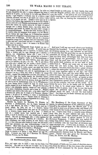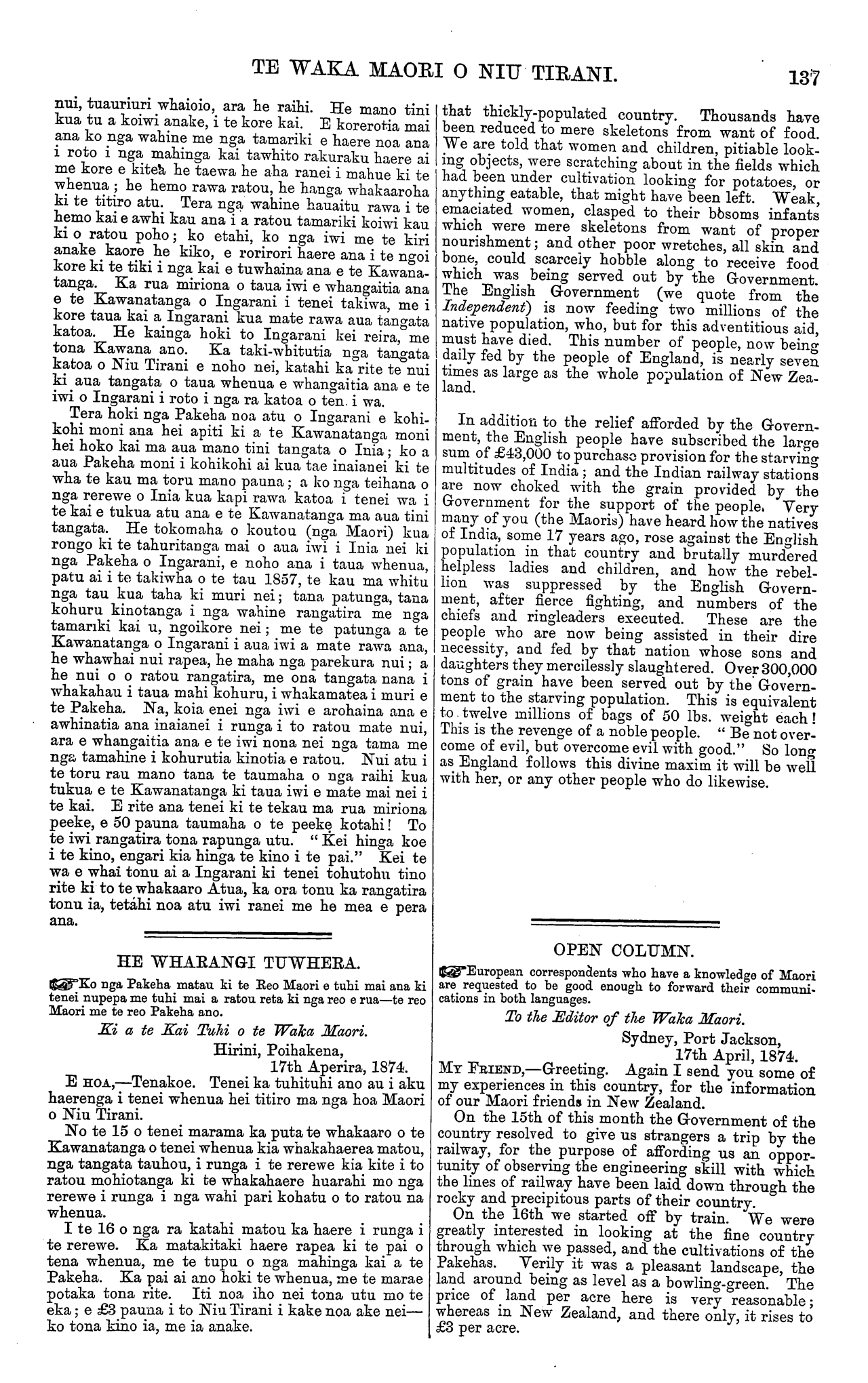 TE WAKA MAORI O NIU TIRANI. 137 nui, tuauriuri whaioio, ara he raihi. He mano tini kua tu a koiwi anake, i te kore kai. E korerotia mai ana ko nga wahine me nga tamariki e haere noa ana i roto i nga mahinga kai tawhito rakuraku haere ai me kore e kitea he taewa he aha ranei i mahue ki te whenua ; he hemo rawa ratou, he hanga whakaaroha ki te titiro atu. Tera nga wahine hauaitu rawa i te hemo kai e awhi kau ana i a ratou tamariki koiwi kau ki o ratou poho; ko etahi, ko nga iwi me te kiri anake kaore he kiko, e rorirori haere ana i te ngoi kore ki te tiki i nga kai e tuwhaina ana e te Kawana- tanga. Ka rua miriona o taua iwi e whangaitia ana e te Kawanatanga o Ingarani i tenei takiwa, me i kore taua kai a Ingarani kua mate rawa aua tangata katoa. He kainga hoki to Ingarani kei reira, me tona Kawana ano. Ka taki-whitutia nga tangata katoa o Niu Tirani e noho nei, katahi ka rite te nui ki aua tangata o taua whenua e whangaitia ana e te iwi o Ingarani i roto i nga ra katoa o ten. i wa. Tera hoki nga Pakeha noa atu o Ingarani e kohi- kohi moni ana hei apiti ki a te Kawanatanga moni hei hoko kai ma aua mano tini tangata o Inia; ko a aua Pakeha moni i kohikohi ai kua tae inaianei ki te wha te kau ma toru mano pauna; a ko nga teihana o nga rerewe o Inia kua kapi rawa katoa i tenei wa i te kai e tukua atu ana e te Kawanatanga ma aua tini tangata. He tokomaha o koutou (nga Mao ri) kua rongo ki te tahuritanga mai o aua iwi i Inia nei ki nga Pakeha o Ingarani, e noho ana i taua whenua, patu ai i te takiwha o te tau 1857, te kau ma whitu nga tau kua taha ki muri nei; tana patunga, tana kohuru kinotanga i nga wahine rangatira me nga tamariki kai u, ngoikore nei; me te patunga a te Kawanatanga o Ingarani i aua iwi a mate rawa ana, he whawhai nui rapea, he maha nga parekura nui; a he nui o o ratou rangatira, me ona tangata nana i whakahau i taua mahi kohuru, i whakamatea i muri e te Pakeha. Na, koia enei nga iwi e arohaina ana e awhinatia ana inaianei i runga i to ratou mate nui, ara e whangaitia ana e te iwi nona nei nga tama me nga tamahine i kohurutia kinotia e ratou. Nui atu i te toru rau mano tana te taumaha o nga raihi kua tukua e te Kawanatanga ki taua iwi e mate mai nei i te kai. E rite ana tenei ki te tekau ma rua miriona peeke, e 50 pauna taumaha o te peeke kotahi! To te iwi rangatira tona rapunga utu. " Kei hinga koe i te kino, engari kia hinga te kino i te pai." Kei te wa e whai tonu ai a Ingarani ki tenei tohutohu tino rite ki to te whakaaro Atua, ka ora tonu ka rangatira tonu ia, tetahi noa atu iwi ranei me he mea e pera ana. HE WHARANGI TUWHERA. Ko nga Pakeha matau ki te Reo Maori e tuhi mai ana ki tenei nupepa me tuhi mai a ratou reta ki nga reo e rua—te reo Maori me te reo Pakeha ano. Ki a te Kai Tuhi o te Waka, Maori. Hirini, Poihakena, 17th Aperira, 1874. E HOA,—Tenakoe. Tenei ka tuhituhi ano au i aku haerenga i tenei whenua hei titiro ma nga hoa Maori o Niu Tirani. No te 15 o tenei marama ka puta te whakaaro o te Kawanatanga o tenei whenua kia whakahaerea matou, nga tangata tauhou, i runga i te rerewe kia kite i to ratou mohiotanga ki te whakahaere huarahi mo nga rerewe i runga i nga wahi pari kohatu o to ratou na whenua. I te 16 o nga ra katahi matou ka haere i runga i te rerewe. Ka matakitaki haere rapea ki te pai o tena whenua, me te tupu o nga mahinga kai a te Pakeha. Ka pai ai ano hoki te whenua, me te marae potaka tona rite. Iti noa iho nei tona utu mo te eka; e £3 pauna i to Niu Tirani i kake noa ake nei— ko tona kino ia, me ia anake. that thickly-populated country. Thousands have been reduced to mere skeletons from want of food. We are told that women and children, pitiable look- ing objects, were scratching about in the fields which had been under cultivation looking for potatoes, or anything eatable, that might have been left. Weak, emaciated women, clasped to their bosoms infants which were mere skeletons from want of proper nourishment; and other poor wretches, all skin and bone, could scarcely hobble along to receive food which was being served out by the Government. The English Government (we quote from the Independent) is now feeding two millions of the native population, who, but for this adventitious aid, must have died. This number of people, now being daily fed by the people of England, is nearly seven times as large as the whole population of New Zea- land. In addition to the relief afforded by the Govern- ment, the English people have subscribed the large sum of £43,000 to purchase provision for the starving multitudes of India ; and the Indian railway stations are now choked with the grain provided by the Government for the support of the people. Very many of you (the Maoris) have heard how the natives of India, some 17 years ago, rose against the English population in that country and brutally murdered helpless ladies and children, and how the rebel- lion was suppressed by the English Govern- ment, after fierce fighting, and numbers of the chiefs and ringleaders executed. These are the people who are now being assisted in their dire necessity, and fed by that nation whose sons and daughters they mercilessly slaughtered. Over 300,000 tons of grain have been served out by the Govern- ment to the starving population. This is equivalent to twelve millions of bags of 50 Ibs. weight each ! This is the revenge of a noble people. " Be not over- come of evil, but overcome evil with good." So long as England follows this divine maxim it will be well with her, or any other people who do likewise. OPEN COLUMN. European correspondents who have a knowledge of Maori are requested to be good enough to forward their communi- cations in both languages. To the Editor of the Waka Maori. Sydney, Port Jackson, 17th April, 1874. MY FRIEND,—Greeting. Again I send you some of my experiences in this country, for the information of our Maori friend» in New Zealand. On the 15th of this month the Government of the country resolved to give us strangers a trip by the railway, for t