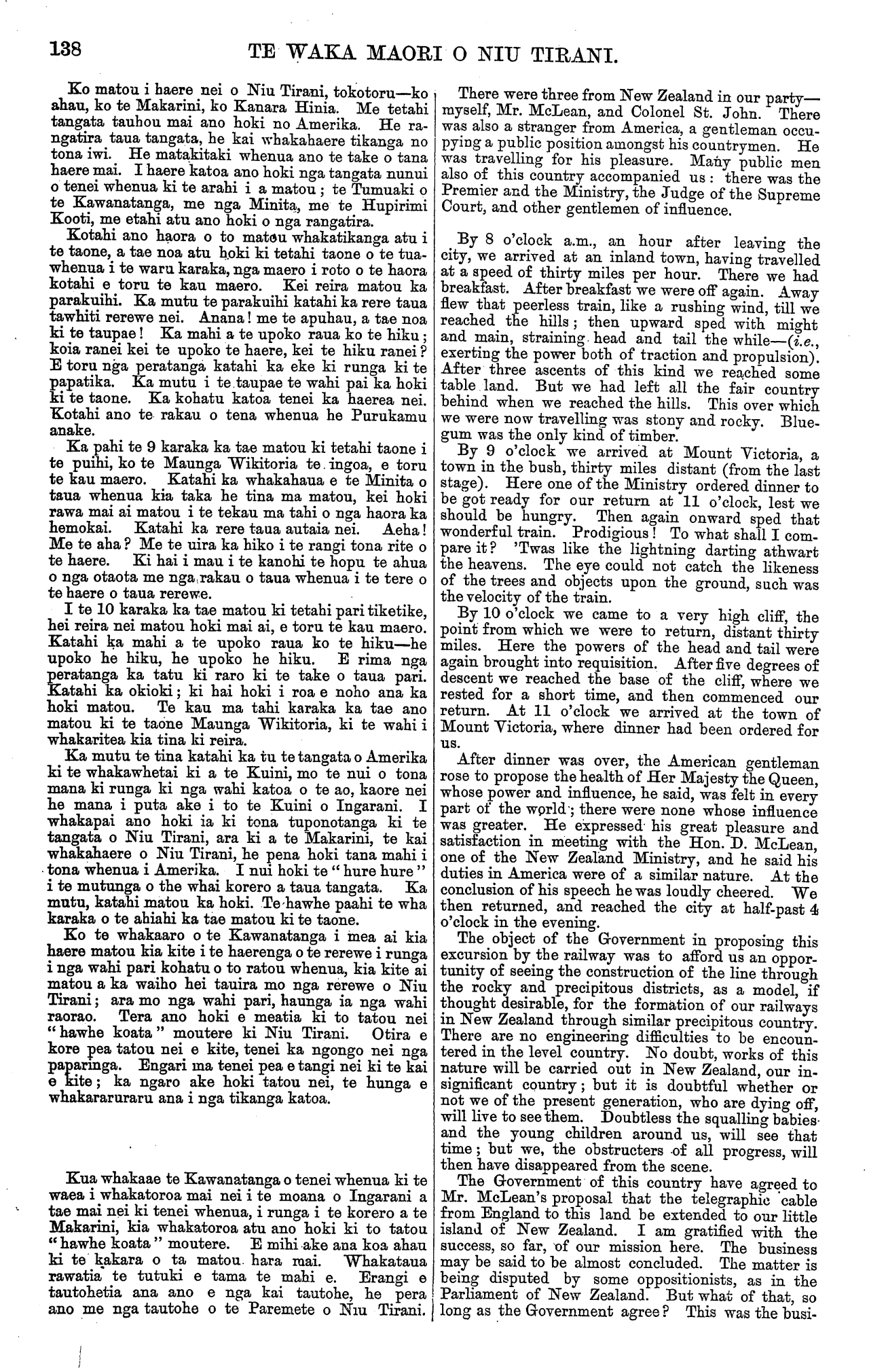 138 TE WAKA MAORI O NIU TIRANI. Ko matou i haere nei o Niu Tirani, tokotoru—ko ahau, ko te Makarini, ko Kanara Hinia. Me tetahi tangata tauhou mai ano hoki no Amerika. He ra- ngatira taua tangata, he kai whakahaere tikanga no tona iwi. He matakitaki whenua ano te take o tana haere mai. I haere katoa ano hoki nga tangata nunui o tenei whenua ki te arahi i a matou ; te Tumuaki o te Kawanatanga, me nga Minita, me te Hupirimi Kooti, me etahi atu ano hoki o nga rangatira. Kotahi ano haora o to matou whakatikanga atu i te taone, a tae noa atu hoki ki tetahi taone o te tua- whenua i te waru karaka, nga maero i roto o te haora kotahi e toru te kau maero. Kei reira matou ka parakuihi. Ka mutu te parakuihi katahi ka rere taua tawhiti rerewe nei. Anana! me te apuhau, a tae noa ki te taupae! Ka mahi a te upoko raua ko te hiku; koia ranei kei te upoko te haere, kei te hiku ranei ? E toru nga peratanga katahi ka eke ki runga ki te papatika. Ka mutu i te.taupae te wahi pai ka hoki ki te taone. Ka kohatu katoa tenei ka haerea nei. Kotahi ano te rakau o tena whenua he Purukamu anake. Ka pahi te 9 karaka ka tae matou ki tetahi taone i te puihi, ko te Maunga Wikitoria te ingoa, e toru te kau maero. Katahi ka whakahaua e te Minita o taua whenua kia taka he tina ma matou, kei hoki rawa mai ai matou i te tekau ma tahi o nga haora ka hemokai. Katahi ka rere taua autaia nei. Aeha! Me te aha ? Me te uira ka hiko i te rangi tona rite o te haere. Ki hai i mau i te kanohi te hopu te ahua o nga otaota me nga rakau o taua whenua i te tere o te haere o taua rerewe. I te 10 karaka ka tae matou ki tetahi pari tiketike, hei reira nei matou hoki mai ai, e toru te kau maero. Katahi ka mahi a te upoko raua ko te hiku—he upoko he hiku, he upoko he hiku. E rima nga peratanga ka tatu ki raro ki te take o taua pari. Katahi ka okioki; ki hai hoki i roa e noho ana ka hoki matou. Te kau ma tahi karaka ka tae ano matou ki te taone Maunga Wikitoria, ki te wahi i whakaritea kia tina ki reira. Ka mutu te tina katahi ka tu te tangata o Amerika ki te whakawhetai ki a te Kuini, mo te nui o tona mana ki runga ki nga wahi katoa o te ao, kaore nei he mana i puta ake i to te Kuini o Ingarani. I whakapai ano hoki ia ki tona tuponotanga ki te tangata o Niu Tirani, ara ki a te Makarini, te kai whakahaere o Niu Tirani, he pena hoki tana mahi i tona whenua i Amerika. I nui hoki te " hure hure " i te mutunga o the whai korero a taua tangata. Ka mutu, katahi matou ka hoki. Te hawhe paahi te wha karaka o te ahiahi ka tae matou ki te taone. Ko te whakaaro o te Kawanatanga i mea ai kia haere matou kia kite i te haerenga o te rerewe i runga i nga wahi pari kohatu o to ratou whenua, kia kite ai matou a ka waiho hei tauira mo nga rerewe o Niu Tirani; ara mo nga wahi pari, haunga ia nga wahi raorao. Tera ano hoki e meatia ki to tatou nei " hawhe koata " moutere ki Niu Tirani. Otira e kore pea tatou nei e kite, tenei ka ngongo nei nga paparinga. Engari ma tenei pea e tangi nei ki te kai e kite; ka ngaro ake hoki tatou nei, te hunga e whakararuraru ana i nga tikanga katoa. Kua whakaae te Kawanatanga o tenei whenua ki te waea i whakatoroa mai nei i te moana o Ingarani a tae mai nei ki tenei whenua, i runga i te korero a te Makarini, kia whakatoroa atu ano hoki ki to tatou "hawhe koata " moutere. E mihi ake ana koa ahau ki te kakara o ta matou, hara mai. Whakataua rawatia te tutuki e tama te mahi e. Erangi e tautohetia ana ano e nga kai tautohe, he pera ano me nga tautohe o te Paremete o Niu Tirani. There were three from New Zealand in our party— myself, Mr. McLean, and Colonel St. John. There was also a stranger from America, a gentleman occu- pying a public position amongst his countrymen. He was travelling for his pleasure. Many public men also of this country accompanied us : there was the Premier and the Ministry, the Judge of the Supreme Court, and other gentlemen of influence. By 8 o'clock a.m., an hour after leaving the city, we arrived at an inland town, having travelled at a speed of thirty miles per hour. There we had breakfast. After breakfast we were off again. Away flew that peerless train, like a rushing wind, till we reached the hills ; then upward sped with might and main, straining head and tail the while—(i.e., exerting the power both of traction and propulsion). After three ascents of this kind we reached some table land. But we had left all the fair country behind when we reached the hills. This over which we were now travelling was stony and rocky. Blue- gum was the only kind of timber. By 9 o'clock we arrived at Mount Victoria, a town in the bush, thirty miles distant (from the last stage). Here one of the Ministry ordered dinner to be got ready for our return at 11 o'clock, lest we should be hungry. Then again onward sped that wonderful train. Prodigious ! To what shall I com- pare it? 'Twas like the lightning darting athwart the heavens. The eye could not catch the likeness of the trees and objects upon the ground, such was the velocity of the train. By 10 o'clock we came to a very high cliff, the point from which we were to return, distant thirty miles. Here the powers of the head and tail were again brought into requisition. After five degrees of descent we reached the base of the cliff, where we rested for a short time, and then commenced our return. At 11 o'clock we arrived at the town of Mount Victoria, where dinner had been ordered for us. After dinner was over, the American gentleman rose to propose the health of Her Majesty the Queen, whose power and influence, he said, was felt in every part of the world; there were none whose influence was greater. He expressed his great pleasure and satisfaction in meeting with the Hon. D. McLean, one of the New Zealand Ministry, and he said his duties in America were of a similar nature. At the conclusion of his speech he was loudly cheered. We then returned, and reached the city at half-past 4 o'clock in the evening. The object of the Government in proposing this excursion by the 