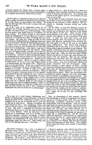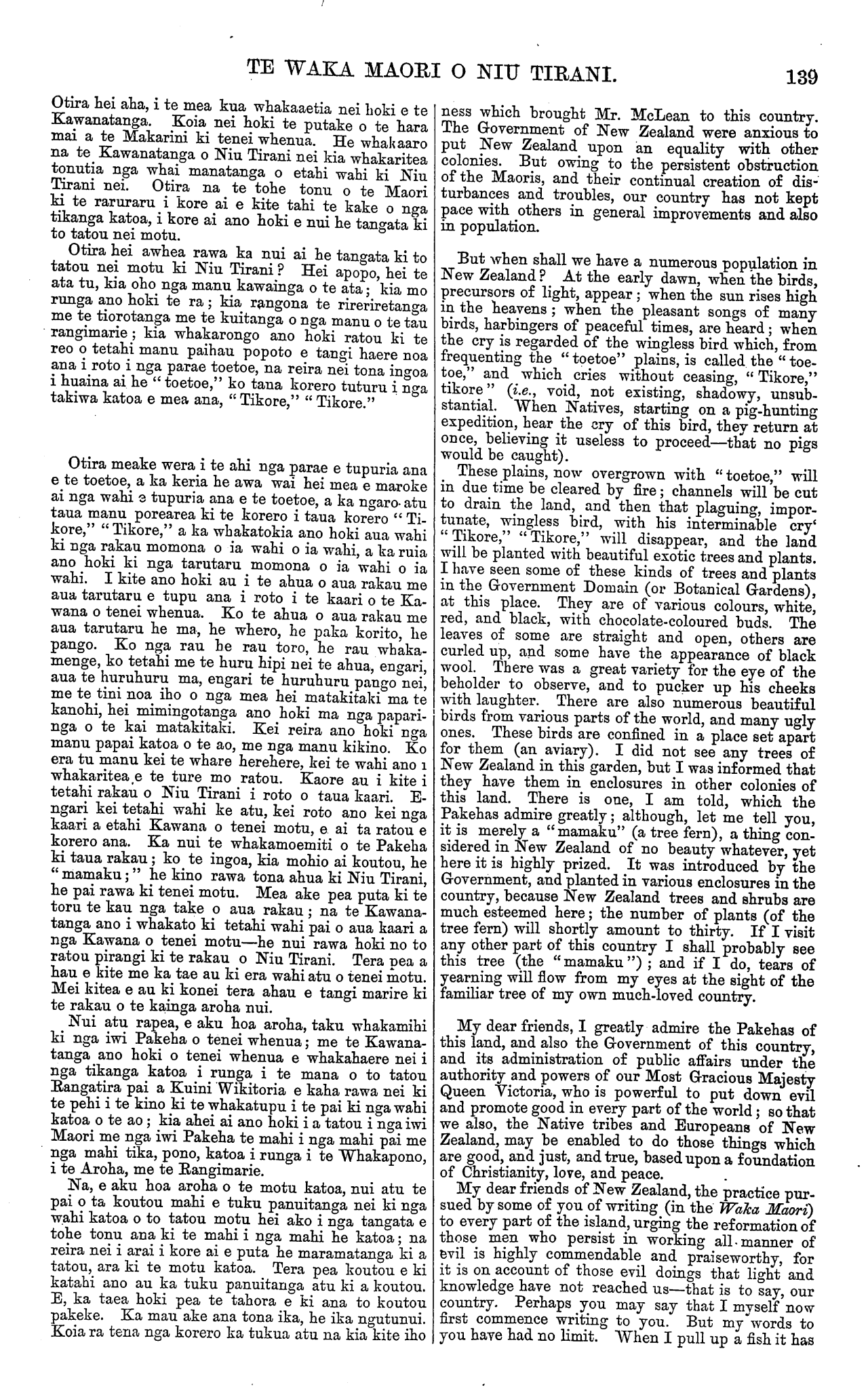 TE WAKA MAORI O NIU TIRANI. 189 Otira hei aha, i te mea kua whakaaetia nei hoki e te Kawanatanga. Koia nei hoki te putake o te hara mai a te Makarini ki tenei whenua. He whakaaro na te Kawanatanga o Niu Tirani nei kia whakaritea tonutia nga whai manatanga o etahi wahi ki Niu Tirani nei. Otira na te tohe tonu o te Maori ki te raruraru i kore ai e kite tahi te kake o nga tikanga katoa, i kore ai ano hoki e nui he tangata ki to tatou nei motu. Otira hei awhea rawa ka nui ai he tangata ki to tatou nei motu ki Niu Tirani ; Hei apopo, hei te ata tu, kia oho nga manu kawainga o te ata; kia mo runga ano hoki te ra; kia rangona te rireriretanga me te tiorotanga me te kuitanga o nga manu o te tau rangimarie ; kia whakarongo ano hoki ratou ki te reo o tetahi manu paihau popoto e tangi haere noa ana i roto i nga parae toetoe, na reira nei tona ingoa i huaina ai he " toetoe," ko tana korero tuturu i nga takiwa katoa e mea ana, " Tikore," " Tikore." Otira meake wera i te ahi nga parae e tupuna ana e te toetoe, a ka keria he awa wai hei mea e maroke ai nga wahi e tupuna ana e te toetoe, a ka ngaro atu taua manu porearea ki te korero i taua korero " Ti- kore," "Tikore," a ka whakatokia ano hoki aua wahi ki nga rakau momona o ia wahi o ia wahi, a ka ruia ano hoki ki nga tarutaru momona o ia wahi o ia wahi. I kite ano hoki au i te ahua o aua rakau me aua tarutaru e tupu ana i roto i te kaari o te Ka- wana o tenei whenua. Ko te ahua o aua rakau me aua tarutaru he ma, he whero, he paka korito, he pango. Ko nga rau he rau toro, he rau whaka- menge, ko tetahi me te huru hipi nei te ahua, engari, aua te huruhuru ma, engari te huruhuru pango nei, me te tini noa iho o nga mea hei matakitaki ma te kanohi, hei mimingotanga ano hoki ma nga papari- nga o te kai matakitaki. Kei reira ano hoki nga manu papai katoa o te ao, me nga manu kikino. Ko era tu manu kei te whare herehere, kei te wahi ano whakaritea e te ture mo ratou. Kaore au i kite i tetahi rakau o Niu Tirani i roto o taua kaari. E- ngari kei tetahi wahi ke atu, kei roto ano kei nga kaari a etahi Kawana o tenei motu, e ai ta ratou e korero ana. Ka nui te whakamoemiti o te Pakeha ki taua rakau; ko te ingoa, kia mohio ai koutou, he " mamaku;" he kino rawa tona ahua ki Niu Tirani, he pai rawa ki tenei motu. Mea ake pea puta ki te toru te kau nga take o aua rakau; na te Kawana- tanga ano i whakato ki tetahi wahi pai o aua kaari a nga Kawana o tenei motu—he nui rawa hoki no to ratou pirangi ki te rakau o Niu Tirani. Tera pea a hau e kite me ka tae au ki era wahi atu o tenei motu. Mei kitea e au ki konei tera ahau e tangi marire ki te rakau o te kainga aroha nui. Nui atu rapea, e aku hoa aroha, taku whakamihi ki nga iwi Pakeha o tenei whenua; me te Kawana- tanga ano hoki o tenei whenua e whakahaere nei i nga tikanga katoa i runga i te mana o to tatou Rangatira pai a Kuini Wikitoria e kaha rawa nei ki te pehi i te kino ki te whakatupu i te pai ki nga wahi katoa o te ao; kia ahei ai ano hoki i a tatou i nga iwi Maori me nga iwi Pakeha te mahi i nga mahi pai me nga mahi tika, pono, katoa i runga i te Whakapono, i te Aroha, me te Rangimarie. Na, e aku hoa aroha o te motu katoa, nui atu te pai o ta koutou mahi e tuku panuitanga nei ki nga wahi katoa o to tatou motu hei ako i nga tangata e tohe tonu ana ki te mahi i nga mahi he katoa; na reira nei i arai i kore ai e puta he maramatanga ki a tatou, ara ki te motu katoa. Tera pea koutou e ki katahi ano au ka tuku panuitanga atu ki a koutou. E, ka taea hoki pea te tahora e ki ana to koutou pakeke. Ka mau ake ana tona ika, he ika ngutunui. Koia ra tena nga korero ka tukua atu na kia kite iho ness which brought Mr. McLean to this country. The Government of New Zealand were anxious to put New Zealand upon an equality with other colonies. But owing to the persistent obstruction of the Maoris, and their continual creation of dis- turbances and troubles, our country has not kept pace with others in general improvements and also in population. But when shall we have a numerous population in New Zealand ; At the early dawn, when the birds, precursors of light, appear ; when the sun rises high in the heavens ; when the pleasant songs of many birds, harbingers of peaceful times, are heard; when the cry is regarded of the wingless bird which, from frequenting the "toetoe" plains, is called the " toe- toe," and which cries without ceasing, " Tikore," tikore" (i.e., void, not existing, shadowy, unsub- stantial. When Natives, starting on a pig-hunting expedition, hear the cry of this bird, they return at once, believing it useless to proceed—that no pigs would be caught). These plains, now overgrown with " toetoe," will in due time be cleared by fire; channels will be cut to drain the land, and then that plaguing, impor- tunate, wingless bird, with his interminable cry' " Tikore," "Tikore," will disappear, and the land will be planted with beautiful exotic trees and plants. I have seen some of these kinds of trees and plants in the Government Domain (or Botanical Gardens), at this place. They are of various colours, white, red, and black, with chocolate-coloured buds. The leaves of some are straight and open, others are curled up, and some have the appearance of black wool. There was a great variety for the eye of the beholder to observe, and to pucker up his cheeks with laughter. There are also numerous beautiful birds from various parts of the world, and many ugly ones. These birds are confined in a place set apart for them (an aviary). I did not see any trees of New Zealand in this garden, but I was informed that they have them in enclosures in other colonies of this land. There is one, I am told, which the Pakehas admire greatly; although, let me tell you, it is merely a "mamaku" (a tree fern), a thing con- sidered in New Zealand of no beauty whatever, yet here it is highly prized. It was introduced by the Government, and planted in various enclosures in the country, because New Zealand trees and shrubs are much esteemed here; t