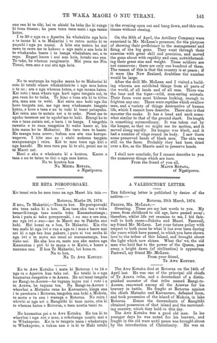 TE WAKA MAORI O NIU TIRANI. ona rau ki te tihi, hei te ahiahi ha heke iho ki runga ki tona tinana ; he pera tonu tana mahi i nga taima katoa. I te 30 o nga ra o Aperira ka whakakite nga hoia o te taone ki a te Makarini i to ratou mohio ki te pupuhi i nga pu nunui. A kite ana matou ka nui rawa te rawe me te hohoro o nga mahi a aua hoia ki te whakataka haere i te hanga whakahara nei, a te repo. Engari kaore i nui aua hoia, kotahi ano rau. Te take, he whenua rangimarie. Mei pena me Niu Tirani, tera ano e nui atu nga hoia. No te mutunga ka tapoko maua ko te Makarini Id roto ki tetahi whare whakakitekite i nga mea katoa o te ao ; ara o nga whenua katoa, o nga moana katoa. Kei roto i taua whare nga kuri ngau tangata nei, te pea raua ko to taika. Te kino o tona ata ki te titiro atu, mau ana te wehi. Kei reira ano hoki nga ika horo tangata nei, me nga mea whakamate tangata katoa, e kore e taea e au te tuhi ki tenei pakapuka. Kei reira ano te autaia nei a te neke. Penei me te upoko teretere nei te upoko me te kaki. Erangi ko te roa o taua autaia nei, e hara i te hanga. I tangohia rawatia e to raua rangatira ki waho haere ai, kia kite maua ko te Makarini. He taru tere te haere. He mangu tona arero ; huhua noa atu ona korope- wapewa. I kite ano au i etahi mahuna tangata mangumangu i reira. Kei to mau tonu nga kiri o nga kanohi. He mea rara pea ki te ahi, penei me ta te Maori nei. Heoi o aku e whakaatu ki a koutou. Kaore e taea e au te tatau te tini o nga mea katoa. Na to koutou hoa NA MEIHA ROPATA, o Ngatiporou. HE RETA POROPOROAKI. Ko tenei reta he mea tono na nga Maori kia taia:— Rotorua, Maehe 28, 1874. E HOA, Te Makarini,—Tena ra koe. He poroporoaki atu tena naku ki a koe. Kua taea oku tau o toku tamarikitanga taea noatia toku Kaumatuatanga; koia i puta ai taku poroporoaki, i au ano e ora ana, mo nga iwi e rua—mo te Maori mo te Pakeha ano hoki. Hei konei ra e hoa, Te Makarini. Kia rite tau mahi ki nga iwi e rua a nga ra i mua e haere mai nei ki o nga tau kua pahure, i puta ai tou aroha ki nga iwi o te motu mo tenei ao maramatanga, kua tiaho nei. He aha koa ra, mate noa ake matou nga Kaumatua i piri ki te mana o te Kuini, e haere a marama ana. E hoa Te Makarini, hei kona ra. Na to hoa, Na Te AWE KOTUKU. Ko te Awe Kotuku i mate ki Rotorua i te 14 o nga ra o Aperira kua taha nei. Ko tetehi ia o nga kaumatua rangatira o te Arawa. He uri tenei tangata no Rangi-te-Aorere—he tupuna ingoa nui i roto i a te Arawa, he tupuna toa. Na Rangi-te-Aorere i whawhai a Mataaho raua ko Kawaarero, hinga ana i te parekura i Rotorua, tangohia ana hoki a Mokoia, te motu e tu ana i waenga o Rotorua. No reira i whiwhi ai nga uri o Rangitihi ki taua motu, otia ki te whenua katoa o Rotorua, a taea noatia tenei ra. He kaumatua pai a te Awe Kotuku. He toa ki te whawhai i nga riri o mua, a rokohanga noatia mai e te Whakapono. Ko ia te tangata nana i whakatupu te Whakapono, a tukua ana e ia ki te Hahi tetahi in the evening open out and hang down, and this con- tinues without ceasing. On the 30th of April, the Artillery Company were exercised in Mr. McLean's presence, for the purpose of showing their proficiency in the management and firing of the big guns. They went through their exercise with great skill and precision, and moved the guns about with rapidity and case, notwithstand- ing their great size and weight. These soldiers are not numerous ; there are only one hundred of them. The reason of this is that the country is at peace ; if it were like New Zealand, doubtless the number would be large. After the drill Mr. McLean and I visited a build- ing wherein are exhibited things from all parts of the world, of all lands and of all seas. There was the bear and the tiger—wild, man-eating animals. Their faces were most hideous looking, enough to frighten any ono. There were reptiles which swallow men, and a variety of things destructive of human life, which I cannot here describe. There also is that monster the snake. It has a head and neck some- what similar to that of the ground shark. Its length is something extraordinary. It was taken out by the keeper, so that wo might see its motion, and it moved along rapidly. Its tongue was black, and it had a number of rings round its body. I saw there some preserved heads of black men. The skin was still on the faces. Probably they had been dried over a fire, as the Maoris used to preserve heads. I shall now conclude, for I cannot describe to you the numerous things which are here. From the friend of you all, MAJOR ROPATA, of Ngatiporou. A VALEDICTORY LETTER. THE following letter is published by desire of the natives :— Rotorua, 28th March, 1874. FRIEND, ME. MCLEAN,— Greeting. These are my last words to you. My years, from childhood to old age, have passed away ; therefore, whilst life yet remains to me, I bid fare- well to both races—Pakeha and Maori. Farewell, my friend Mr. McLean. Let your future policy with respect to both races be what it has ever been during the years which have passed, in which you have shown love to the tribes of this Island, and brought about the light which now shines. What the' we, the old men who held fast to the power of the Queen, pass away, a bright dawn (of civilization) is appearing. Farewell, my friend Mr. McLean. From your friend, TE AWE KOTUKU. The Awe Kotuku died at Rotorua on the 14th of April last. He was one of the principal old chiefs of Te Arawa tribe, and a descendant of a distin- guished ancestor of that tribe named Rangi-te- Aorere, renowned among all the Arawas for hia bravery in battle. He fought at Rotorua against the chiefs Mataaho and Kawaarero, defeated them, and took possession of the island of Mokoia, in lake Rotorua. Hence the descendants of Rangitihi obtained possession of that island and the surround- ing country, which they hold to this day. The Awe Kotuku was a good old man. In his younger days he was noted for his bravery, and fought in the old wars until peace was brought about by the introduction of Christi
