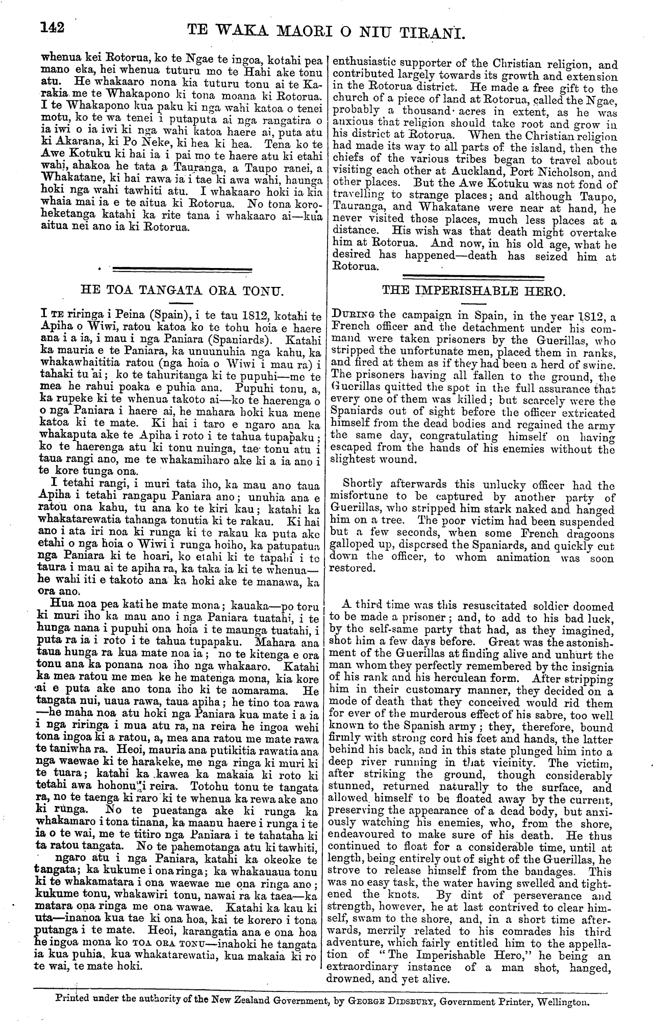 142 TE WAKA MAORI O NIU TIRANI whenua kei Rotorua, ko te Ngae te ingoa, kotahi pea mano eka, hei whenua tuturu. mo te Hahi ake tonu atu. He whakaaro nona kia tuturu tonu ai te Ka- rakia me te Whakapono ki tona moana ki Rotorua. I te Whakapono kua paku ki nga wahi katoa o tenei motu, ko te wa tenei i putaputa ai nga rangatira o ia iwi o ia iwi ki nga wahi katoa haere ai, puta atu ki Akarana, ki Po Neke, ki hea ki hea. Tena ko te Awe Kotuku ki hai ia i pai mo te haere atu ki etahi wahi, ahakoa he tata ; Tauranga, a Taupo ranei, a Whakatane, ki hai rawa ia i tae ki awa wahi, haunga hoki nga wahi tawhiti atu. I whakaaro hoki ia kia whaia mai ia e te aitua ki Rotorua. No tona kore- heketanga katahi ka rite tana i whakaaro ai—kua aitua nei ano ia ki Rotorua. HE TOA TANGATA OEA TONU. I TE riringa i Peina (Spain), i te tau 1812, kotahi te Apiha o Wiwi, ratou katoa ko te tohu hoia e haere ana i a ia, i mau i nga Paniara (Spaniards). Katahi ka mauria e te Paniara, ka unuunuhia nga kahu, ka whakawhaititia ratou (nga hoia o Wiwi i mau ra) i tahaki tu ai; ko te tahuritanga ki te pupuhi—me te mea he rahui poaka e puhia ana. Pupuhi tonu, a, ka rupeke ki te whenua takoto ai—ko te haerenga o o nga Paniara i haere ai, he mahara hoki kua mene katoa ki te mate. Ki hai i taro e ngaro ana ka whakaputa ake te Apiha i roto i te tahua tupapaku ; ko te haerenga atu ki tonu nuinga, tae tonu atu i taua rangi ano, me te whakamiharo ake ki a ia ano i te kore tunga ona. I tetahi rangi, i muri tata iho, ka mau ano taua Apiha i tetahi rangapu Paniara ano; unuhia ana e ratou ona kahu, tu ana ko te kiri kau; katahi ka whakatarewatia tahanga tonutia ki te rakau. Ki hai ano i ata iri noa ki runga ki te rakau ka puta ake etahi o nga hoia o Wiwi i runga hoiho, ka patupatua nga Paniara ki te hoari, ko etahi ki te tapahi i to taura i mau ai te apiha ra, ka taka ia ki te whenua— he wahi iti e takoto ana ka hoki ake te manawa, ka ora ano. Hua noa pea kati he mate mona; kauaka—po toru ki muri iho ka mau ano i nga Paniara tuatahi, i te hunga nana i pupuhi ona hoia i te maunga tuatahi, i puta ra ia i roto i te tahua tupapaku. Mahara ana taua hunga ra kua mate noa ia ; no te kitenga e ora tonu ana ka ponana noa iho nga whakaaro. Katahi ka mea ratou me mea ke he matenga mona, kia kore •ai e puta ake ano tona iho ki te aomarama. He tangata nui, uaua rawa, taua apiha; he tino toa rawa he maha noa atu hoki nga Paniara kua mate i a ia i nga riringa i mua atu ra, na reira he ingoa wehi tona ingoa ki a ratou, a, mea ana ratou me mate rawa te taniwha ra. Heoi, mauria ana putikitia rawatia ana nga waewae ki te harakeke, me nga ringa ki muri ki te tuara; katahi ka kawea ka makaia ki roto ki tetahi awa hohonu i reira. Totohu tonu te tangata ra, no te taenga ki raro ki te whenua ka rewa ake ano ki runga. No te pueatanga ake ki runga ka whakamaro i tona tinana, ka maanu haere i runga i te ia o te wai, me te titiro nga Paniara i te tahataha ki ta ratou tangata. No te pahemotanga atu ki tawhiti, ngaro atu i nga Paniara, katahi ka okeoke te tangata; ka kukume i ona ringa; ka whakauaua tonu ki te whakamatara i ona waewae me ona ringa ano ; kukume tonu, whakawiri tonu, nawai ra ka taea—ka matara ona ringa me ona wawae. Katahi ka kau ki uta—inanoa kua tae ki ona hoa, kai te korero i tona putanga i te mate. Heoi, karangatia ana e ona hoa he ingoa mona ko TOA OKA TONU—inahoki he tangata ia kua puhia, kua whakatarewatia, kua makaia ki ro te wai, te mate hoki. enthusiastic supporter of the Christian religion, and contributed largely towards its growth and extension in the Rotorua district. He made a free gift to the church of a piece of land at Rotorua, called the Ngae, probably a thousand acres in extent, as he was anxious that religion should take root and grow in his district. at Rotorua. When the Christian religion had made its way to all parts of the island, then the chiefs of the various tribes began to travel about visiting each other at Auckland, Port Nicholson, and other places. But the Awe Kotuku was not fond of travelling- to strange places; and although Taupo, Tauranga, and Whakatane were near at hand, he never visited those places, much less places at a distance. His wish was that death might overtake him at Rotorua. And now, in his old age, what he desired has happened—death has seized him at Rotorua. THE IMPERISHABLE HERO. DURING the campaign in Spain, in the year 1812, a French officer and the detachment under his com- mand were taken prisoners by the Guerillas, who stripped the unfortunate men, placed them in ranks, and fired at them as if they had been a herd of swine. The prisoners having all fallen to the ground, the Guerillas quitted the spot in the full assurance that every one of them was killed; but scarcely were the Spaniards out of sight before the officer extricated himself from the dead bodies and regained the army the same day, congratulating himself on having escaped from the hands of his enemies without the slightest wound. Shortly afterwards this unlucky officer had the misfortune to be captured by another party of Guerillas, who stripped him stark naked and hanged him on a tree. The poor victim had been suspended but a few seconds, when some French dragoons galloped up, dispersed the Spaniards, and quickly cut down the officer, to whom animation was soon restored. A third time was this resuscitated soldier doomed to be made a prisoner ; and, to add to his bad luck, by the self-same party that had, as they imagined, shot him a few days before. Great was the astonish- ment of the Guerillas at finding alive and unhurt the man whom they perfectly remembered by the insignia of his rank and his herculean form. After stripping him in their customary manner, they decided on a mode of death that they conceived would rid them for ever of the murderous effect of his sabre, too well known to the Spanish army ; they, therefore, bound firmly with strong cord his feet and hands, the latter behind his back, and in this 