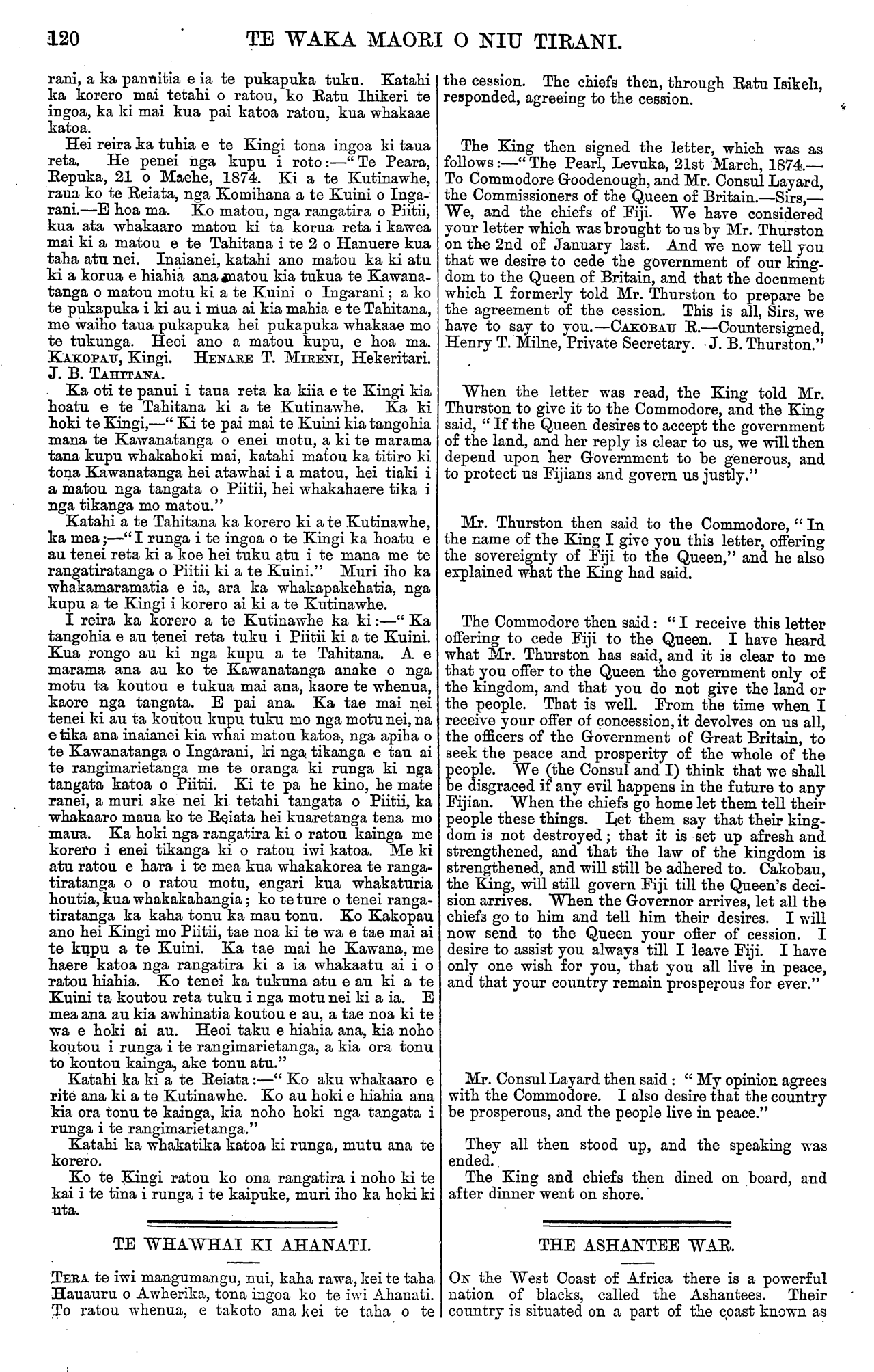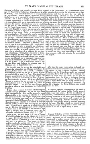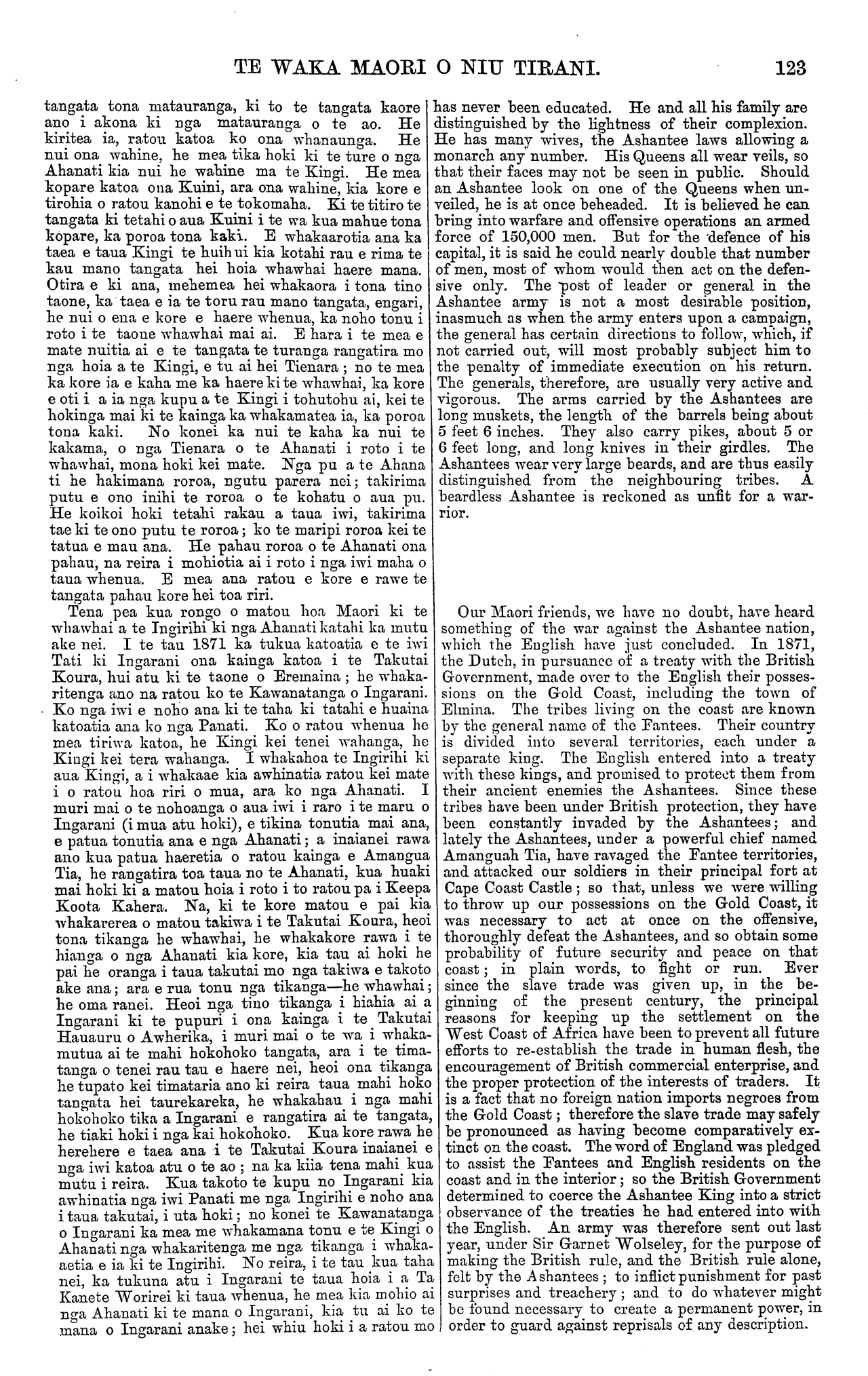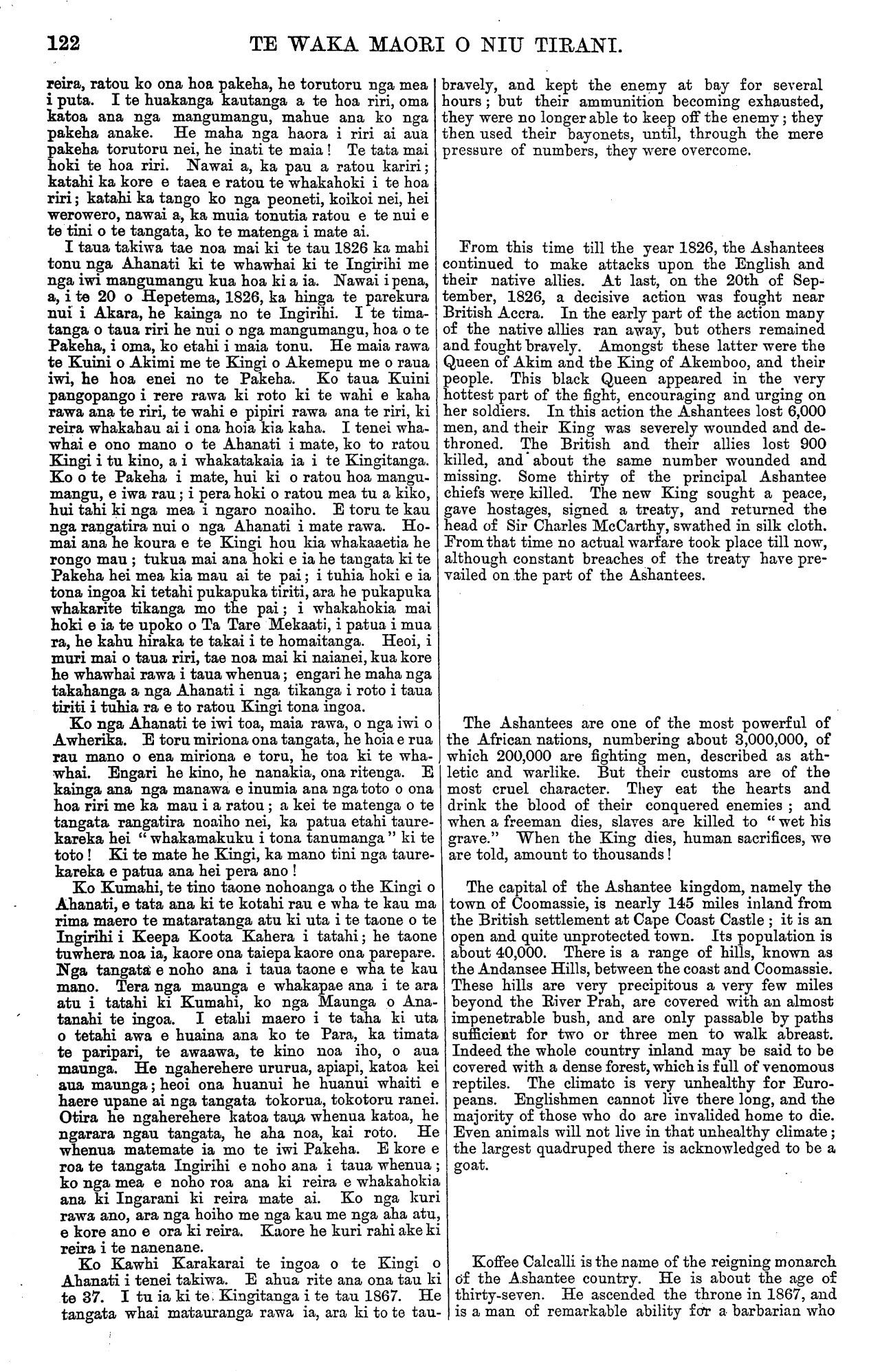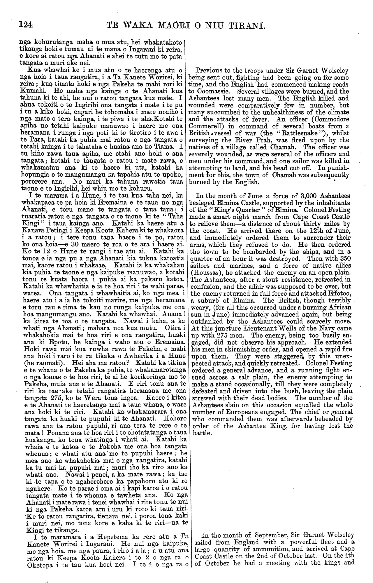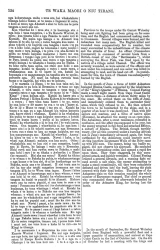 TE WAKA MAORI O NIU TIRANI. 125 Oketopa ka huihui nga rangatira me nga Kingi o nga iwi Panati ki te whakarongo ki ana korero, ki a te Worirei. Tana kupu ki a ratou, ko te aruaru atu ia i nga Ahanati i o ratou kainga i te tuatahi, muri iho ka kawea e ia te whawhai ki roto ki nga rohe o te Ahanati. Ka ki hoki ia ko nga pa hoia a te Kuini e pineke haere ana te tu i tatahi e kore rawa e taea e te taua, ahakoa tini noa te tangata hei tiki mai, a mehemea ka puritia e te Kuini ona hoia ki roto ki aua pa noho ai, tona mutunga ka matemate katoa nga iwi Panati i nga Ahanati. Na, mo ratou te take i uru ai te Ingirihi ki roto ki aua raruraru, he mea kia whiwhi ai ratou ki nga pai o te maramatanga, kia noho ai hoki ratou i runga i te rangimarietanga me te ngakau hari. No reira ia ka mea he mea tika kia puta rawa to ratou kaha hei whakaora i a ratou ake ano hoki. I ki ia kia whakaaturia e ratou ki a ia te tokomahatanga o a ratou tangata e taea ai e ratou te tuku mai ki roto ki te whawhai, a ma te Kuini te kai ma ratou e hoatu. Ka timata te whawhai e kore rawa ia e pai ki te tangata haua, wehi, i roto i te riri; me whakarongo pu hoki te katoa ki ana tohutohu, e kore rawa ia e pai kia taringa-turitia tetahi o ana kupu, paku noa nei; ki te kore e pera e kore hoki e taea e ia, te whakahaere i te whawhai kia ata taea tona tutukitanga. Tetahi, kua pouri rawa te Kuini i tona rongonga ko etahi o nga iwi e hoa ana ki te Pakeha kua whai ki te tikanga kohuru kino, nanakia rawa, a nga Ahanati, ara te tapatapahi i nga mea kua mate me te whakamate kau i nga herehere. E kore ia e pai ki tena; a ki te tohe tonu ratou ki aua tu mahi kino, mahi kohuru, he wehenga tena i te whakaaro pai o te Ingirihi ki a ratou. Na, i muri i tena, ka arumia ka whakahokia nga Ahanati, ka whakaritea nga tikanga mo te haere ki Kumahi, te tino taone o te Ahanati. A i te tahi o Hanuere kua hori nei ka tae atu a Tienara Worirei me ona hoia ki te awa ki te Para. Kua kotahi pea to ratou haora ki reira ka tae mai nga tangata a te Kingi o Ahanati, he kawe mai i nga reta a te Kingi, he tono kia houhia te rongo. Ka ki atu a Ta Kanete Worirei ki a ratou, kia tae rawa ia ki Kumahi hei reira ia korero ai ki a te Kingi ake ano, katahi ka hoki aua tangata. I te 5 o nga ra o Hanuere ka tae ake te matua a nga heramana, ka whakawhiti i te Para. E kore e taea e matou te korero i te haerenga ki Kumahi me nga parekura i te ara, he inati rawa etahi o aua parekura. Kati nei he korero ko tenei, ahakoa te kino o te whenua, te whawhai a te hoa riri, me te matemate o te tangata i nga mate o tera whenua, ahakoa enei mea, i te 4 o nga ra o Pepuere kua tae atu te Pakeha ki Kumahi, kua riro hoki te taone. Kua rima nga ra i whawhai ai a Tienara Worirei ka taea te taone—he inati rawa te whawhai, he kaha rawa. Ko te Kingi i whati atu ki tahaki tata noho mai ai. Ko tona kupu i tukua mai, hei te 5 o nga ra ka haere mai ia ki Kumahi ki te tuhituhi i tona ingoa ki te tiriti mo te houanga rongo—ara he pukapuka whakatakoto tikanga e mau ai te rongo. Otira ki hai i tae mai; kaore ia i kitea e Tienara Worirei kia whakaritea atu he tikanga mo te mau o te rongo. Nawai a, ka tahuna e ia, e te Worirei, te taone o Kumahi, he whawhai ki te hoki mai, kua tata rawa hoki ki te takiwa ua. Tona hanga o te takiwa ua ki Awherika., he maringi tonu mai, e kore e mutu-; mutu, ngaro katoa ana te whenua i te wai. He nui ano nga hoia i waiho marire ki muri hei tiaki i te kainga, ko Kapene Karawa to ratou rangatira. Ko nga korero o taua riri i tae mai ki muri nei, o ki ana kua whakarerea e nga Ahanati a ratou pu, ko te Kingi kua tuhituhi i tona ingoa ki te pukapuka whakatakoto tikanga e houhia ai te rongo, kua wha- kaae hoki ia kia homai ki te Ingirihi kia rua rau mano pauna mo ona hara—ko etahi o aua moni kua chiefs of the Fantee tribes. He told them that it was his intention first to drive the Ashantees out of their territories, and then to carry the war into the Ashantee country. He said the line of forts which Her Majesty holds along the coast were so strong as to be able to bid defiance to any force whatever, and that were Her Majesty to keep her troops within her forts, the result would be the entire destruction of the Fantees by the Ashantees, and that therefore it was in their interest only that the English intervened in those disputes, to enable them to enjoy the bless- ings of civilization, and to live in peace and happi- ness. It was, therefore, he said, for them to do the best they could for their own preservation. He desired them to state what force each of them could place in the field, and Her Majesty would supply them with provisions. Once in the field, he would have no flinching, and there must be throughout the most prompt and absolute obedience to his orders, without which it would be impossible for him to carry on the war successfully. Her Majesty, he said, had learned with pain that her allies had in some cases imitated the ferocity of the Ashantees, by mutilating the dead and murdering prisoners. This he would not allow; any recurrence of such fero- cious conduct would quite alienate the good-will of the English. After this the enemy were driven back, and pre- parations were made for an advance upon Coomassie, the capital of the Ashantee kingdom. General Wolseley and the British forces under his command reached the River Prah on the 1st of January last. About an hour after his arrival, he was met by ambassadors from the King of Ashantee, bearing letters asking for peace. Sir Garnet Wolseley said that he would treat with the King himself at Coo- massie, whereupon the ambassadors returned. On the 5th of January the Naval Brigade came up and crossed the Prah. We cannot here give a description of the march to Coomassie and the various battles fought, some of which were very severe. It will be sufficient to say that, notwithstanding the inaccessibility of the country, opposition of the enemy, and sickness of the men, Coomassie was reached and occupied on the 4th day of Februar