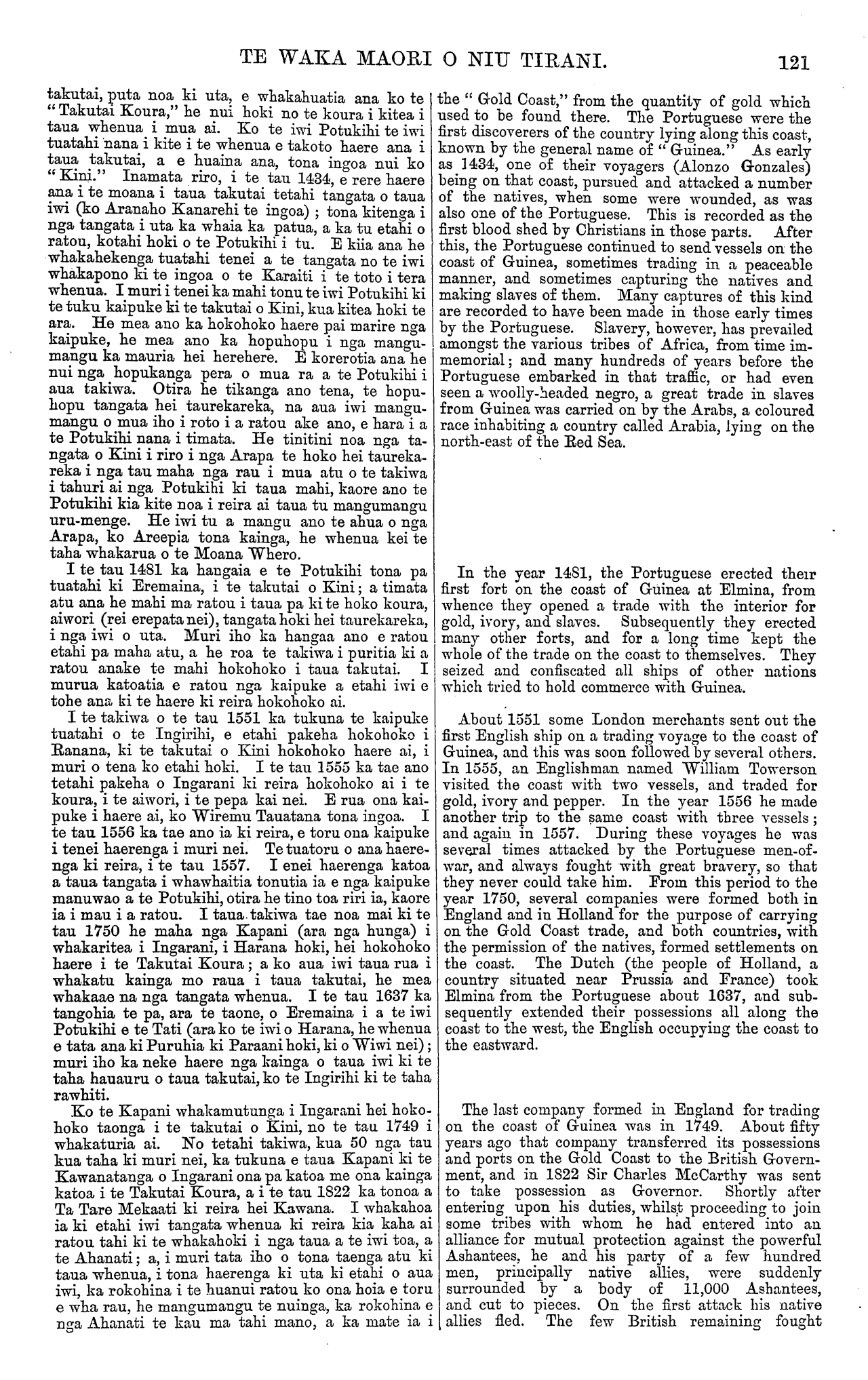 TE WAKA MAORI O NIU TIRANI. 121 takutai, puta noa ki uta, e whakahuatia ana ko te I " Takutai Koura," he nui hoki no te koura i kitea i taua whenua i mua ai. Ko te iwi Potukihi te iwi tuatahi nana i kite i te whenua e takoto haere ana i taua takutai, a e huaina ana, tona ingoa nui ko "Kini." Inamata riro, i te tau 1434, e rere haere ana i te moana i taua takutai tetahi tangata o taua iwi (ko Aranaho Kanarehi te ingoa) ; tona kitenga i nga tangata i uta ka whaia ka patua, a ka tu etahi o ratou, kotahi hoki o te Potukihi i tu. E kiia ana he whakahekenga tuatahi tenei a te tangata no te iwi whakapono ki te ingoa o te Karaiti i te toto i tera whenua. I muri i tenei ka mahi tonu te iwi Potukihi ki te tuku kaipuke ki te takutai o Kini, kua kitea hoki te ara. He mea ano ka hokohoko haere pai marire nga kaipuke, he mea ano ka hopuhopu i nga mangu- mangu ka mauria hei herehere. E korerotia ana he nui nga hopukanga pera o mua ra a te Potukihi i aua takiwa. Otira he tikanga ano tena, te hopu- hopu tangata hei taurekareka, na aua iwi mangu- mangu o mua iho i roto i a ratou ake ano, e hara i a te Potukihi nana i timata. He tinitini noa nga ta- ngata o Kini i riro i nga Arapa te hoko hei taureka- reka i nga tau maha nga rau i mua atu o te takiwa i tahuri ai nga Potukihi ki taua mahi, kaore ano te Potukihi kia kite noa i reira ai taua tu mangumangu uru-menge. He iwi tu a mangu ano te ahua o nga Arapa, ko Areepia tona kainga, he whenua kei te taha whakama o te Moana Whero. I te tau 1481 ka hangaia e te Potukihi tona pa tuatahi ki Eremaina, i te takutai o Kini; a timata atu ana he mahi ma ratou i taua pa ki te hoko koura, aiwori (rei erepata nei), tangata hoki hei taurekareka, i nga iwi o uta. Muri iho ka hangaa ano e ratou etahi pa maha atu, a he roa te takiwa i puritia ki a ratou anake te mahi hokohoko i taua takutai. I murua katoatia e ratou nga kaipuke a etahi iwi e tohe ana ki te haere ki reira hokohoko ai. I te takiwa o te tau 1551 ka tukuna te kaipuke tuatahi o te Ingirihi, e etahi pakeha hokohoko i Ranana, ki te takutai o Kini hokohoko haere ai, i muri o tena ko etahi hoki. I te tau 1555 ka tae ano tetahi pakeha o Ingarani ki reira hokohoko ai i te koura, i te aiwori, i te pepa kai nei. E rua ona kai- puke i haere ai, ko Wiremu Tauatana tona ingoa. I te tau 1556 ka tae ano ia ki reira, e toru ona kaipuke i tenei haerenga i muri nei. Te tuatoru o ana haere- nga ki reira, i te tau 1557. I enei haerenga katoa a taua tangata i whawhaitia tonutia ia e nga kaipuke manuwao a te Potukihi, otira he tino toa riri ia, kaore ia i mau i a ratou. I taua. takiwa tae noa mai ki te tau 1750 he maha nga Kapani (ara nga hunga) i whakaritea i Ingarani, i Harana hoki, hei hokohoko haere i te Takutai Koura; a ko aua iwi taua rua i whakatu kainga mo raua i taua takutai, he mea whakaae na nga tangata whenua. I te tau 1637 ka tangohia te pa, ara te taone, o Eremaina i a te iwi Potukihi e te Tati (ara ko te iwi o Harana, he whenua e tata ana ki Puruhia ki Paraani hoki, ki o Wiwi nei); muri iho ka neke haere nga kainga o taua iwi ki te taha hauauru o taua takutai, ko te Ingirihi ki te taha rawhiti. Ko te Kapani whakamutunga i Ingarani hei hoko- hoko taonga i te takutai o Kini, no te tau 1749 i whakaturia ai. No tetahi takiwa, kua 50 nga tau kua taha ki muri nei, ka tukuna e taua Kapani ki te Kawanatanga o Ingarani ona pa katoa me ona kainga katoa i te Takutai Koura, a i te tau 1822 ka tonoa a Ta Tare Mekaati ki reira hei Kawana. I whakahoa ia ki etahi iwi tangata whenua ki reira kia kaha ai ratou tahi ki te whakahoki i nga taua a te iwi toa, a te Ahanati; a, i muri tata iho o tona taenga atu ki taua whenua, i tona haerenga ki uta ki etahi o aua iwi, ka rokohina i te huanui ratou ko ona hoia e toru e wha rau, he mangumangu te nuinga, ka rokohina e nga Ahanati te kau ma tahi mano, a ka mate ia i the " Gold Coast," from the quantity of gold which used to be found there. The Portuguese were the first discoverers of the country lying along this coast, known by the general name of " Guinea." As early as 1434, one of their voyagers (Alonzo Gonzales) being on that coast, pursued and attacked a number of the natives, when some were wounded, as was also one of the Portuguese. This is recorded as the first blood shed by Christians in those parts. After this, the Portuguese continued to send vessels on the coast of Guinea, sometimes trading in a peaceable manner, and sometimes capturing the natives and making slaves of them. Many captures of this kind are recorded to have been made in those early times by the Portuguese. Slavery, however, has prevailed amongst the various tribes of Africa, from time im- memorial; and many hundreds of years before the Portuguese embarked in that traffic, or had even seen a woolly-headed negro, a great trade in slaves from Guinea was carried on by the Arabs, a coloured race inhabiting a country called Arabia, lying on the north-east of the Red Sea. In the year 1481, the Portuguese erected their first fort on the coast of Guinea at Elmina, from whence they opened a trade with the interior for gold, ivory, and slaves. Subsequently they erected many other forts, and for a long time kept the whole of the trade on the coast to themselves. They seized and confiscated all ships of other nations which tried to hold commerce with Guinea. About 1551 some London merchants sent out the first English ship on a trading voyage to the coast of Guinea, and this was soon followed by several others. In 1555, an Englishman named William Towerson visited the coast with two vessels, and traded for gold, ivory and pepper. In the year 1556 he made another trip to the same coast with three vessels ; and again in 1557. During these voyages he was several times attacked by the Portuguese men-of- war, and always fought with great bravery, so that they never could take him. From this period to the year 1750, several companies were formed both in England and in Holland for the purpose of carrying on the Gold Coast trade, and both co