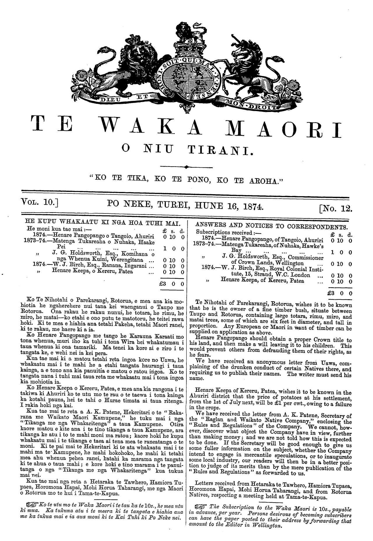 Te Waka Maori o Niu Tirani 1871-1877: Volume 10, Number 12. 16 June 1874 |