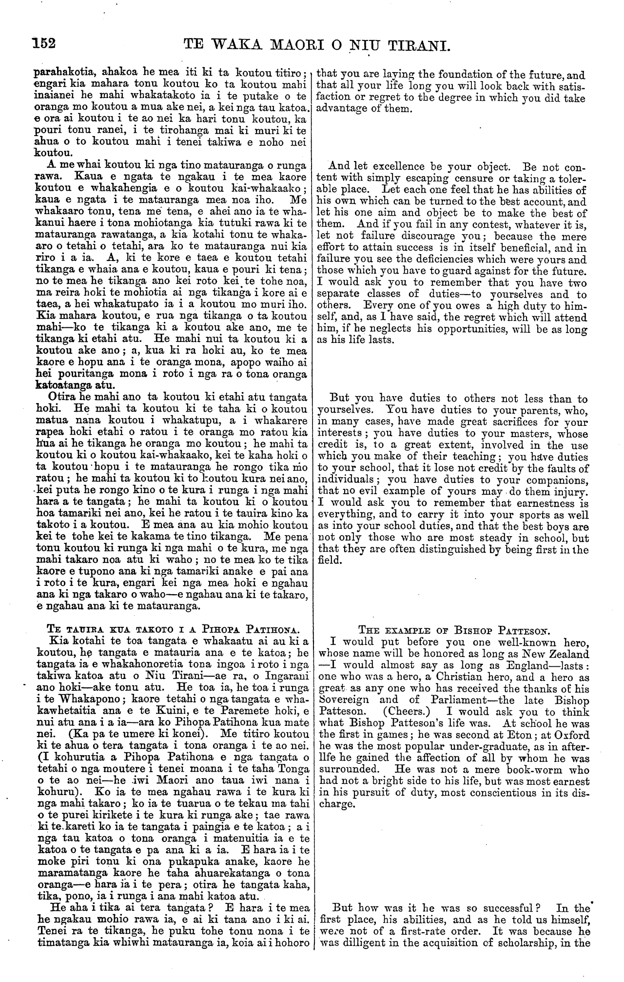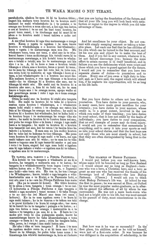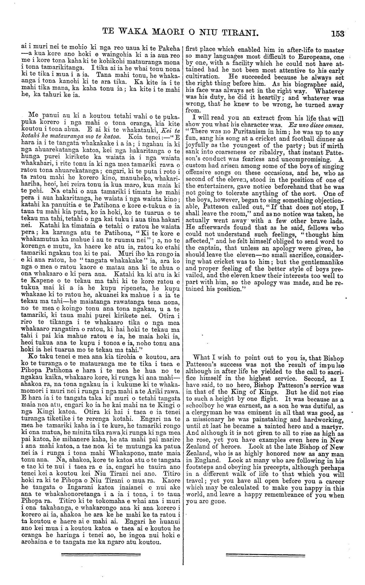 TE WAKA MAORI O NIU TIRANI. 153 ai i muri nei te mohio ki nga reo uaua ki te Pakeha —a kua kore ano hoki e waingohia ki a ia aua reo me i kore tona kahaki te kohikohi matauranga mona i tona tamarikitanga. I tika ai ia he whai tonu nona ki te tika i mua i a ia. Tana mahi tonu, he whaka- anga i tona kanohi ki te ara tika. Ka kite ia i te mahi tika mana, ka kaha tonu ia ; ka kite i te mahi he, ka tahuri ke ia. Me pa.nui au ki a koutou tetahi wahi o te puka- puka korero i nga mahi o tona oranga, kia kite koutou i toua ahua. E ai ki te whakatauki, Kei te kotahi he matauranga mo te katoa. Koia tenei:—" E hara ia i te tangata whakakake i a ia; i ngahau ia ki nga ahuarekatanga katoa, kei nga hakaritanga o te hunga purei kirikete ka waiata ia i nga waiata I whakahari, i rito tonu ia ki nga mea tamariki rawa o ratou tona ahuarekatanga; engari, ki te puta i roto i ta ratou mahi he korero kino, manuheko, whakari- hariha, heoi, hei reira tonu ia kua maro, kua maia ki te pehi. Na etahi o aua tamariki i timata he mahi pera i aua hakaritanga, he waiata i nga waiata kino ; katahi ka panuitia e te Patihona e kore e tukua e ia taua tu mahi kia puta, ko ia hoki, ko te tuarua o te tekau ma tahi, tetahi o nga kai tuku i aua tina hakari nei. Katahi ka timataia e tetahi o ratou he waiata pera; ka karanga atu te Patihona, " Ki te kore e whakamutua ka mahue i au te mumu nei" ; a, no te korenga e mutu, ka haere ke atu ia, ratou ko etahi tamariki ngakau toa ki te pai. Muri iho ka rongo ia e ki ana ratou, he "tangata whakakake" ia, ara ko nga o mea o ratou kaore e matau ana ki te ahua o ona whakaaro e ki pera ana. Katahi ka ki atu ia ki te Kapene o te tekau ma tahi ki te kore ratou e tukua mai ki a ia he kupu ripeneta, he kupu whakaae ki to ratou he, akuanei ka mahue i a ia te tekau ma tahi—he maiatanga rawatanga tena nona, no te mea e koingo tonu ana tona ngakau, u a te tamariki, ki taua mahi purei kirikete nei. Otira i riro te tikanga i te whakaaro tika o nga mea whakaaro rangatira o ratou, ki hai hoki te tekau ma tahi i pai kia mahue ratou e ia, he maia hoki ia, heoi tukua ana te kupu i tonoa e ia, noho tonu ana hoki ia hei tuarua mo te tekau ma tahi." Ko taku tenei e mea ana kia tirohia e koutou, ara ko te turanga o te matauranga me te tika i taea e Pihopa Patihona e hara i te mea he hua no te ngakau kaika, whakaaro kore, ki runga ki ana mahi— ahakoa ra, na tona ngakau ia i kukume ki te whaka- momori i muri nei i runga i nga mahi ate Ariki rawa. E hara ia i te tangata taka ki muri o tetahi tangata maia noa atu, engari ko ia he kai mahi na te Kingi o nga Kingi katoa. Otira ki hai i taea e ia tenei turanga tiketike i te rerenga kotahi. Engari na te mea he tamariki kaha ia i te kura, he tamariki rongo ki ona matua, he minita tika rawa ki runga ki nga mea pai katoa, he mihanere kaha., he ata mahi pai marire i ana mahi katoa, a tae noa Id te mutunga ka patua nei ia i runga i tona mahi Whakapono, mate maia tonu ana. Na, ahakoa, kore te katoa atu o te tangata e tae ki te nui i taea ra e ia, engari he tauira ano tenei kei a koutou kei Niu Tirani nei ano. Titiro hoki ra ki te Pihopa o Niu Tirani o mua ra. Kaore he tangata o Ingarani katoa inaianei e nui ake ana te whakahonoretanga i a ia i tona, i to taua Pihopa ra. Titiro ki te tokomaha e whai ana i muri i ona takahanga, e whakarongo ana ki ana korero i korero ai ia, ahakoa he ara ke he mahi ke ta ratou i ta koutou e haere ai e mahi ai. Engari he huanui ano kei mua i a koutou katoa e taea ai e koutou he oranga he haringa i tenei ao, he ingoa nui hoki e arohaina e te tangata me ka ngaro atu koutou. first place which enabled him in after-life to master so many languages most difficult to Europeans, one by one, with a facility which he could not have at- tained had he not been most attentive to his early cultivation. He succeeded because he always set the right thing before him. As his biographer said, his face was always set in the right way. Whatever was his duty, he did it heartily; and whatever was wrong, that he knew to be wrong, he turned away from. I will read you an extract from his life that will show you what his character was. Ex uno disce omnes. " There was no Puritanism in him; he was up to any fun, sang his sons: at a cricket and football dinner as joyfully as the youngest of the party; but if mirth sank into coarseness or ribaldry, that instant Patte- son's conduct was fearless and uncompromising A custom had arisen among some of the boys of singing offensive songs on these occasions, and he, who as second of the eleven, stood in the position of one of the entertainers, gave notice beforehand that he was not going to tolerate anything of the sort. One of the boys, however, began to sing something objection- able, Patteson called out, " If that does not stop, I shall leave the room," and as no notice was taken, he actually went away with a few other brave lads. He afterwards found that as he said, fellows who could not understand such feelings, " thought him affected," and he felt himself obliged to send word to the captain, that unless an apology were given, he should leave the eleven—no small sacrifice, consider- ing what cricket was to him ; but the gentlemanlike and proper feeling of the better style of boys pre- vailed, and the eleven knew their interests too well to part with him, so the apology was made, and he re- tained his position." What I wish to point out to you is, that Bishop Patteson's success was not the result of impulse although in after life he yielded to the call to sacri- fice himself in the highest service. Second, as I have said, to no hero, Bishop Patteson's service was in that of the King of Kings. But he did not rise to such a height by one flight. It was because as a schoolboy he was earnest, as a son he was dutiful, as a clergyman he was eminent in all that was good, as a missionary he was painstaking and hardworking, until at last he became a sainted hero and a martyr. And although it is not given to all to rise as high