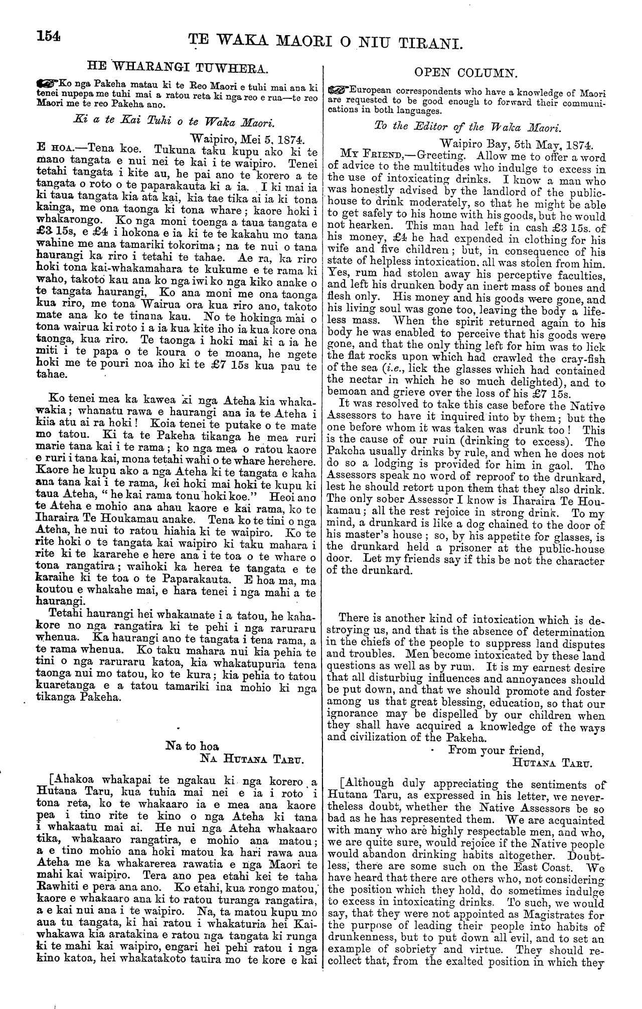 154 TE WAKA MAORI O NIU TIRANI. HE WHARANGI TUWHERA. Ko nga Pakeha matau ki te Reo Maori © tuhi mai ana ki tenei nupepa me tuhi mai a ratou reta ki nga reo e rua—te reo Maori me te reo Pakeha ano. Ki a te Kai Tuhi o te Waka Maori. Waipiro, Mei 5, 1874. E HOA.—Tena koe. Tukuna taku kupu ako ki te mano tangata e nui nei te kai i te waipiro. Tenei tetahi tangata i kite au, he pai ano te korero a te tangata o roto o te paparakauta ki a ia. I ki mai ia ki taua tangata kia ata kai, kia tae tika ai ia ki tona kainga, me ona taonga ki tona whare ; kaore hoki i whakarongo. Ko nga moni toenga a taua tangata e £3 15s, e £4 i hokona e ia ki te te kakahu mo tana wahine me ana tamariki tokorima; na te nui o tana haurangi ka riro i tetahi te tahae. Ae ra, ka riro hoki tona kai-whakamahara te kukume e te rama ki waho, takoto kau ana ko nga iwi ko nga kiko anake o te tangata haurangi, Ko ana moni me ona taonga kua riro, me tona Wairua ora kua riro ano, takoto mate ana ko te tinana kau. No te hokinga mai o tona wairua ki roto i a ia kua kite iho ia kua kore ona taonga, kua riro. Te taonga i hoki mai ki a ia he miti i te papa o te koura o te moana, he ngete hoki me te pouri noa iho ki te £7 15s kua pau te tahae. Ko tenei mea ka kawea ki nga Ateha kia whaka- wakia; whanatu rawa e haurangi ana ia te Ateha i kiia atu ai ra hoki ! Koia tenei te putake o te mate mo tatou. Ki ta te Pakeha tikanga he mea ruri mane tana kai i te rama ; ko nga mea o ratou kaore e ruri i tana kai, mona tetahi wahi o te whare herehere. Kaore he kupu ako a nga Ateha ki te tangata e kaha ana tana kai i te rama, hei hoki mai hoki te kupu ki taua Ateha, " he kai rama tonu hoki koe." Heoi ano te Ateha e mohio ana ahau kaore e kai rama, ko te Iharaira Te Houkamau anake. Tena ko te tini o nga Ateha, he nui to ratou hiahia ki te waipiro. Ko te rite hoki o te tangata kai waipiro ki taku mahara i rite ki te kararehe e here ana i te toa o te whare o tona rangatira ; waihoki ka herea te tangata e te karaihe ki te toa o te Paparakauta. E hoa ma, ma koutou e whakahe mai, e hara tenei i nga mahi a te haurangi. Tetahi haurangi hei whakamate i a tatou, he kaha- kore no nga rangatira ki te pehi i nga raruraru whenua. Ka haurangi ano te tangata i tena rama, a te rama whenua. Ko taku mahara nui kia pehia te tini o nga raruraru katoa, kia whakatupuria tena taonga nui mo tatou, ko te kura; kia pehia to tatou kuaretanga e a tatou tamariki ina mohio ki nga tikanga Pakeha. Na to hoa NA HUTANA TARU. [Ahakoa whakapai te ngakau ki nga korero a Hutana Taru, kua tuhia mai nei e ia i roto i tona reta, ko te whakaaro ia e mea ana kaore pea i tino rite te kino o nga Ateha ki tana I whakaatu mai ai. He nui nga Ateha whakaaro tika, whakaaro rangatira, e mohio ana matou; a e tino mohio ana hoki matou ka hari rawa aua Ateha me ka whakarerea rawatia e nga Maori te mahi kai waipiro. Tera ano pea etahi kei te taha Rawhiti e pera ana ano. Ko etahi, kua rongo matou, kaore e whakaaro ana ki to ratou turanga rangatira, a e kai nui ana i te waipiro. Na, ta matou kupu mo aua tu tangata, ki hai ratou i whakaturia hei Kai- whakawa kia aratakina e ratou nga tangata ki runga ki te mahi kai waipiro, engari hei pehi ratou i nga kino katoa, hei whakatakoto tauira mo te kore e kai OPEN COLUMN. European correspondents who have a knowledge of Maori are requested to be good enough to forward their communi- cations in both languages. To the Editor of the Waka Maori. Waipiro Bay, 5th May, 1874. MY FRIEND,—Greeting. Allow me to offer a word of advice to the multitudes who indulge to excess in the use of intoxicating drinks. I know a man who was honestly advised by the landlord of the public- house to drink moderately, so that he might be able to get safely to his home with his goods, but ho would not hearken. This man had left in cash £3 15s. of his money, £4 he had expended in clothing for his wife and five children ; but, in consequence of his state of helpless intoxication, all was stolen from him. Yes, rum had stolen away his perceptive faculties, and left his drunken body an inert mass of bones and flesh only. His money and his goods were gone, and his living soul was gone too, leaving the body a life- less mass. When the spirit returned again to his body he was enabled to perceive that his goods were gone, and that the only thing left for him was to lick the flat rocks upon which had crawled the cray-fish of the sea (i.e., lick the glasses which had contained the nectar in which he so much delighted), and to bemoan and grieve over the loss of his £7 15s. It was resolved to take this case before the Native Assessors to have it inquired into by them; but the one before whom it was taken was drunk too ! This is the cause of our ruin (drinking to excess). The Pakeha usually drinks by rule, and when he does not do so a lodging is provided tor him in gaol. The Assessors speak no word of reproof to the drunkard, lest he should retort upon them that they also drink. The only sober Assessor I know is Iharaira Te Hou- kamau; all the rest rejoice in strong drink. To my mind, a drunkard is like a dog chained to the door of his master's house ; so, by his appetite for glasses, is the drunkard held a prisoner at the public-house door. Let my friends say if this be not the character of the drunkard. There is another kind of intoxication which is de- stroying us, and that is the absence of determination in the chiefs of the people to suppress land disputes and troubles. Men become intoxicated by these land questions as well as by rum. It is my earnest desire that all disturbing influences and annoyances should be put down, and that we should promote and foster among us that great blessing, education, so that our ignorance may be dispelled by our children when they shall have acquired a knowledge of the ways and civilization of the Pakeha. From your friend, HUTANA TARU. [Although duly appreciating the sentiments of Hutana Taru, as expressed in his letter, we never- theless doubt, whether th