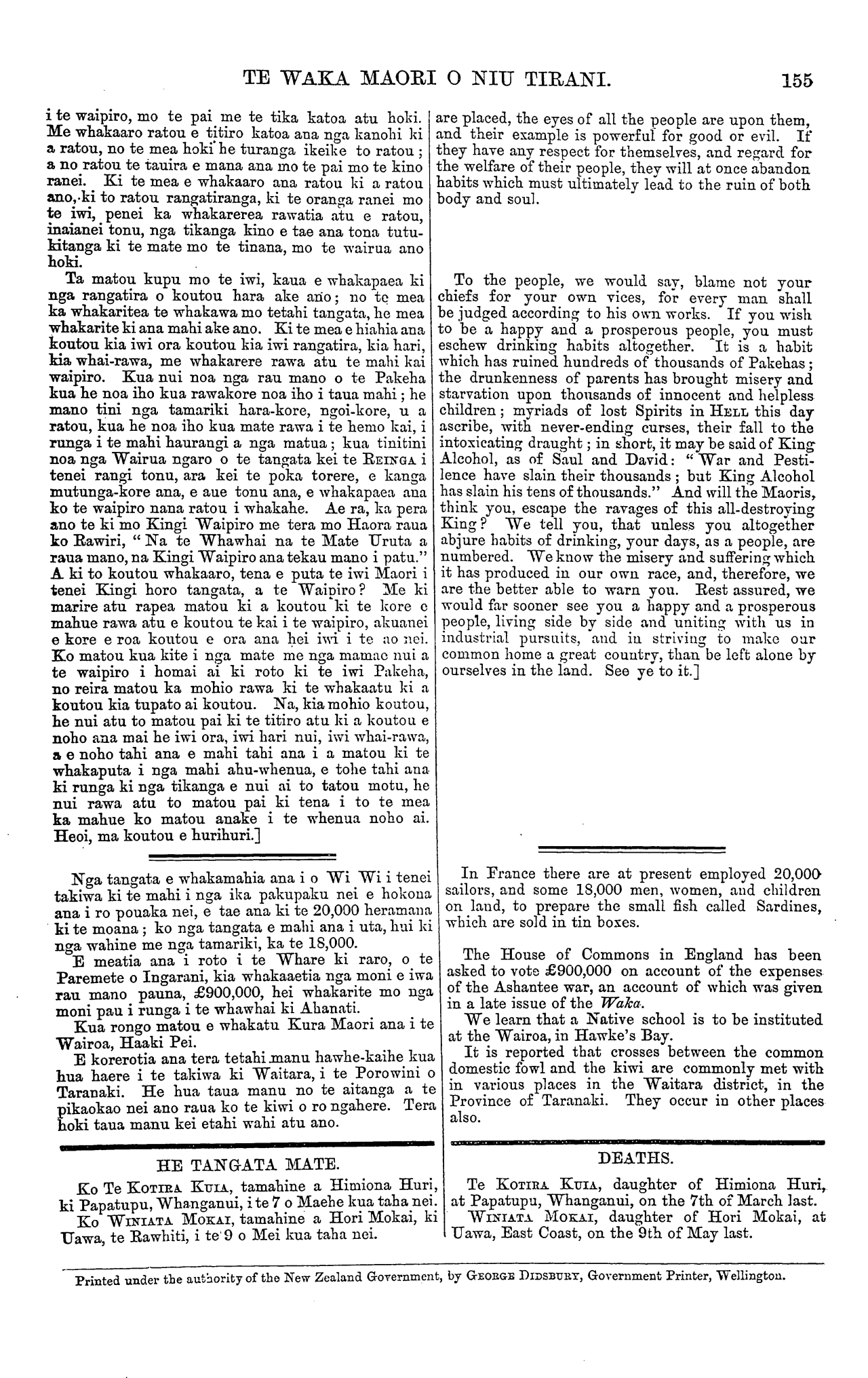 TE WAKA MAORI O NIU TIRANI. 155 i te waipiro, mo te pai me te tika katoa atu hoki. Me whakaaro ratou e titiro katoa ana nga kanohi ki a ratou, no te mea hoki he turanga ikeike to ratou ; a no ratou te tauira e mana ana mo te pai mo te kino ranei. Ki te mea e whakaaro ana ratou ki a ratou ano, ki to ratou rangatiranga, ki te oranga ranei mo te iwi, penei ka whakarerea rawatia atu e ratou, inaianei tonu, nga tikanga kino e tae ana tona tutu- kitanga ki te mate mo te tinana, mo te wairua ano hoki. Ta matou kupu mo te iwi, kaua e whakapaea ki nga rangatira o koutou hara ake ario; no to mea ka whakaritea te whakawa mo tetahi tangata, he mea whakarite ki ana mahi ake ano. Ki te mea e hiahia ana koutou kia iwi ora koutou kia iwi rangatira, kia hari, kia whai-rawa, me whakarere rawa atu te mahi kai waipiro. Kua nui noa nga rau mano o te Pakeha kua he noa iho kua rawakore noa iho i taua mahi ; he mano tini nga tamariki hara-kore, ngoi-kore, u a ratou, kua he noa iho kua mate rawa i te hemo kai, i runga i te mahi haurangi a nga matua; kua tinitini noa nga Wairua ngaro o te tanga.ta kei te REINGA i tenei rangi tonu, ara kei te poka torere, e kanga mutunga-kore ana, e aue tonu ana, e whakapaea ana ko te waipiro nana ratou i whakahe. Ae ra, ka pera ano te ki mo Kingi Waipiro me tera mo Haora raua ko Rawiri, " Na te Whawhai na te Mate Uruta a raua mano, na Kingi Waipiro ana tekau mano i patu." A ki to koutou whakaaro, tena e puta te iwi Maori i tenei Kingi horo tangata, a te Waipiro? Me ki marire atu rapea matou ki a koutou ki te kore o mahue rawa atu e koutou te kai i te waipiro, akuanei e kore e roa koutou e ora ana hei iwi i to ao nei. Ko matou kua kite i nga mate me nga mamae nui a te waipiro i homai ai ki roto ki te iwi Pakeha, no reira matou ka mohio rawa ki te whakaatu ki a koutou kia tupato ai koutou. Na, kia mohio koutou, he nui atu to matou pai ki te titiro atu ki a koutou e noho ana mai he iwi ora, iwi hari nui, iwi whai-rawa, a e noho tahi ana e mahi tahi ana i a matou ki te whakaputa i nga mahi ahu-whenua, e tohe tahi ana ki runga ki nga tikanga e nui ai to tatou motu, he nui rawa atu to matou pai ki tena i to te mea ka mahue ko matou anake i te whenua noho ai. Heoi, ma koutou e hurihuri,] Nga tangata e whakamahia ana i o Wi Wi i tenei takiwa ki te mahi i nga ika pakupaku nei e hokona ana i ro pouaka nei, e tae ana ki te 20,000 heramana ki te moana ; ko nga tangata e mahi ana i uta, hui ki nga wahine me nga tamariki, ka te 18,000. E meatia ana i roto i te Whare ki raro, o te Paremete o Ingarani, kia whakaaetia nga moni e iwa rau mano pauna, £900,000, hei whakarite mo nga moni pau i runga i te whawhai ki Ahanati. Kua rongo matou e whakatu Kura Maori ana i te Wairoa, Haaki Pei. E korerotia ana tera tetahi manu hawhe-kaihe kua hua haere i te takiwa ki Waitara, i te Porowini o Taranaki. He hua taua manu no te aitanga a te pikaokao nei ano raua ko te kiwi o ro ngahere. Tera hoki taua manu kei etahi wahi atu ano. HE TANGATA MATE. Ko Te KOTIRA. KUIA, tamahine a Himiona Hun, ki Papatupu, Whanganui, ite 7 o Maehe kua taha nei Ko WINIATA. MOKAI, tamahine a Hori Mokai, ki Uawa, te Rawhiti, i te 9 o Mei kua taha nei. are placed, the eyes of all the people are upon them, and their example is powerful for good or evil. If they have any respect for themselves, and regard for the welfare of their people, they will at once abandon habits which must ultimately lead to the ruin of both body and soul. To the people, we would say, blame not your- chiefs for your own vices, for every man shall be judged according to his own works. If you wish to be a happy and a prosperous people, you must eschew drinking habits altogether. It is a habit which has ruined hundreds of thousands of Pakehas ; the drunkenness of parents has brought misery and starvation upon thousands of innocent and helpless children ; myriads of lost Spirits in HELL this day ascribe, with never-ending curses, their fall to the intoxicating draught; in short, it may be said of King- Alcohol, as of Saul and David: " War and Pesti- lence have slain their thousands ; but King Alcohol has slain his tens of thousands." And will the Maoris think you, escape the ravages of this all-destroying King? We tell you, that unless you altogether abjure habits of drinking, your days, as a people, are numbered. We know the misery and suffering which it has produced in our own race, and, therefore, we are the better able to warn you. Rest assured, we would far sooner see you a happy and a prosperous people, living side by side and uniting with us in industrial pursuits, and in striving to make our common home a great country, than be left alone by ourselves in the land. See ye to it.] In France there are at present employed 20,000 sailors, and some 18,000 men, women, and children on land, to prepare the small fish called Sardines, which are sold in tin boxes. The House of Commons in England has been asked to vote £900,000 on account of the expenses of the Ashantee war, an account of which was given in a late issue of the Waka. We learn that a Native school is to be instituted at the Wairoa, in Hawke's Bay. It is reported that crosses between the common domestic fowl and the kiwi are commonly met with in various places in the Waitara district, in the Province of Taranaki. They occur in other places also. DEATHS. Te KOTIRA KUIA, daughter of Himiona Huri, at Papatupu, Whanganui, on the 7th of March last. WINIATA. MOKAI, daughter of Hori Mokai, at Uawa, East Coast, on the 9th of May last. Printed under the authority of the New Zealand Government, by GEORGE DIDSBURY, Government Printer, Wellington.