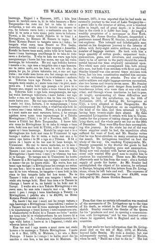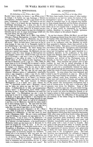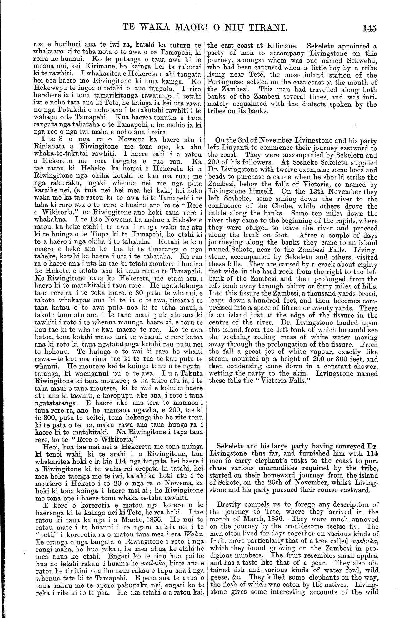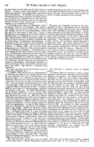 144 TE WAKA MAORI O NIU TIRANI. TAKUTA RIWINGITONE. He whakaotinga no tera Waka o Mei 5, 1874. KAORE i taea e matou te korero i era Waka e rua i te roanga o te korero mo nga haerenga o Takuta Riwingitone i Awherika i te nui o nga korero ke atu nana i whakakapi i te nupepa. Ko tenei ko era iwi ke atu i taea e ia te haere, me ona haerenga me ona oraititanga katoatanga atu, e ahua rite ana ki era kua oti ake nei te korero : a e mea ana matou e kore pea e ahuareka nga hoa Maori ki te korero roa atu mo aua mea, no konei matou ka mea kia whakapotoa katoatia mai ki roto ki tenei korerotanga kotahi nei aua mea katoa, kia awe hoki te mutu. I ki matou i tera Waka (te 5 o Mei) kua whaka- tika, atu a Takuta Riwingitone i te taone i Rinianati i a Nowema, 1853, ratou ko Hekeretu me ona ta- ngata rangatira, e haere ana ki te awa ki te Tiope hei ara mona. Heoi, ka heke ratou i taua awa ka tae ki tona huinga ki tera awa ki te Tamapehi, katahi ka hoe whakarunga i roto i taua awa tae noa ki Heheke i te 19 o nga ra o Nowema. Ko tenei kainga kua taea ano e Riwingitone i mua atu ano, a kua kore- retia ano e matou i era nupepa. Ko Hekeretu me ona tangata i noho iho i taua kainga, ko Riwingitone me ona tangata i haere tonu whaka-te-taha nota tae noa atu ki te huinga o nga awa e rua, a te Riipa me te Tamapehi, a i tae ratou ki reira i te 27 o Tihema. Katahi ratou ka ahu whaka-te-taha kapekape, a tae atu ana ki Roanata i te 31 o nga ra o Mei, 1854, he taone tena no te iwi Potukihi kei te takutai o Awhe- rika ki te taha hauauru. I haerea a waewae e ratou te roanga o te whenua, otira he roa ano te wahi i haerea i runga waka, i nga wahi ano hoki i tika te takoto o nga awa. He tini nga iwi nui nana nga whenua i haerea e ratou, a i manaakitia i atawhaitia ratou e nga rangatira o etahi o aua iwi, ko etahi i riro ke te ahua. I etahi wahi i puritia ratou, i tonoa he utu kia tukua ratou ki te haere i te whenua. Otira, te tino tikanga o te nuinga o aua iwi ki a ratou, he atawhai ano. He mate tororere to Takuta Riwingitone i a ia e haere ana i taua takiwa, he toto. I atawhaitia nuitia ratou i Roanata, i homai noa he kahu mo ratou, me nga kai hoki i ora ai ratou. I whakauwhia ki te kahu nga mangumangu katoa i haere i a Riwingitone, kaore tetahi i hapa; he hoiho te mea i homai ma Hekeretu, me etahi atu taonga hoki. I a Riwingitone ma ano i reira ka puta mai ki roto ki te wahapu etahi o nga kaipuke a te Kuini, a ka mea nga rangatira o aua kaipuke kia whakahokia a Riwingitone ma runga kaipuke ki nga kainga Pakeha ; otira kaore ia i pai ki te whakarere i ona hoa o te iwi Makororo kia hoki ko ratou anake ki to ratou kainga, kaore ia. He mea hoki kua kite ia i nga mate o te huanui, me te kino o nga iwi e noho ana i te taha ki nga rohe o te iwi Potukihi. I whakatika mai ratou i Roanata i te 20 o Hepe- tema, 1854, he hoki mai ki Rinianati, te taone o te rangatira ra, a Hekeretu; a i tae mai ratou ki taua taone i Hepetema, 1855. He nui o ratou oraititanga i nga iwi hianga o te huanui, me nga mate noa iho o tera whenua. I nui te koa o te iwi Makororo i te kainga ki te huanui kua tuwhera i a Riwingitone ma ki te takutai o te taha hauauru; a ka tonoa tonutia e Hekeretu tetahi ope kia haere ano ki Roanata ki te kawe rei erepata hei hoko ki reira. I tae ora ano taua ope ki Roanata, a i atawhaitia nuitia ratou e te Keepiriere, te Komihana o te Kawanatanga o Inga- rani i whakanohoia ki taua taone ki runga ki nga tikanga pehi i te hokohoko tangata hei herehere. I homai noa e ia he taonga ki taua ope, pera me tera homaitanga a ana i te taenga atu o Riwingitone ma ra i te tuatahi. Engari ko taua ara, kitea ana e kore e tika mo te kaata, mo te wakona. Katahi ka kimi- kimi te whakaaro me whakatuwhera he ara ki tehea wahi o te takutai rawhiti, ki tehea wahi ranei ? Ka DR. LIVINGSTONE (Concluded from THE WAKA of 5th May, 1874.) WE have been unable, from a press of other matter to continue in our last two issues the history of Dr Livingstone's travels. As the other tribes amongst which he travelled were in all respects very similar to those already described, and his further adventures in Africa of a similar character to those already re- lated, we do not consider that a lengthened descrip- tion of them would be interesting to our Maori readers, therefore we propose to briefly epitomize the whole subject in the present chapter. In our last chapter (Waka, 5th May), we said that Dr. Livingstone started from the town of Linyanti in November, 1853, with Sekeletu and his principal men, to embark on the Chobe river. They descended this river to its confluence with the Zambesi, up which they ascended to Sesheke, where they arrived on the 19th of November. This place, it will be remembered, was before visited by Dr. Livingstone, and is described in a previous chapter. Sekeletu remained at this place, and Livingstone and his party travelled in a northerly direction to the confluence of the river Leeba and Zambesi, where they arrived on the 27th of December. They then proceeded in a north-west direction, and arrived at the Portuguese town of Loanda, on the west coast of Africa, on the 31st of May, 1854. They travelled the greater part of this journey by land, but by taking advantage of the courses of the rivers, when favourable, they were en- abled to get over a considerable distance by canoe. They passed through the territories of numerous large tribes, the chiefs of which received them more or less favourably. In some places they were detained, and asked to pay for permission to pass on. But on the whole, they were treated with kindness. Dr. Living- stone suffered much from dysentery on the way. They were well received at Loanda, and gratuitously supplied with necessaries and clothing. Every one of the natives who accompanied Livingstone had a suit of clothes given to him, and a horse and other presents were given for Sekeletu. Some of Her Majesty's cruisers came into the port whilst Living- stone was there, and offered to convey him homewards; but he woul