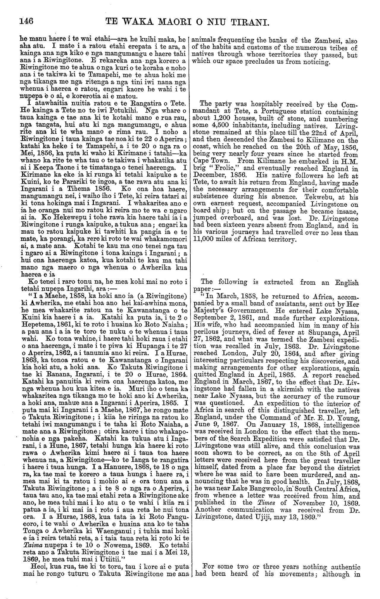 146 TE WAKA MAORI O NIU TIRANI. he manu haere i te wai etahi—ara he kuihi maka, he aha atu. I mate i a ratou etahi erepata i te ara, a kainga ana nga kiko e nga mangumangu e haere tahi ana i a Riwingitone. E rekareka ana nga korero a Riwingitone mo te ahua o nga kuri o te koraha e noho ana i te takiwa ki te Tamapehi, me te ahua hoki me nga tikanga me nga ritenga a nga tini iwi nana nga whenua i haerea e ratou, engari kaore he wahi i te nupepa e o ai, e korerotia ai e matou. I atawhaitia nuitia ratou e te Rangatira o Tete. He kainga a Tete no te iwi Potukihi. Nga whare o taua kainga e tae ana ki te kotahi mano e rua rau, nga tangata, hui atu ki nga mangumangu, e ahua rite ana ki te wha mano e rima rau. I noho a Riwingitone i taua kainga tae noa ki te 22 o Aperira; katahi ka heke i te Tamapehi, a i te 20 o nga ra o Mei, 1856, ka puta ki waho ki Kirimane i tatahi—ka whano ka rite te wha tau o te takiwa i whakatika atu ai i Keepa Taone i te timatanga o tenei haerenga. I Kirimane ka eke ia ki runga ki tetahi kaipuke a te Kuini, ko te Parariki te ingoa, a tae rawa atu ana ki Ingarani i a Tihema 1856. Ko ona hoa haere, mangumangu nei, i waiho iho i Tete, ki reira tatari ai ki tona hokinga mai i Ingarani. I whakaritea ano e ia he oranga nui mo ratou ki reira mo te wa e ngaro ai ia. Ko Hekewepu i tohe rawa kia haere tahi ia i a Riwingitone i runga kaipuke, a tukua ana; engari ka mau to ratou kaipuke ki tawhiti ka pangia ia e te mate, ka porangi, ka rere ki roto te wai whakamomori ai, a mate ana. Kotahi te kau ma ono tenei nga tau i ngaro ai a Riwingitone i tona kainga i Ingarani; a hui ona haerenga katoa, kua kotahi te kau ma tahi mano nga maero o nga whenua o Awherika kua haerea e ia Ko tenei i raro tonu na, he mea kohi mai no roto i tetahi nupepa Ingarihi, ara:— "Ia Maehe, 1858, ka hoki ano ia (a Riwingitone) ki Awherika, me etahi hoa ano hei kai-awhina mona, he mea whakarite ratou na te Kawanatanga o te Kuini kia haere i a ia. Katahi ka puta ia, i te 2 o Hepetema, 1861, ki te roto i huaina ko Roto Naiaha; a pau ana i a ia te toro te nuku o te whenua i taua wahi. Ko tona wahine, i haere tahi hoki raua i etahi o ana haerenga, i mate i te piwa ki Hupanga i te 27 o Aperira, 1862, a i tanumia ano ki reira. I a Hurae, 1863, ka tonoa ratou e te Kawanatanga o Ingarani kia hoki atu, a hoki ana. Ko Takuta Riwingitone i tae ki Ranana, Ingarani, i te 20 o Hurae, 1864. Katahi ka panuitia ki reira ona haerenga katoa, me nga whenua hou kua kitea e ia. Muri iho o tena ka whakaritea nga tikanga mo te hoki ano ki Awherika, a hoki ana, mahue ana a Ingarani i Aperira, 1865. I puta mai ki Ingarani i a Maehe, 1867, he rongo mate o Takuta Riwingitone ; i kiia he riringa na ratou ko tetahi iwi mangumangu i te taha ki Roto Naiaha, a mate ana a Riwingitone ; otira kaore i tino whakapo- nohia e nga pakeha. Katahi ka tukua atu i Inga- rani, i a Hune, 1867, tetahi hunga kia haere ki roto rawa o Awherika kimi haere ai i taua toa haere whenua na, a Riwingitone—ko te langa te rangatira i haere i taua hunga. I a Hanuere, 1868, te 18 o nga I ra, ka tae mai te korero a taua hunga i haere ra, i mea mai ki ta ratou i mohio ai e ora tonu ana a Takuta Riwingitone ; a i te 8 o nga ra o Aperira, i taua tau ano, ka tae mai etahi reta a Riwingitone ake ano, he mea tuhi mai i ko atu o te wahi i kiia ra i patua a ia, i ki mai ia i roto i aua reta he nui tona ora. I a Hurae, 1868, kua tata ia ki Roto Pangu- eoro, i te wahi o Awherika e huaina ana ko te taha Tonga o Awherika ki Waenganui; i tuhia mai hoki e ia i reira tetahi reta, a i taia taua reta ki roto ki te Taima nupepa i te 10 o Nowema, 1869. Ko tetahi reta ano a Takuta Riwingitone i tae mai i a Mei 13, 1869, he mea tuhi mai i Utiitii." Heoi, kua rua, tae ki te toru, tau i kore ai e puta mai he rongo tuturu o Takuta Riwingitone me ana animals frequenting the banks of the Zambesi, also of the habits and customs of the numerous tribes of natives through whose territories they passed, but which our space precludes us from noticing. The party was hospitably received by the Com- mandant at Tete, a Portuguese station containing about 1,200 houses, built of stone, and numbering some 4,500 inhabitants, including natives. Living- stone remained at this place till the 22nd of April, and then descended the Zambesi to Kilimane on the coast, which he reached on the 20th of May, 1856, being very nearly four years since he started from Cape Town. From Kilimane he embarked in H.M. brig " Frolic," and eventually reached England in December, 1856. His native followers he left at Tete, to await his return from England, having made the necesaary arrangements for their comfortable subsistence during his absence. Tekwebu, at his own earnest request, accompanied Livingstone on board ship ; but on the passage he became insane, jumped overboard, and was lost. Dr. Livingstone had been sixteen years absent from England, and in his various journeys had travelled over no less than 11,000 miles of African territory. The following is extracted from an English paper:— " In March, 1858, he returned to Africa, accom- panied by a small band of assistants, sent out by Her Majesty's Government. He entered Lake Nyassa, September 2, 1861, and made further explorations. His wife, who had accompanied him in many of his perilous journeys, died of fever at Shupanga, April 27, 1862, and what was termed the Zambesi expedi- tion was recalled in July, 1863. Dr. Livingstone reached London, July 20, 1864, and after giving interesting particulars respecting his discoveries, and making arrangements for other explorations, again quitted England in April, 1865. A report reached England in March, 1867, to the effect that Dr. Liv- ingstone had fallen in a skirmish with the natives near Lake Nyassa, but the accuracy of the rumour was questioned. An expedition to the interior of Africa in search of this distinguished traveller, left England, under the Command of Mr. E. D. Young, June 9, 1867. On January 18, 1868, intelligence wa