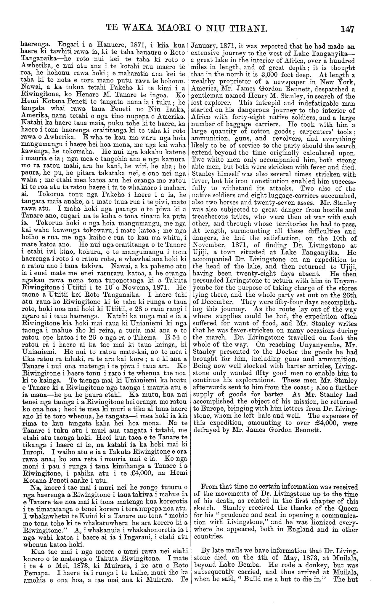 TE WAKA MAORI O NIU TIRANI. 147 haerenga. Engari i a Hanuere, 1871, i kiia kua haere ki tawhiti rawa ia, ki te taha hauauru o Roto Tanganaika—he roto nui kei te taha ki roto o Awherika, e nui atu ana i te kotahi rau maero te roa, he hohonu rawa hoki; e maharatia ana kei te taha ki te nota e toru mano putu rawa te hohonu. Nawai, a ka tukua tetahi Pakeha ki te kimi i a Riwingitone, ko Henare M. Tanare te ingoa. Ko Hemi Kotana Peneti te tangata nana ia i tuku ; he tangata whai rawa taua Peneti no Niu laaka, Amerika, nana tetahi o nga tino nupepa o Amerika. Katahi ka haere taua maia, puku tohe ki te haere, ka haere i tona haerenga oraititanga ki te taha ki roto rawa o Awherika. E wha te kau ma waru nga hoia mangumangu i haere hei hoa mona, me nga kai waha kawenga, he tokomaha. He nui nga kakahu katene i mauria e ia; nga mea e tangohia ana e nga kamura mo ta ratou mahi, ara he kani, he wiri, he aha; he paura, he pu, he pitara takataka nei, e ono nei nga waha ; me etahi mea katoa atu hei oranga mo ratou ki te roa atu ta ratou haere i ta te whakaaro i mahara ai. Tokorua tonu nga Pakeha i haere i a ia, he tangata maia anake, a i mate taua rua i te piwi, mato rawa atu. I maha hoki nga paanga o te piwa ki a Tanare ano, engari na te kaha o tona tinana ka puta ia. Tokorua hoki o nga hoia mangumangu, me nga kai waha kawenga tokowaru, i mate katoa ; me nga hoiho e rua, me nga kaihe e rua te kau ma whitu, i mate katoa a.no. He nui nga oraititanga o te Tanare i etahi iwi kino, kohuru, o te mangumangu i tona haerenga i roto i o ratou rohe, e whawhai ana hoki ki a ratou ano i taua takiwa. Nawai, a ka pahemo atu ia i enei mate me enei raruraru katoa, a he oranga ngakau rawa nona tona tuponotanga ki a Takuta Riwingitone i Utiitii i te 10 o Nowema, 1871. He taone a Utiitii kei Roto Tanganaika. I haere tahi atu raua ko Riwingitone ki te taha ki runga o taua roto, hoki noa mai hoki ki Utiitii, e 28 o raua rangi i ngaro ai i taua haerenga. Katahi ka unga mai e ia a Riwingitone kia hoki mai raua ki Unianiemi ki nga taonga i mahue iho ki reira, a turia mai ana e to ratou ope katoa i te 26 o nga ra o Tihema. E 54 o ratou ra i haere ai ka tae mai ki taua kainga, ki Unianiemi. He nui to ratou mate-kai, no te mea i tika ratou ra tahaki, ra te ara kai kore ; a e ki ana a Tanare i nui ona matenga i te piwa i taua ara. Ko Riwingitone i haere tonu i raro i te whenua tae noa ki te kainga. Te taenga mai ki Unianiemi ka hoatu e Tanare ki a Riwingitone nga taonga i mauria atu e ia mana—he pu he paura etahi. Ka mutu, kua nui tenei nga taonga i a Riwingitone hei oranga mo ratou ko ona hoa ; heoi te mea ki muri e tika ai tana haere ano ki te toro whenua, he tangata—i mea hoki ia kia rima te kau tangata kaha hei hoa mona. Na te Tanare i tuku atu i muri aua tangata i tatahi, me etahi atu taonga hoki. Heoi kua taea e te Tanare te tikanga i haere ai ia, na katahi ia ka hoki mai ki luropi. I waiho atu e ia a Takuta Riwingitone e ora rawa ana-; ko ana reta i mauria mai e ia. Ko nga moni i pau i runga i taua kimihanga a Tanare i a Riwingitone, i pahika atu i te £4,000, na Hemi Kotana Peneti anake i utu. Na, kaore i tae mai i muri nei he rongo tuturu o nga haerenga a Riwingitone i taua takiwa i mahue ia e Tanare tae noa mai ki tona matenga kua korerotia i te timatatanga o tenei korero i tera nupepa noa atu. I whakawhetai te Kuini ki a Tanare mo tona " mohio me tona tohe ki te whakatuwhera he ara korero ki a Riwingitone." A, i whakanuia i whakahonoretia ia i nga wahi katoa i haere ai ia i Ingarani, i etahi atu whenua katoa hoki. Kua tae mai i nga meera o muri rawa nei etahi korero o te matenga o Takuta Riwingitone. I mate i te 4 o Mei, 1873, ki Muirara, i ko atu o Eoto Pemapa. I haere ia i runga i te kaihe, muri iho ka amohia e ona hoa, a tae mai ana ki Muirara. Te January, 1871, it was reported that he had made an extensive journey to the west of Lake Tanganyika— a great lake in the interior of Africa, over a hundred miles in length, and of great depth ; it is thought that in the north it is 3,000 feet deep. At length a wealthy proprietor of a newspaper in New York, America, Mr. James Gordon Bennett, despatched a gentleman named Henry M. Stanley, in search of the lost explorer. This intrepid and indefatigable man started on his dangerous journey to the interior of Africa with forty-eight native soldiers, and a large number of baggage carriers. He took with him a large quantity of cotton goods; carpenters' tools ; ammunition, guns, and revolvers, and everything likely to be of service to the party should the search extend beyond the time originally calculated upon. Two white men only accompanied him, both strong able men, but both were stricken with fever and died. Stanley himself was also several times stricken with fever, hut his iron constitution enabled him success- fully to withstand its attacks. Two also of the native soldiers and eight luggage-carriers succumbed, also two horses and twenty-seven asses. Mr. Stanley was also subjected to great danger from hostile and treacherous tribes, who were then at war with each other, and through whose territories he had to pass. At length, surmounting all these difficulties and dangers, he had the satisfaction, on the 10th of November, 1871, of finding Dr. Livingstone at Ujiji, a town situated at Lake Tanganaika. He accompanied Dr. Livingstone on an expedition to the head of the lake, and then returned to Ujiji, having been twenty-eight days absent. He then persuaded Livingstone to return with him to Unyan- yembe for the purpose of taking charge of the stores lying there, and the whole party set out on the 26th. of December. They were fifty-four days accomplish- ing this journey. As the route lay out of the way where supplies could be had, the expedition often suffered for want of food, and Mr. Stanley writes that he was fever-stricken on many occasions during the march. Dr. Livingstone travelled on foot the whole of the way. On reaching Unyanyembe, Mr. Stanley presented to the Doct