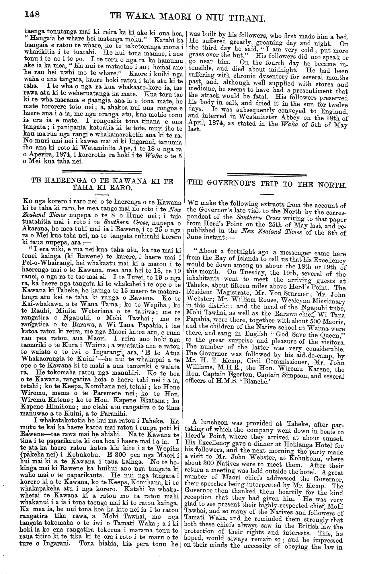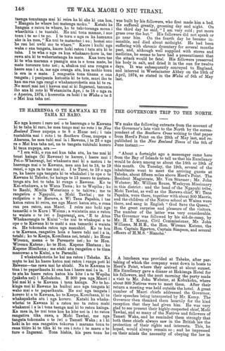 148 TE WAKA MAORI O NIU TIRANI. taenga tonutanga mai ki reira ka ki ake ki ona hoa, " Hangaia he whare hei matenga moku." Katahi ka hangaia e ratou te whare, ko te takotoranga mona i wharikitia i te tuatahi. He nui tona mamae, i aue tonu i te ao i te po. I te toru o nga ra ka hamumu ake ia ka mea, " Ka nui te mataotao i au; homai ano he rau hei uwhi mo te whare." Kaore i kuihi nga waha o ana tangata, kaore hoki ratou i tata atu ki te taha. I te wha o nga ra kua whakaaro-kore ia, tae rawa atu ki te weheruatanga ka mate. Kua toru tae ki te wha marama e paangia ana ia e tona mate, he mate tororere toto nei; a, ahakoa nui ana rongoa e haere ana i a ia, me nga oranga atu, kua mohio tonu ia era ia e mate. I rongoatia tona tinana e ona tangata; i panipania katoatia ki te tote, muri iho te kau ma rua nga rangi e whakamaroketia ana ki te ra. No muri mai nei i kawea mai ai ki Ingarani, tanumia iho ana ki roto ki Wetaminita Ape, i te 18 o nga ra o Aperira, 1874, i korerotia ra hoki i te Waka o te 5 o Mei kua taha nei. TE HAERENGA O TE KAWANA KI TE TAHA KI RARO. Ko nga korero i raro nei o te haerenga o te Kawana ki te taha ki raro, he mea tango mai no roto i te New Zealand Times nupepa o te 8 o Hune nei; i taia tuatahitia mai i roto i te Southern Cross, nupepa o Akarana, he mea tuhi mai ia i Rawene, i te 25 o nga ra o Mei kua taha nei, na te tangata tuhituhi korero ki taua nupepa, ara :— " I era wiki, e rua nei kua taha atu, ka tae mai ki tenei kainga (ki Rawene) te karere, i haere mai i Pei-o-Whairangi, hei whakaatu mai ki a matou i te haerenga mai o te Kawana, mea ana hei te 18, te 19 ranei, o nga ra te tae mai ai. I te Turei, te 19 o nga ra, ka haere nga tangata ki te whakahei i te ope o te Kawana ki Taheke, he kainga te 15 maero te matara- tanga atu kei te taha ki runga o Rawene. Ko te Kai-whakawa, a te Wana Tama; ko te Wepiha ; ko te Rauhi, Minita Weteriana o te takiwa; me te rangatira o Ngapuhi, o Mohi Tawhai ; me te rangatira o te Rarawa, a Wi Tana Papania, i tae katoa ratou ki reira, me nga Maori katoa atu, e rima rau pea ratou, aua Maori. I reira ano hoki nga tamariki o te Kura i Waima; a waiatatia ana e ratou te waiata o te iwi o Ingarangi, ara, E te Atua Whakaorangia te Kuini'—he nui te whakapai a te ope o te Kawana ki te mahi a aua tamariki e waiata ra. He tokomaha ratou nga manuhiri. Ko te hoa o te Kawana, rangatira hoia e haere tahi nei i a ia, tetahi; ko te Keepa, Komihana nei, tetahi; ko Hone Wiremu, mema o te Paremete nei; ko te Hon. Wiremu Katene; ko te Hon. Kapene Ekatana ; ko Kapene Himihona; me etahi atu rangatira o te tima manuwao a te Kuini, a te Paranihi. I whakatakotoria he kai ma ratou i Taheke. Ka mutu te kai ka haer e katoa mai ratou i runga poti ki Rawene—tae rawa mai he ahiahi. Na te Kawana te tina i te paparikauta ki ona hoa i haere mai i a ia. I te ata ka haere ratou katoa kia kite i a te Wepiha (pakeha nei) i Kohukohu. E 300 pea nga Maori i hui mai ki a te Kawana i taua kainga. No te ho- kinga mai ki Rawene ka huihui ano nga tangata ki waho mai o te paparikauta. He nui nga tangata i korero ki a te Kawana, ko te Keepa, Komihana, ki te whakapakeha atu i nga korero. Katahi ka whaka- whetai te Kawana ki a ratou mo ta ratou mahi whakanui i a ia i tona taenga mai ki to ratou kainga. Ka mea ia, he nui tona koa ka kite nei ia i to ratou rangatira tika rawa, a Mohi Tawhai, me nga tangata tokomaha o te iwi o Tamati Waka; a i ki hoki ia ko ena rangatira tokorua i marama tonu to raua titiro ki te tika ki te ora i roto i te maru o te tare o Ingarani. Tona hiahia, kia pera tonu he was built by his followers, who first made him a bed. He suffered greatly, groaning day and night. On the third day he said, c< I am very cold ; put more grass over the hut." His followers did not speak or go near him. On the fourth day he became in- sensible, and died about midnight. He had been suffering with chronic dysentery for several months past, and, although well supplied with stores and medicine, he seems to have had a presentiment that the attack would be fatal. His followers preserved his body in salt, and dried it in the sun for twelve days. It was subsequently conveyed to England, and interred in Westminster Abbey on the 18th of April, 1874, as stated in the Waka of 5th of May last. THE GOVERNOR'S TRIP TO THE NORTH. WE make the following extracts from the account of the Governor's late visit to the North by the corres- pondent of the Southern Cross writing to that paper from Herd's Point on the 25th of May last, and re- published in the New Zealand Times of the 8th of June instant:— "About a fortnight ago a messenger came here from the Bay of Islands to tell us that his Excellency would be down among us about the 18th or 19th of this month. On Tuesday, the 19th, several of the inhabitants went to meet the arriving guests at Taheke, about fifteen miles above Herd's Point. The Resident Magistrate, Mr. Von Sturmer; Mr. John Webster; Mr. William Rouse, Wesleyan Missionary in this district; and the head of the Ngapuhi tribe, Mohi Tawhai, as well as the Rarawa chief, Wi Tana Papahia, were there, together with about 500 Maoris, and the children of the Native school at Waima were there, and sang in English " God Save the Queen," to the great surprise and pleasure of the visitors. The number of the latter was very considerable. The Governor was followed by his aid-de-camp, by Mr. H. T. Kemp, Civil Commissioner, Mr. John Williams, M.H.R., the Hon. Wiremu Katene, the Hon. Captain Egerton, Captain Simpson, and several officers of H.M.S. ' Blanche.' A luncheon was provided at Taheke, after par- taking of which the company went down in boats to Herd's Point, where they arrived at about sunset. His Excellency gave a dinner at Hokianga Hotel for his followers, and the next morning the party made a visit to Mr. John Webster, at Kohukohu, where about 300 Natives were to meet them. After their return a meeting was held outside the hotel. A great number of Maori chiefs addressed the Governor, their spe