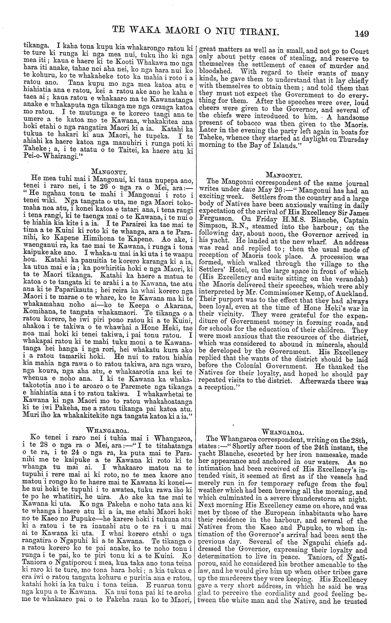 TE WAKA MAORI O NIU TIRANI. 149 tikanga. I kaha tona kupu kia whakarongo ratou ki te ture ki runga ki nga mea nui, tuku iho ki nga mea iti; kaua e haere ki te Kooti Whakawa mo nga hara iti anake, tahae nei aha nei, ko nga hara nui ko te kohuru, ko te whakaheke toto ka mahia i roto i a ratou ano. Tana kupu mo nga mea katoa atu e hiahiatia ana e ratou, kei a ratou ake ano he kaha e taea ai; kaua ratou e whakaaro ma te Kawanatanga anake e whakaputa nga tikanga me nga oranga katoa mo ratou. I te mutunga e te korero tangi ana te umere a te katoa mo te Kawana, whakakitea ana hoki etahi o nga rangatira Maori ki a ia. Katahi ka tukua te hakari ki aua Maori, he tupeka. I te ahiahi ka haere katoa nga manuhiri i runga poti ki Taheke; a, i te atatu o te Taitei, ka haere atu ki Pei-o-Whairangi.'' MANGONUI. He mea tuhi mai i Mangonui, ki taua nupepa ano, tenei i raro nei, i te 26 o nga ra o Mei, ara:— " He ngahau tonu te mahi i Mangonui i roto i tenei wiki. Nga tangata o uta, me nga Maori toko- maha noa atu, i konei katoa e tatari ana, i tena rangi i tena rangi, ki te taenga mai o te Kawana, i te nui o te hiahia kia kite i a ia. I te Parairei ka tae mai te tima a te Kuini ki roto ki te whanga, ara a te Para- nihi, ko Kapene Himihona te Kapene. Ao ake, i waenganui ra, ka tae mai te Kawana, i runga i tona kaipuke ake ano. I whaka-u mai ia ki uta i te waapu hou. Ka.tahi ka panuitia te korero karanga ki a ia, ka utua mai e ia; ka powhiritia hoki e nga Maori, ki ta te Maori tikanga. Katahi ka haere a matua te katoa o te tangata ki te arahi i a te Kawana, tae atu ana ki te Paparikauta ; hei reira ka whai korero nga Maori i te marae o te whare, ko te Kawana ma ki te whakamahau noho ai—ko te Keepa o Akarana, Komihana, te tangata whakamaori. Te tikanga o a ratou korero, he iwi piri pono ratou ki a te Kuini, ahakoa i te takiwa o te whawhai a Hone Heki, tae noa mai hoki ki tenei takiwa, i pai tonu ratou. I whakapai ratou ki te mahi tuku moni a te Kawana- tanga hei hanga i nga rori, hei whakatu kura ako i a ratou tamariki hoki. He nui to ratou hiahia kia mahia nga rawa o to ratou takiwa, ara nga waro, nga koura, nga aha atu, e whakaarotia ana kei te whenua e noho ana. I ki te Kawana ka whaka- takotoria ano i te aroaro o te Paremete nga tikanga e hiahiatia ana i to ratou takiwa. I whakawhetai te Kawana ki nga Maori mo to ratou whakahoatanga ki te iwi Pakeha, me a ratou tikanga pai katoa atu. Muri iho ka whakakitekite nga tangata katoa ki aia." WHANGAROA. Ko tenei i raro nei i tuhia mai i Whangaroa, i te 28 o nga ra o Mei, ara:—" I te titahatanga o te ra, i te 24 o nga ra, ka puta mai te Para- nihi me te kaipuke a te Kawana ki roto ki te whanga tu mai ai. I whakaaro matou na te tupuhi i rere mai ai ki roto, no te mea kaore ano matou i rongo ko te haere mai te Kawana ki konei— he nui hoki te tupuhi i te awatea, tuku rawa iho ki te po he whatitiri, he uira. Ao ake ka tae mai te Kawana ki uta. Ko nga Pakeha e noho tata ana ki te whanga i haere atu ki a ia, me etahi Maori hoki no te Kaeo no Pupuke—he karere hoki i tukuna atu ki a ratou i te ra inanahi atu o te ra i u mai ai te Kawana ki uta. I whai korero etahi o nga rangatira o Ngapuhi ki a te Kawana. Te tikanga o a ratou korero ko te pai anake, ko te noho tonu i runga i te pai, ko te piri tonu ki a te Kuini. Ko Taniora o Ngatiporou i mea, kua taka ano tona teina ki raro ki te ture, mo tona hara hoki ; a kia tukua e era iwi o ratou tangata kohuru e puritia ana e ratou, katahi hoki ia ka tuku i tona teina. E ruarua tonu nga kupu a te Kawana. Ka nui tona pai ki te aroha me te whakaaro pai o te Pakeha raua ko te Maori, great matters as well as in small, and not go to Court only about petty cases of stealing, and reserve to themselves the settlement of cases of murder and bloodshed. With regard to their wants of many kinds, he gave them to understand that it lay chiefly with themselves to obtain them ; and told them that they must not expect the Government to do every- thing for them. After the speeches were over, loud cheers were given to the Governor, and several of the chiefs were introduced to him. A handsome present of tobacco was then given to the Maoris. Later in the evening the party left again in boats for Taheke, whence they started at daylight on Thursday morning to the Bay of Islands." MANGONUI. The Mangonui correspondent of the same journal writes under date May 26:—" Mangonui has had an exciting week. Settlers from the country and a large body of Natives have been anxiously waiting in daily expectation of the arrival of His Excellency Sir James Fergusson. On Friday H.M.S. Blanche, Captain Simpson, R.N., steamed into the harbour; on the following day, about noon, the Governor arrived in his yacht. He landed at the new wharf. An address was read and replied to; then the usual mode of reception of Maoris took place. A procession was formed, which walked through the village to the Settlers' Hotel, on the large space in front of which (His Excellency and suite sitting on the verandah) the Maoris delivered their speeches, which were ably interpreted by Mr. Commissioner Kemp, of Auckland. Their purport was to the effect that they had always been loyal, even at the time of Hone Heki's war in their vicinity. They were grateful for the expen- diture of Government money in forming roads, and for schools for the education of their children. They were most anxious that the resources of the district, which was considered to abound in minerals, should be developed by the Government. His Excellency replied that the wants of the district should be laid before the Colonial Government. He thanked the Natives for their loyalty, and hoped ho should pay repeated visits to the district. Afterwards there was a reception." WHANGAROA. The Whangaroa correspondent, writing on the 28th, states:—" Shortly after noon of the 24th instant, the yacht Blanche, escorted by her iron namesake, made her appearance and anchored in our waters. As no intimation had been received of His