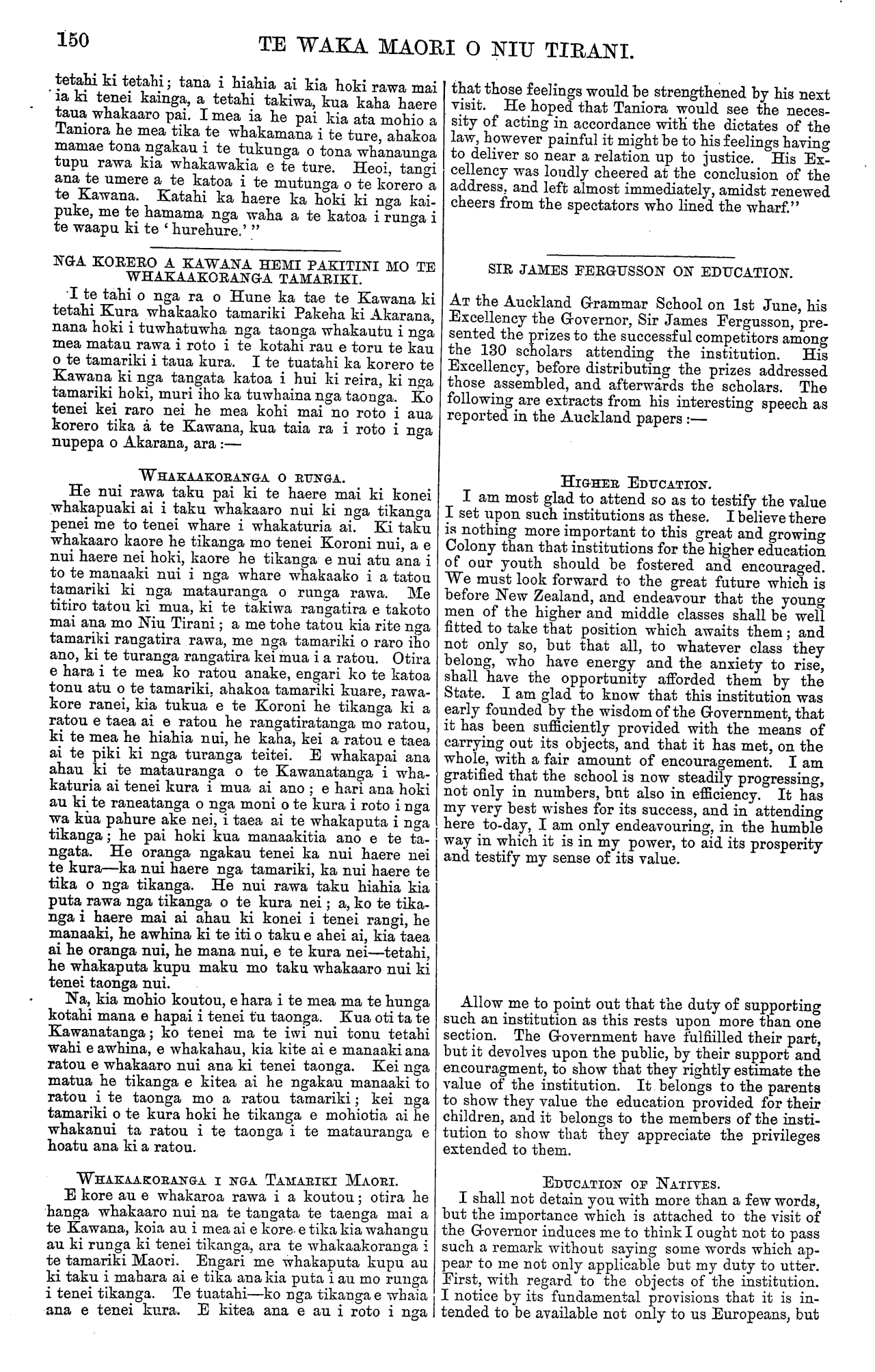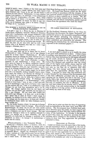 150 TE WAKA MAORI O NIU TIRANI. tetahi ki tetahi; tana i hiahia ai kia hoki rawa mai ia ki tenei kainga, a tetahi takiwa, kua kaha haere taua whakaaro pai. I mea ia he pai kia ata mohio a Taniora he mea tika te whakamana i te ture, ahakoa mamae tona ngakau i te tukunga o tona whanaunga tupu rawa kia whakawakia e te ture. Heoi, tangi ana te umere a te katoa i te mutunga o te korero a te Kawana. Katahi ka haere ka hoki ki nga kai- puke, me te hamama nga waha a te katoa i runga i te waapu ki te ' hurehure.' " NGA KORERO A KAWANA HEMI PAKITINI MO TE WHAKAAKORANGA TAMARIKI. I te tahi o nga ra o Hune ka tae te Kawana ki tetahi Kura whakaako tamariki Pakeha ki Akarana, nana hoki i tuwhatuwha nga taonga whakautu i nga mea matau rawa i roto i te kotahi rau e toru te kau o te tamariki i taua kura. I te tuatahi ka korero te Kawana ki nga tangata katoa i hui ki reira, ki nga tamariki hoki, muri iho ka tuwhaina nga taonga. Ko tenei kei raro nei he mea kohi mai no roto i aua korero tika a te Kawana, kua taia ra i roto i nga nupepa o Akarana, ara :— WHAKAAKORANGA, o RUNGA. He nui rawa taku pai ki te haere mai ki konei whakapuaki ai i taku whakaaro nui ki nga tikanga penei me to tenei whare i whakaturia ai. Ki taku whakaaro kaore he tikanga mo tenei Koroni nui, a e nui haere nei hoki, kaore he tikanga e nui atu ana i to te manaaki nui i nga whare whakaako i a tatou tamariki ki nga matauranga o runga rawa. Me titiro tatou ki mua, ki te takiwa rangatira e takoto mai ana mo Niu Tirani; a me tohe tatou kia rite nga tamariki rangatira rawa, me nga tamariki o raro iho ano, ki te turanga rangatira kei mua i a ratou. Otira e hara i te mea ko ratou anake, engari ko te katoa tonu atu o te tamariki; ahakoa tamariki kuare, rawa- kore ranei, kia tukua e te Koroni he tikanga ki a ratou e taea ai e ratou he rangatiratanga mo ratou, ki te mea he hiahia nui, he kaha, kei a ratou e taea ai te piki ki nga turanga teitei. E whakapai ana ahau ki te matauranga o te Kawanatanga i wha- katuria ai tenei kura i mua ai ano ; e hari ana hoki au ki te raneatanga o nga moni o te kura i roto i nga wa kua pahure ake nei, i taea ai te whakaputa i nga tikanga; he pai hoki kua manaakitia ano e te ta- ngata. He oranga ngakau tenei ka nui haere nei te kura—ka nui haere nga tamariki, ka nui haere te tika o nga tikanga. He nui rawa taku hiahia kia puta rawa nga tikanga o te kura nei ; a, ko te tika- nga i haere mai ai ahau ki konei i tenei rangi, he manaaki, he awhina ki te iti o taku e ahei ai, kia taea ai he oranga nui, he mana nui, e te kura nei—tetahi, he whakaputa kupu maku mo taku whakaaro nui ki tenei taonga nui. Na, kia mohio koutou, e hara i te mea ma te hunga kotahi mana e hapai i tenei tu taonga. Kua oti ta te Kawanatanga; ko tenei ma te iwi nui tonu tetahi wahi e awhina, e whakahau, kia kite ai e manaaki ana ratou e whakaaro nui ana ki tenei taonga. Kei nga matua he tikanga e kitea ai he ngakau manaaki to ratou i te taonga mo a ratou tamariki; kei nga tamariki o te kura hoki he tikanga e mohiotia ai he whakanui ta ratou i te taonga i te matauranga e hoatu ana ki a ratou. WHAKAAKORANGA I NGA TAMARIKI MAORI. E kore au e whakaroa rawa i a koutou; otira he hanga whakaaro nui na te tangata te taenga mai a te Kawana, koia au i mea ai e kore. e tika kia wahangu au ki runga ki tenei tikanga, ara te whakaakoranga i te tamariki Mao ri. Engari me whakaputa kupu au ki taku i mahara ai e tika ana kia puta i au mo runga i tenei tikanga. Te tuatahi—ko nga tikanga e whaia ana e tenei kura. E kitea ana e au i roto i nga that those feelings would be strengthened by his next visit. He hoped that Taniora would see the neces- sity of acting in accordance with the dictates of the law, however painful it might be to his feelings having to deliver so near a relation up to justice. His Ex- cellency was loudly cheered at the conclusion of the address, and left almost immediately, amidst renewed cheers from the spectators who lined the wharf." SIR JAMES FERGUSSON ON EDUCATION. AT the Auckland Grammar School on 1st June, his Excellency the Governor, Sir James Fergusson, pre- sented the prizes to the successful competitors among the 130 scholars attending the institution. His Excellency, before distributing the prizes addressed those assembled, and afterwards the scholars. The following are extracts from bis interesting speech as reported in the Auckland papers :— HIGHER EDUCATION. I am most glad to attend so as to testify the value I set upon such institutions as these. I believe there is nothing more important to this great and growing Colony than that institutions for the higher education of our youth should be fostered and encouraged. We must look forward to the great future which is before New Zealand, and endeavour that the young men of the higher and middle classes shall be well fitted to take that position which awaits them; and not only so, but that all, to whatever class they belong, who have energy and the anxiety to rise, shall have the opportunity afforded them by the State. I am glad to know that this institution was early founded by the wisdom of the Government, that it has been sufficiently provided with the means of carrying out its objects, and that it has met, on the whole, with a fair amount of encouragement. I am gratified that the school is now steadily progressing, not only in numbers, but also in efficiency. It has my very best wishes for its success, and in attending here to-day, I am only endeavouring, in the humble way in which it is in my power, to aid its prosperity and testify my sense of its value. Allow me to point out that the duty of supporting such an institution as this rests upon more than one section. The Government have fulfiilled their part, but it devolves upon the public, by their support and encouragment, to show that they rightly estimate the value of the institution. It belongs to the parents to show they value the education provided for their children, and it belongs to the members of the insti- tution 