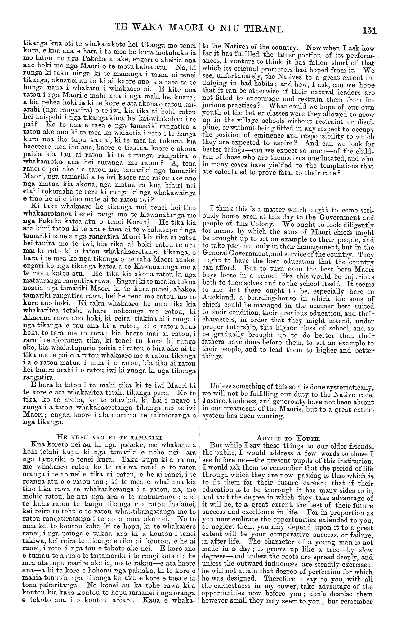 TE WAKA MAORI O NIU TIRANI. 151 tikanga kua oti te whakatakoto hei tikanga mo tenei kura, e kiia ana e hara i te mea he kura motuhake ia mo tatou mo nga Pakeha anake, engari e aheitia ana ano hoki mo nga Maori o te motu katoa atu. Na, ki runga ki taku uinga ki te mananga i mana ai tenei tikanga, akuanei au te ki ai kaore ano kia taea ta te hunga nana i whakatu i whakaaro ai. E kite ana tatou i nga Maori e mahi ana i nga mahi he, kuare ; a kia pehea hoki ia ki te kore e ata akona o ratou kai- arahi (nga rangatira) o te iwi, kia tika ai hoki ratou hei kai-pehi i nga tikanga kino, hei kai-whakahau i te pai? Ko te aha e taea e nga tamariki rangatira a tatou ake ano ki te mea ka waihotia i roto i te hanga kura noa iho tupu kau ai, ki te mea ka tukuna kia haereere noa iho aua, kaore e tiakina, kaore e akona paitia kia tau ai ratou ki te turanga rangatira e whakaarotia ana hei turanga mo ratou ? A, tena ranei e pai ake i a tatou nei tamariki nga tamariki Maori, nga tamariki a te. iwi kaore ano ratou ake ano nga matua kia akona, nga matua ra kua hihiri nei etahi tokomaha te rere ki runga ki nga whakawainga e tino he ai e tino mate ai to ratou iwi ? Ki taku whakaaro he tikanga nui tenei hei tino whakaarotanga i enei rangi mo te Kawanatanga me nga Pakeha katoa atu o tenei Koroni. He tika kia ata kimi tatou ki te ara e taea ai te whakatupu i nga tamariki tane a nga rangatira Maori kia tika ai ratou hei tauira mo te iwi, kia tika ai hoki ratou to uru mai ki roto ki a tatou whakahaeretanga tikanga, o hara i te mea ko nga tikanga o te taha Maori anake, engari ko nga tikanga katoa a te Kawanatanga me a te motu katoa atu. He tika kia akona ratou ki nga matauranga rangatira rawa. Engari ki te mea ka tukua noatia nga tamariki Maori ki te kura penei, ahakoa tamariki rangatira rawa, hei he tena mo ratou, mo to kura ano hoki. Ki taku whakaaro he mea tika kia whakaritea tetahi whare nohoanga mo ratou, ki Akarana rawa ano hoki, ki reira tiakina ai i runga i nga tikanga e tau ana ki a ratou, ki o ratou ahua hoki, to tera me to tora; kia haere mai ai ratou, i raro i te akoranga tika, ki tenei tu kura ki runga ake, kia whakatupuria paitia ai ratou e hira ake ai te tika me te pai o a ratou whakaaro me a ratou tikanga i a o ratou matua i mua i a ratou, kia tika ai ratou hei tauira arahi i o ratou iwi ki runga ki nga tikanga rangatira. E hara ta tatou i to mahi tika ki te iwi Maori ki te kore e ata whakaritea tetahi tikanga pera. Ko to tika, ko te aroha, ko to atawhai, ki hai i ngaro i runga i a tatou whakahaeretanga tikanga mo te iwi Maori; engari kaore i ata marama te takotoranga o nga tikanga. HE KUPU AKO EI TE TAMARIKI. Kua korero nei au ki nga pakeke, me whakaputa hoki tetahi kupu ki nga tamariki e noho nei—ara nga tamariki o tenei kura. Taku kupu ki a ratou, me whakaaro ratou ko te takiwa tenei o to ratou oranga i te ao nei e tika ai ratou, e he ai ranei, i te roanga atu o o ratou tau; ki te mea e whai ana kia tino tika rawa te whakaakoranga i a ratou, na, me mohio ratou, he nui nga ara o te matauranga ; a ki te kaha ratou te tango tikanga mo ratou inaianei, kei reira te tohu o to ratou whai-tikangatanga me to ratou rangatiratanga i te ao a mua ake nei. No te mea kei to koutou kaha ki te hopu, ki te whakarere ranei; i nga painga e tukua ana ki a koutou i tenei takiwa, kei reira te tikanga e tika ai koutou, e he ai ranei, i roto i nga tau e takoto ake nei. E kore ano e tumau to ahua o te taitamariki i to rangi kotahi; he mea ata tupu marire ake ia, me te rakau—e ata haere ana—a ki te kore e hohonu nga pakiaka, ki to kore e mahia tonutia nga tikanga ke atu, e kore e taea e ia tona pakaritanga. No konei au ka tohe rawa ki a koutou kia kaha koutou te hopu inaianei i nga oranga © takoto ana i o koutou aroaro. Kaua e whaka- to the Natives of the country. Now when I ask how far it has fulfilled the latter portion of its perform- ances, I venture to think it has fallen short of that; which its original promoters had hoped from it. We see, unfortunately, the Natives to a great extent in- dulging in bad habits ; and how, I ask, can we hope that it can be otherwise if their natural leaders are not fitted to encourage and restrain them from in- jurious practices ? What could wo hope of our own youth of the better classes were they allowed to grow up in the village schools without restraint or disci- pline, or without being fitted in any respect to occupy the position of eminence and responsibility to which they are expected to aspire ? And can we look for better things—can we expect so much—of the child- ren of those who are themselves uneducated, and who in many cases have yielded to the temptations that are calculated to prove fatal to their race ? I think this is a matter which ought to come seri- ously homo even at this day to the Government and people of this Colony. We ought to look diligently for means by which the sons of Maori chiefs might be brought up to set an example to their people, and to take part not only in their management, but in the General Government, and service of the country. They ought to have the best education that the country can afford. But to turn even the best born Maori boys loose in a school like this would be injurious both to themselves and to the school itself. It seems to mo that there ought to be, especially here in Auckland, a boarding-house in which the sous of chiefs could be managed in the manner best suited to their condition, their previous education, and their characters, in order that they might attend, under proper tutorship, this higher class of school, and so be gradually brought up to do better than their fathers have done before them, to set an example to their people, and to lead them to higher and better things. Unless something of this sort is done systematically, we will not be fulfilling our duty to the Native race. Justice, kindness, and generositv have not been absent in our treatment of the Maoris, but to a great extent system has been wanting. ADVICE 