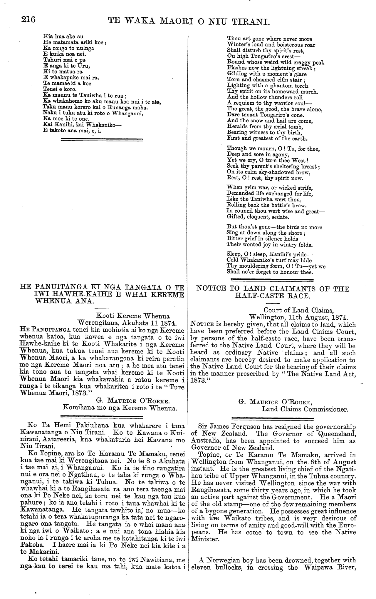 216 TE WAKA MAORI O NIU TIRANI. Kia hua ake au He matamata ariki koe ; Ka rongo to nuinga E kuika noa nei. Tahuri mai e pa E anga ki te Uru, Ki to matua ra E whakapuke mai ra. Te mamae ki a koe Tenei e koro. Ka maunu te Taniwha i te rua; Ka whakahemo ko aku manu koa nui i te ata, Taku manu korero kai o Runanga maha. Naku i tuku atu ki roto o Whanganui, Ka moe ki te one. Kai Kanihi, kai Whakaniko— E takoto ana mai, e, i. HE PANUITANGA KI NGA TANGATA O TE IWI HAWHE-KAIHE E WHAI KEREME WHENUA ANA. Kooti Kereme Whenua Werengitana, Akuhata 11 1874. HE PANUITANGA, tenei kia mohiotia ai ko nga Kereme whenua katoa, kua kawea e nga tangata o te iwi Hawhe-kaihe ki te Kooti Whakarite i nga Kereme Whenua, kua tukua tenei aua kereme ki te Kooti Whenua Maori, a ka whakarangona ki reira peratia me nga Kereme Maori noa atu ; a he mea atu tenei kia tono aua tu tangata whai kereme ki te Kooti Whenua Maori kia whakawakia a ratou kereme i runga i te tikanga kua, whakaritea i roto i te " Ture Whenua Maori, 1873." G. MATENGA O'RORKE. Komihana mo nga Kereme Whenua. Ko Ta Hemi Pakiuhana kua whakarere i tana Kawanatanga o Niu Tirani. Ko te Kawana o Kui- nirani, Aatareeria, kua whakaturia hei Kawana mo Niu Tirani. Ko Topine, ara ko Te Karamu Te Mamaku, tenei kua tae mai ki Werengitana nei. No te 8 o Akuhata i tae mai ai, i Whanganui. Ko ia te tino rangatira nui e ora nei o Ngatihau, o te taha ki runga o Wha- nganui, i te takiwa ki Tuhua. No te takiwa o te whawhai ki a te Rangihaeata ra ano tera taenga mai ona ki Po Neke nei, ka toru nei te kau nga tau kua pahure; ko ia ano tetahi i roto i taua whawhai ki te Kawanatanga. He tangata tawhito ia, no mua—ko tetahi ia o tera whakatupuranga ka tata nei te ngaro- ngaro ona tangata. He tangata ia e whai mana ana ki nga iwi o Waikato ; a e nui ana tona hiahia kia noho ia i runga i te aroha me te kotahitanga ki te iwi Pakeha. I haere mai ia ki Po Neke nei kia kite i a te Makarini. Ko tetahi tamariki tane, no te iwi Nawitiana, me nga kau to terei te kau ma tahi, kua mate katoa i Thou art gone where never more Winter's loud and boisterous roar Shall disturb thy spirit's rest, On high Tongariro's crest— Round whose weird wild craggy peak Flashes now the lightning streak; Gilding with a moment's glare Torn and chasmed elfin stair ; Lighting with a phantom torch Thy spirit on its homeward march. And the hollow thunders roll A requiem to thy warrior soul— The great, the good, the brave alone, Dare tenant Tongariro's cone. And the snow and hail are come, Heralds from thy serial tomb, Bearing witness to thy birth, First and greatest of the earth. Though we mourn, O ! Tu, for thee, Deep and sore in agony, Yet we cry, 0 turn thee West! Seek thy parent's sheltering breast; On its calm sky-shadowed brow, Rest, O ! rest, thy spirit now. When grim war, or wicked strife, Demanded life exchanged for life, Like the Taniwha wert thou, Rolling back the battle's brow. In council thou wert wise and great— Gifted, eloquent, sedate. But thou'st gone—the birds no more Sing at dawn along the shore ; Bitter grief in silence holds Their wonted joy in wintry folds. Sleep, 0! sleep, Kanihi's pride— Cold Whakaniko's turf may hide Thy mouldering form, O! Tu—yet we Shall ne'er forget to honour thee. NOTICE TO LAND CLAIMANTS OF THE HALF-CASTE RACE. Court of Land Claims, Wellington, 11th August, 1874. NOTICE is hereby given, that all claims to land, which have been preferred before the Laud Claims Court, by persons of the half-caste race, have been trans- ferred to the Native Land Court, where they will be heard as ordinary Native claims; and all such claimants are hereby desired to make application to the Native Land Court for the hearing of their claims in the manner prescribed by " The Native Land Act, 1873." G. MAURICE O'RORKE, Land Claims Commissioner. Sir James Ferguson has resigned the governorship of New Zealand. The Governor of Queensland, Australia, has been appointed to succeed him as Governor of New Zealand. Topine, or Te Karamu Te Mamaku, arrived in Wellington from Whanganui, on the 8th of August instant. He is the greatest living chief of the Ngati- hau tribe of Upper Whanganui, in the Tuhua country. He has never visited Wellington since the war with Rangihaeata, some thirty years ago, in which he took an active part against the Government. He a Maori of the old stamp—one of the few remaining members of a bygone generation. He possesses great influence with the Waikato tribes, and is very desirous of living on terms of amity and good-will with the Euro- peans. He has come to town to see the Native Minister. A Norwegian boy has been drowned, together with eleven bullocks, in crossing the Waipawa River,