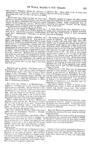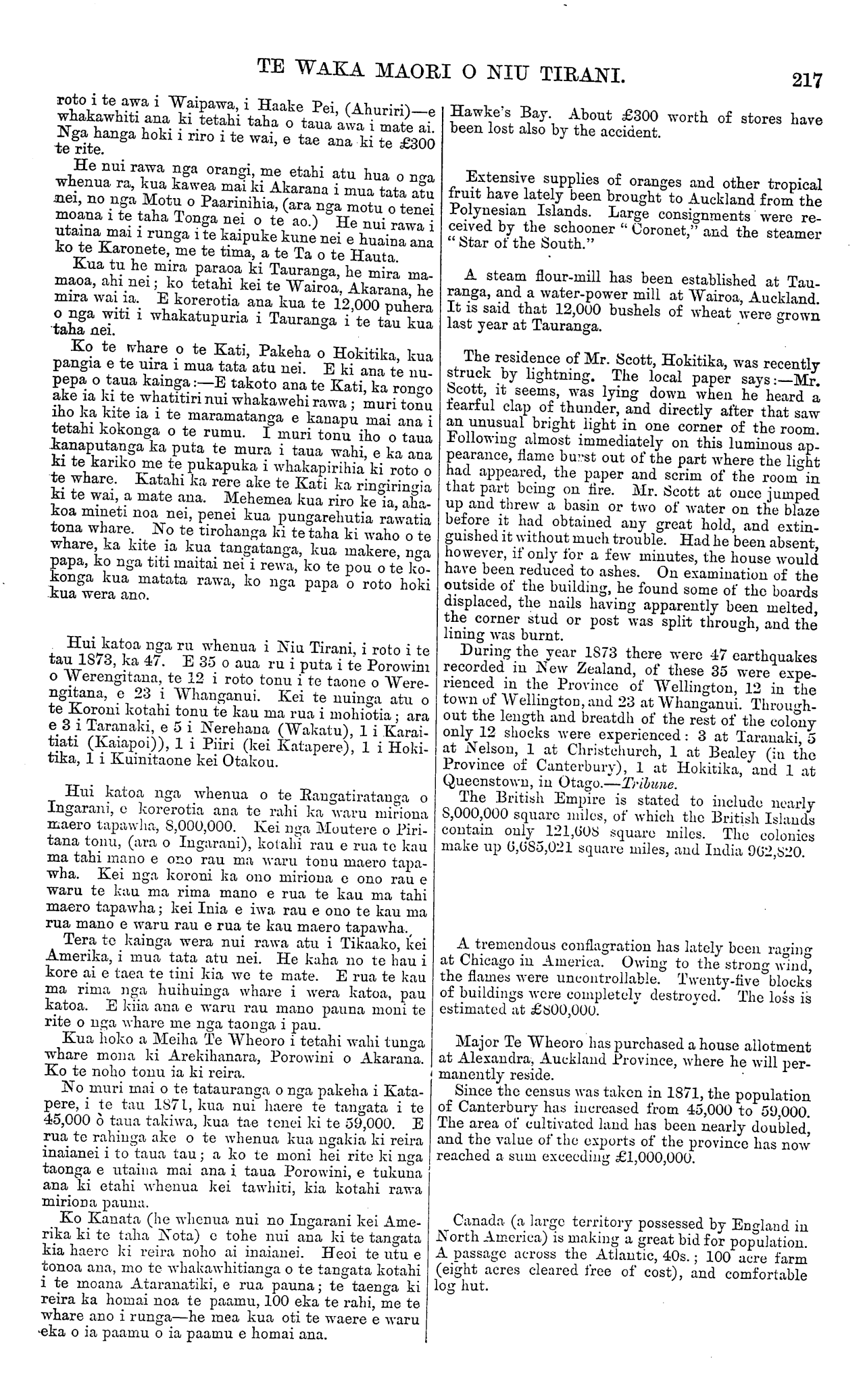 TE WAKA MAORI O NIU TIRANI. 217 roto i te awa i Waipawa, i Haake Pei, (Ahuriri) e whakawhiti ana ki tetahi taha o taua awa i mate ai. Nga hanga hoki i riro i te wai, e tae ana ki te £300 te rite. He nui rawa nga orangi, me etahi atu hua o nga whenua, ra, kua kawea mai ki Akarana i mua tata atu nei, no nga Motu o Paarinihia, (ara nga motu o tenei moana i te taha Tonga nei o te ao.) He nui rawa i utaina mai i runga i te kaipuke kune nei e huaina ana ko te Karonete, me te tima, a te Ta o te Hauta. Kua tu he mira paraoa ki Tauranga, he mira ma- maoa, ahi nei; ko tetahi kei te Wairoa, Akarana, he mira wai ia. E korerotia ana kua te 12,000 puhera o nga witi i whakatupuria i Tauranga i te tau kua taha nei. Ko te whare o te Kati, Pakeha o Hokitika, kua pangia e te uira i mua tata atu nei. E ki ana te nu- pepa o taua kainga:—E takoto ana te Kati, ka rongo ake ia ki te whatitiri nui whakawehi rawa ; muri tonu iho ka kite ia i te maramatanga e kanapu mai ana i tetahi kokonga o te rumu. I muri tonu iho o taua kanaputanga ka puta te mura i taua wahi, e ka ana ki te kariko me te pukapuka i whakapirihia ki roto o te whare. Katahi ka rere ake te Kati ka ringiringia ki te wai, a mate ana. Mehemea kua riro ke ia, aha- koa mineti noa nei, penei kua pungarehutia rawatia tona whare. No te tirohanga ki te taha ki waho o te whare, ka kite ia kua tangatanga, kua makere, nga papa, ko nga titi maitai nei i rewa, ko te pou o te ko- konga kua matata rawa, ko nga papa o roto hoki kua wera ano. Hui katoa nga ru whenua i Niu Tirani, i roto i te tau 1873, ka 47. E 35 o aua ru i puta i te Porowini o Werengitana, te 12 i roto tonu i te taone o Were- ngitana, e 23 i Whanganui. Kei te nuinga atu o te Koroni kotahi tonu te kau ma rua i mohiotia ; ara e 3 i Taranaki, e 5 i Nerehana (Wakatu), 1 i Karai- tiati (Kaiapoi)), 1 i Piiri (kei Katapere), 1 i Hoki- tika, 1 i Kuinitaone kei Otakou. Hui katoa nga whenua o te Rangatiratanga, o Ingarani, e korerotia ana te rahi ka waru miriona maero tapawha, 8,000,000. Kei nga Moutere o Piri- tana tonu, (ara o Ingarani), kotahi rau e rua te kau ma tahi mano e ono rau ma waru tonu maero tapa- wha. Kei nga koroni ka ono miriona e ono rau e waru te kau ma rima mano e rua te kau ma tahi maero tapawha; kei Inia e iwa. rau e ono te kau ma rua mano e waru rau e rua te kau maero tapawha. Tera te kainga wera nui rawa atu i Tikaako, kei Amerika, i mua tata atu nei. He kaha no te hau i kore ai e taea te tini kia we te mate. E rua te kau ma rima nga huihuinga whare i wera katoa, pau katoa. E kiia ana e waru rau mano pauna moni te rite o nga whare me nga taonga i pau. Kua hoko a Meiha Te Wheoro i tetahi wahi tunga whare mona ki Arekihanara, Porowini o Akarana. Ko te noho tonu ia ki reira. No muri mai o te tatauranga o nga pakeha i Kata- pere, i te tau 1871, kua nui haere te tangata i te 45,000 6 taua takiwa, kua tae tenei ki te 59,000. E rua te rahinga ake o te whenua kua ngakia ki reira inaianei i to taua tau ; a ko te moni hei rite ki nga taonga e utaina mai ana i taua Porowini, e tukuna ana ki etahi whenua kei tawhiti, kia kotahi rawa miriona pauna. Ko Kanata (he whenua nui no Ingarani kei Ame- rika ki te taha Nota) e tohe nui ana ki te tangata kia haere ki reira noho ai inaianei. Heoi te utu e tonoa aua, mo te whakawhitianga o te tangata kotahi i te moana Ataranatiki, e rua pauna; te taenga ki reira ka homai noa te paamu, 100 eka te rahi, me te whare ano i runga—he mea kua oti te waere e waru eka o ia paamu o ia paamu e homai ana. Hawke's Bay. About £300 worth of stores have been lost also by the accident. Extensive supplies of oranges and other tropical fruit have lately been brought to Auckland from the Polynesian Islands. Large consignments were re- ceived by the schooner " Coronet," and the steamer " Star of the South." A steam flour-mill has been established at Tau- ranga, and a water-power mill at Wairoa, Auckland. It is said that 12,000 bushels of wheat were grown last year at Tauranga. The residence of Mr. Scott, Hokitika, was recently struck by lightning. The local paper says:—Mr. Scott, it seems, was lying down when he heard a fearful clap of thunder, and directly after that saw an unusual bright light in one corner of the room. Following almost immediately on this luminous ap- pearance, flame burst out of the part where the light had appeared, the paper and scrim of the room in that part being on fire. Mr. Scott at once jumped up and threw a basin or two of water on the blaze before it had obtained any great hold, and extin- guished it without much trouble. Had he been absent, however, if only for a few minutes, the house would have been reduced to ashes. On examination of the outside of the building, he found some of the boards displaced, the nails having apparently been melted, the corner stud or post was split through, and the lining was burnt. During the year 1873 there were 47 earthquakes recorded in New Zealand, of these 35 were expe- rienced in the Province of Wellington, 12 in the town of Wellington, and 23 at Whanganui. Through- out the length and breatdh of the rest of the colony only 12 shocks were experienced : 3 at Taranaki, 5 at Nelson, 1 at Christchurch, 1 at Bealey (in the Province of Canterbury), 1 at Hokitika, and 1 at Queenstown, in Otago.—Tribune. The British Empire is stated to include nearly 8,000,000 square miles, of which the British Islands contain only 121,608 square miles. The colonies make up 6,685,021 square miles, and India 962,820. A tremendous conflagration has lately been raging at Chicago in America. Owing to the strong wind, the flames were uncontrollable. Twenty-five blocks of buildings were completely destroyed. The loss is estimated at £800,000. Major Te Wheoro has purchased a house allotment at Alexandra, Auckland Province, where he will per- manently reside. Since the census was taken in 1871, the population of Canterbury has increased from 45,000 to 59,000. The area of cultivated laud has been nearly doubled, and the value of the expor