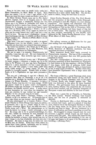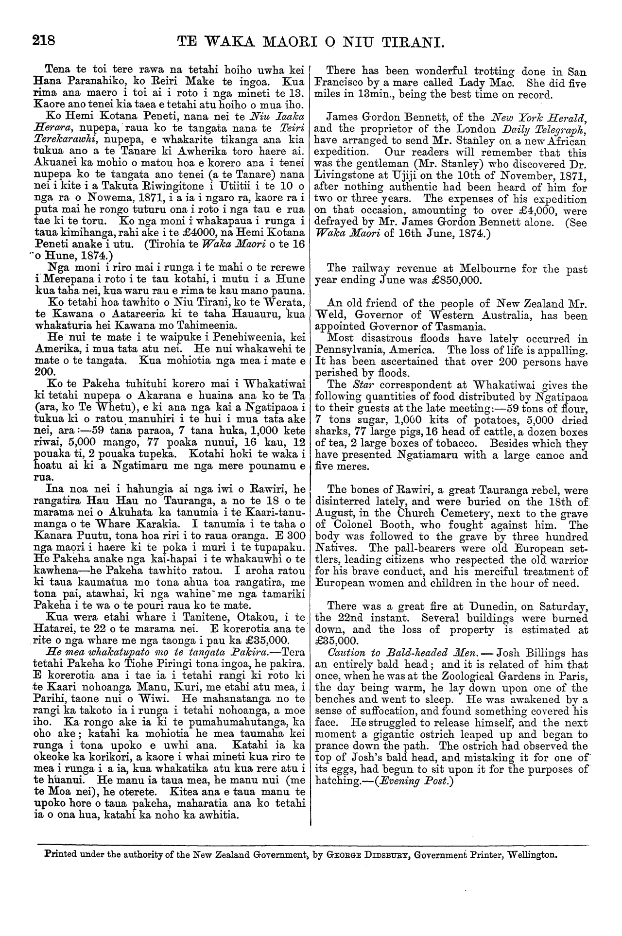 218 TE WAKA MAORI O NIU TIRANI. Tena te toi tere rawa na tetahi hoiho uwha kei Hana Paranahiko, ko Reiri Make te ingoa. Kua rima ana maero i toi ai i roto i nga mineti te 13. Kaore ano tenei kia taea e tetahi atu hoiho o mua iho. Ko Hemi Kotana Peneti, nana nei te Niu laaka Herara, nupepa, raua ko te tangata nana te Teiri Terekarawhi, nupepa, e whakarite tikanga ana kia tukua ano a te Tanare ki Awherika toro haere ai. Akuanei ka mohio o matou hoa e korero ana i tenei nupepa ko te tangata ano tenei (a te Tanare) nana nei i kite i a Takuta Riwingitone i Utiitii i te 10 o nga ra o Nowema, 1871, i a ia i ngaro ra, kaore ra i puta mai he rongo tuturu ona i roto i nga tau e rua tae ki te toru. Ko nga moni i whakapaua i runga i taua kimihanga, rahi ake i te £4000, na Hemi Kotana Peneti anake i utu. (Tirohia te Waka Maori o te 16 "o Hune, 1874.) Nga moni i riro mai i runga i te mahi o te rerewe i Merepana i roto i te tau kotahi, i mutu i a Hune kua taha nei, kua waru rau e rima te kau mano pauna. Ko tetahi hoa tawhito o Niu Tirani, ko te Werata, te Kawana o Aatareeria ki te taha Hauauru, kua whakaturia hei Kawana mo Tahimeenia. He nui te mate i te waipuke i Penehiweenia, kei Amerika, i mua tata atu nei. He nui whakawehi te mate o te tangata. Kua mohiotia nga mea i mate e 200. Ko te Pakeha tuhituhi korero mai i Whakatiwai ki tetahi nupepa o Akarana e huaina ana ko te Ta (ara, ko Te Whetu), e ki ana nga kai a Ngatipaoa i tukua ki o ratou manuhiri i te hui i mua tata ake nei, ara:—59 tana, paraoa, 7 tana huka, 1,000 kete riwai, 5,000 mango, 77 poaka nunui, 16 kau, 12 pouaka ti, 2 pouaka tupeka. Kotahi hoki te waka i hoatu ai ki a Ngatimaru me nga mere pounamu e rua. Ina noa nei i hahungia ai nga iwi o Rawiri, he rangatira Hau Hau no Tauranga, a no te 18 o te marama nei o Akuhata ka tanumia i te Kaari-tanu- manga o te Whare Karakia. I tanumia i te taha o Kanara Puutu, tona hoa riri i to raua oranga. E 300 nga maori i haere ki te poka i muri i te tupapaku. He Pakeha anake nga kai-hapai i te whakauwhi o te kawhena—he Pakeha tawhito ratou. I aroha ratou ki taua kaumatua mo tona ahua toa rangatira, me tona pai, atawhai, ki nga wahine me nga tamariki Pakeha i te wa o te pouri raua ko te mate. Kua wera etahi whare i Tanitene, Otakou, i te Hatarei, te 22 o te marama nei. E korerotia ana te rite o nga whare me nga taonga i pau ka £35,000. He mea whakatupato mo te tangata Pakira.—Tera tetahi Pakeha ko Tiohe Piringi tona ingoa, he pakira. E korerotia ana i tae ia i tetahi rangi ki roto ki •te Kaari nohoanga Manu, Kuri, me etahi atu mea, i Parihi, taone nui o Wiwi. He mahanatanga no te rangi ka takoto ia i runga i tetahi nohoanga, a moe iho. Ka rongo ake ia ki te pumahumahutanga, ka oho ake ; katahi ka mohiotia he mea taumaha kei runga i tona upoko e uwhi ana. Katahi ia ka okeoke ka korikori, a kaore i whai mineti kua riro te mea i runga i a ia, kua whakatika atu kua rere atu i te huanui. He manu ia taua mea, he manu nui (me te Moa nei), he oterete. Kitea ana e taua manu te upoko hore o taua pakeha, maharatia ana ko tetahi ia o ona hua, katahi ka noho ka awhitia. There has been wonderful trotting done in San Francisco by a mare called Lady Mac. She did five miles in 13min., being the best time on record. James Gordon Bennett, of the New York Herald, and the proprietor of the London Daily Telegraph, have arranged to send Mr. Stanley on a new African expedition. Our readers will remember that this was the gentleman (Mr. Stanley) who discovered Dr. Livingstone at Ujiji on the 10th of November, 1871, after nothing authentic had been heard of him for two or three years. The expenses of his expedition on that occasion, amounting to over £4,000, were defrayed by Mr. James Gordon Bennett alone. (See Waka Maori of 16th June, 1874.) The railway revenue at Melbourne for the past year ending June was £850,000. An old friend of the people of New Zealand Mr. Weld, Governor of Western Australia, has been appointed Governor of Tasmania. Most disastrous floods have lately occurred in Pennsylvania, America. The loss of life is appalling. It has been ascertained that over 200 persons have perished by floods. The Star correspondent at Whakatiwai gives the following quantities of food distributed by Ngatipaoa to their guests at the late meeting:—59 tons of flour, 7 tons sugar, 1,000 kits of potatoes, 5,000 dried sharks, 77 large pigs, 16 head of cattle, a dozen boxes of tea, 2 large boxes of tobacco. Besides which they have presented Ngatiamaru with a large canoe and five meres. The bones of Rawiri, a great Tauranga rebel, were disinterred lately, and were buried on the 18th of August, in the Church Cemetery, next to the grave of Colonel Booth, who fought against him. The body was followed to the grave by three hundred Natives. The pall-bearers were old European set- tlers, leading citizens who respected the old warrior for his brave conduct, and his merciful treatment of European women and children in the hour of need. There was a great fire at Dunedin, on Saturday, the 22nd instant. Several buildings were burned down, and the loss of property is estimated at £35,000. Caution to Bald-headed Men.. — Josh Billings has an entirely bald head; and it is related of him that once, when he was at the Zoological Gardens in Paris, the day being warm, he lay down upon one of the benches and went to sleep. He was awakened by a sense of suffocation, and found something covered his face. He struggled to release himself, and the next moment a gigantic ostrich leaped up and began to prance down the path. The ostrich had observed the top of Josh's bald head, and mistaking it for one of its eggs, had begun to sit upon it for the purposes of hatching.—(Evening Post.) Printed under the authority of the New Zealand Government, by GEORGE DIDSBURY, Government Printer, Wellington.