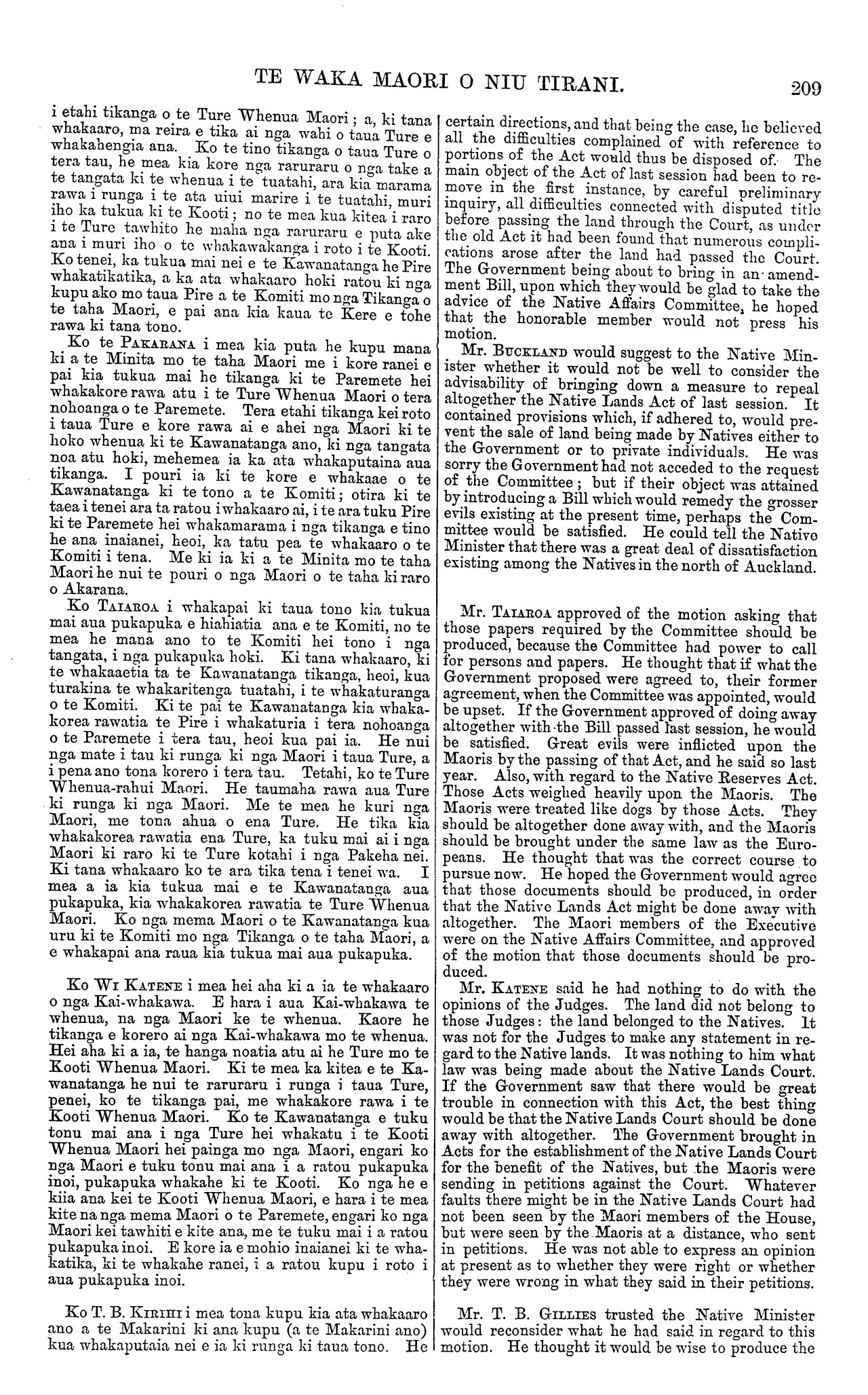 TE WAKA MAORI O NIU TIRANI. 209 i etahi tikanga o te Ture Whenua Maori ; a, ki tana whakaaro, ma reira e tika ai nga wahi o taua Ture e whakahengia ana. Ko te tino tikanga o taua Ture o tera tau, he mea kia kore nga raruraru o nga take a te tangata ki te whenua i te tuatahi, ara kia marama rawa i runga i te ata uiui marire i te tuatahi, muri iho ka tukua ki te Kooti; no te mea kua kitea i raro . i te Ture tawhito he maha nga raruraru e puta ake ana i muri iho o te whakawakanga i roto i te Kooti. Ko tenei, ka tukua mai nei e te Kawanatanga he Pire whakatikatika, a ka ata whakaaro hoki ratou ki nga kupu ako mo taua Pire a te Komiti mo nga Tikanga o te taha Maori, e pai ana kia kaua te Kere e tohe rawa ki tana tono. Ko te PAKARANGA i mea kia puta he kupu mana ki a te Minita mo te taha Maori me i kore ranei e pai kia tukua mai he tikanga ki te Paremete hei whakakore rawa atu i te Ture Whenua Maori o tera nohoanga o te Paremete. Tera etahi tikanga kei roto i taua Ture e kore rawa ai e ahei nga Maori ki te hoko whenua ki te Kawanatanga ano, ki nga tangata noa atu hoki, mehemea ia ka ata whakaputanga aua tikanga. I pouri ia ki te kore e whakaae o te Kawanatanga ki te tono a te Komiti; otira ki te taea i tenei ara ta ratou i whakaaro ai, i te ara tuku Pire ki te Paremete hei whakamarama i nga tikanga e tino he ana inaianei, heoi, ka tatu pea te whakaaro o te Komiti i tena. Me ki ia ki a te Minita mo te taha Maori he nui te pouri o nga Maori o te taha ki raro o Akarana. Ko TAIAROA i whakapai ki taua tono kia tukua mai aua pukapuka e hiahiatia ana e te Komiti, no te mea he mana ano to te Komiti hei tono i nga tangata, i nga pukapuka hoki. Ki tana whakaaro, ki te whakaaetia ta te Kawanatanga tikanga, heoi, kua turakina te whakaritenga tuatahi, i te whakaturanga o te Komiti. Ki te pai te Kawanatanga kia whaka- korea rawatia te Pire i whakaturia i tera nohoanga o te Paremete i tera tau, heoi kua pai ia. He nui nga mate i tau ki runga ki nga Maori i taua Ture, a i pena ano tona korero i tera tau. Tetahi, ko te Ture Whenua-rahui Maori. He taumaha rawa aua Ture ki runga ki nga Maori. Me te mea he kuri nga Maori, me tona ahua o ena Ture. He tika kia whakakorea rawatia ena Ture, ka tuku mai ai i nga Maori ki raro ki te Ture kotahi i nga Pakeha nei. Ki tana whakaaro ko te ara tika tena i tenei wa. I mea a ia kia tukua mai e te Kawanatanga aua pukapuka, kia whakakorea rawatia te Ture Whenua Maori. Ko nga mema Maori o te Kawanatanga kua uru ki te Komiti mo nga Tikanga o te taha Maori, a e whakapai ana raua kia tukua mai aua pukapuka. Ko WI KATENE i mea hei aha ki a ia te whakaaro o nga Kai-whakawa. E hara i aua Kai-whakawa te whenua, na nga Maori ke te whenua. Kaore he tikanga e korero ai nga Kai-whakawa mo te whenua. Hei aha ki a ia, te hanga noatia atu ai he Ture mo te Kooti Whenua Maori. Ki te mea ka kitea e te Ka- wanatanga he nui te raruraru i runga i taua Ture, penei, ko te tikanga pai, me whakakore rawa i te Kooti Whenua Maori. Ko te Kawanatanga e tuku tonu mai ana i nga Ture hei whakatu i te Kooti Whenua Maori hei painga mo nga Maori, engari ko nga Maori e tuku tonu mai ana i a ratou pukapuka inoi, pukapuka whakahe ki te Kooti. Ko nga he e kiia ana kei te Kooti Whenua Maori, e hara i te mea kite na nga mema Maori o te Paremete, engari ko nga Maori kei tawhiti e kite ana, me te tuku mai i a ratou pukapuka inoi. E kore ia e mohio inaianei ki te wha- katika, ki te whakahe ranei, i a ratou kupu i roto i aua pukapuka inoi. Ko T. B. KIRIHI i mea tona kupu kia ata whakaaro ano a te Makarini ki ana kupu (a te Makarini ano) kua. whakaputaia nei e ia ki runga ki taua tono. He certain directions, and that being the case, he believed all the difficulties complained of with reference to portions of the Act would thus be disposed of. The main object of the Act of last session had been to re- move in the first instance, by careful preliminary inquiry, all difficulties connected with disputed title before passing the land through the Court, as under the old Act it had been found that numerous compli- cations arose after the land had passed the Court. The Government being about to bring in an amend- ment Bill, upon which they would be glad to take the advice of the Native Affairs Committee, he hoped that the honorable member would not press his motion. Mr. BUCKLAND would suggest to the Native Min- ister whether it would not be well to consider the advisability of bringing down a measure to repeal altogether the Native Lands Act of last session. It contained provisions which, if adhered to, would pre- vent the sale of land being made by Natives either to the Government or to private individuals. He was sorry the Government had not acceded to the request of the Committee ; but if their object was attained by introducing a Bill which would remedy the grosser evils existing at the present time, perhaps the Com- mittee would be satisfied. He could tell the Native Minister that there was a great deal of dissatisfaction existing among the Natives in the north of Auckland. Mr. TAIAROA approved of the motion asking that those papers required by the Committee should be produced, because the Committee had power to call for persons and papers. He thought that if what the Government proposed were agreed to, their former agreement, when the Committee was appointed, would be upset. If the Government approved of doing away altogether with the Bill passed last session, he would be satisfied. Great evils were inflicted upon the Maoris by the passing of that Act, and he said so last year. Also, with regard to the Native Reserves Act. Those Acts weighed heavily upon the Maoris. The Maoris were treated like dogs by those Acts. They should be altogether done away with, and the Maoris should be brought under the same law as the Euro- peans. He thought that was the correct course to pursue now. He hoped the Government would agree that those documents should bo produced, in order that the Native Lands Act might be done away with altogether. 