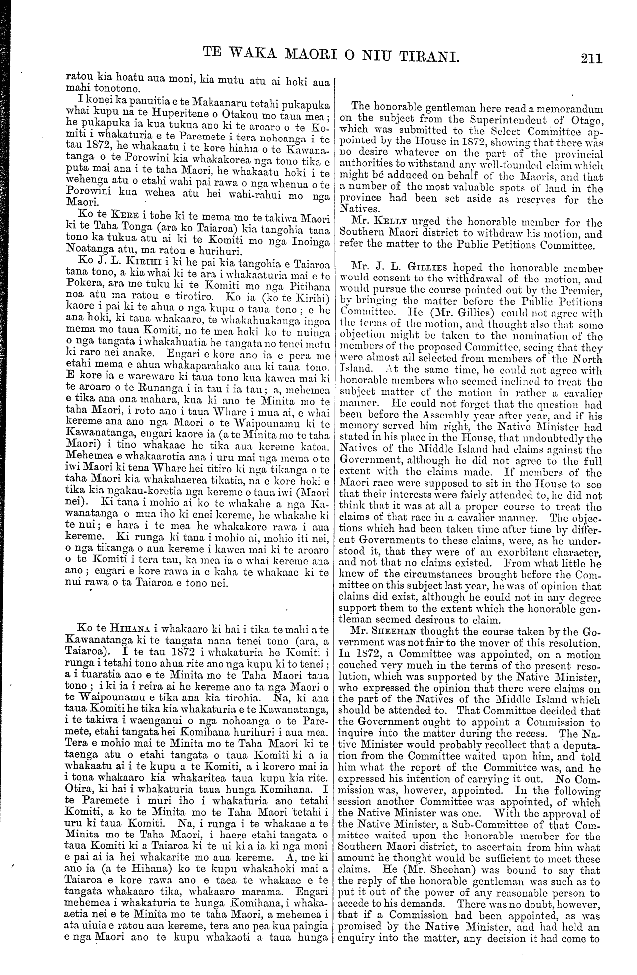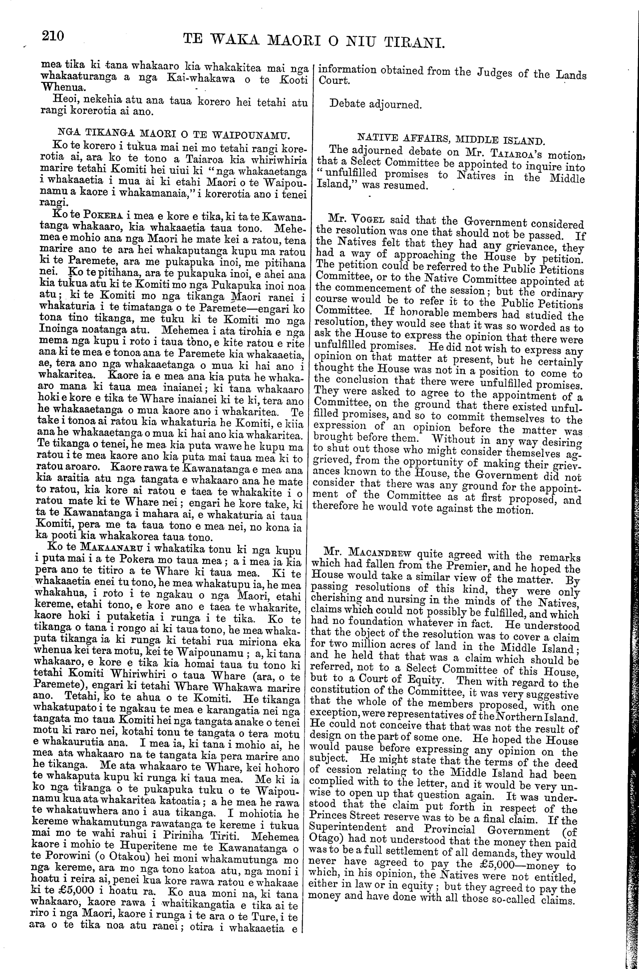 TE WAKA MAORI O NIU TIRANI. 211 ratou kia hoatu aua moni, kia mutu atu ai hoki aua I mahi tonotono. I konei ka panuitia e te Makaanaru tetahi pukapuka whai kupu na te Huperitene o Otakou mo taua mea; he pukapuka ia kua tukua ano ki te aroaro o te Ko- miti i whakaturia e te Paremete i tera nohoanga i te tau 1872, he whakaatu i te kore hiahia o to Kawana- tanga o te Porowini kia whakakorea nga tono tika e puta mai ana i te taha Maori, he whakaatu hoki i te wehenga atu o etahi wahi pai rawa o nga whenua o te Porowini kua wehea atu hei wahi-rahui mo nga Maori. Ko te KERE i tohe ki te mema mo te takiwa Maori ki te Taha Tonga (ara ko Taiaroa) kia tangohia tana tono ka tukua atu ai ki te Komiti mo nga Inoinga Noatanga atu, ma ratou e hurihuri. Ko J. L. KIRIHI i ki he pai kia tangohia e Taiaroa tana tono, a kia whai ki te ara i whakaaturia, mai e to Pokera, ara me tuku ki te Komiti mo nga Pitihana noa atu ma ratou e tirotiro. Ko ia (ko te Kirihi) kaore i pai ki te ahua o nga kupu o taua tono ; e he ana hoki, ki tana whakaaro, te whakahuakanga ingoa mema mo taua Komiti, no to mea hoki ko tu nuinga o nga tangata i whakahuatia ho tangata no tenei motu ki raro nei anake. Engari e kore ano i.a e pera mo etahi mema e ahua whakaparahako aua ki taua tono. E kore ia e wareware ki taua tono kua kawea mai ki te aroaro o te Runanga i ia tau i ia tau ; a, mehemea e tika ana ona mahara, kua Id ano te Minita mo te taha Maori, i roto ano i taua Whare i mua ai, o whai kereme ana ano nga Maori o te Waipounamu ki to Kawanatanga, engari kaore ia (a te Minita mo te taha Maori) i tino whakaao ho tika aua kereme katoa. Mehemea e whakaarotia ana i uru mai nga mema o te iwi Maori ki tena Wharo hei titiro ki nga tikanga o te taha Maori kia whakahaerea tikatia, na e kore hoki e tika kia ngakau-koretia nga kereme o taua iwi (Maori nei). Ki tana i mohio ai ko to whakahe a nga Ka- wanatanga o mua iho ki enei kereme, he whakahe ki te nui; e hara i te mea he whakakore rawa i aua kereme. Ki runga ki tana i mohio ai, mohio iti nei, o nga tikanga o aua kereme i kawea mai ki to aroaro o te Komiti i tera tau, ka moa ia o whai kereme ana ano ; engari e kore rawa ia e kaha te whakaae ki to nui rawa o ta Taiaroa e tono nei. Ko te HIHANA. i whakaaro ki hai i tika te mahi a te Kawanatanga ki te tangata nana tenei tono (ara, a Taiaroa). I te tau 1872 i whakaturia he Komiti i runga i tetahi tono ahua rite ano nga kupu ki to tenei; a i tuaratia ano e te Minita mo te Taha Maori taua tono ; i ki ia i reira ai he kereme ano ta nga Maori o te Waipounamu e tika ana kia tirohia. Na, ki ana taua Komiti he tika kia whakaturia e te Kawanatanga, i te takiwa i waenganui o nga nohoanga o to Pare- mete, etahi tangata hei Komihana hurihuri i aua mea. Tera e mohio mai te Minita mo te Taha Maori ki te taenga atu o etahi tangata o taua Komiti ki a ia whakaatu ai i te kupu a te Komiti, a i korero mai ia i tona whakaaro kia whakaritea taua kupu kia rite. Otira, ki hai i whakaturia taua hunga Komihana. 1 te Paremete i muri iho i whakaturia ano tetahi Komiti, a ko te Minita mo te Taha Maori tetahi i uru ki taua Komiti. Na, i runga i to whakaae a te Minita mo te Taha Maori, i haere etahi tangata o taua Komiti ki a Taiaroa ki te ui ki a ia ki nga moni e pai ai ia hei whakarite mo aua kereme. A, me ki ano ia (a te Hihana) ko te kupu whakahoki mai a Taiaroa e kore rawa ano e taea te whakaae e te tangata whakaaro tika, whakaaro marama. Engari mehemea i whakaturia te hunga Komihana, i whaka- aetia nei e te Minita mo te taha Maori, a mehemea i ata uiuia e ratou aua kereme, tera ano pea kua paingia e nga Maori ano te kupu whakaoti a taua hunga The honorable gentleman here read a memorandum on the subject from the Superintendent of Otago, which was submitted to the Select Committee ap- pointed by the House in 1872, showing that there was no desire whatever on the part of the provincial authorities to withstand any well-founded claim which might be adduced on behalf of the Maoris, and that a number of the most valuable spots of land in the province had been sot aside as reserves for the Natives. Mr. KELLY urged the honorable member for the Southern Maori district to withdraw his motion, and refer the matter to the Public Petitions Committee. Mr. J. L. GILLIES hoped the honorable member would consent to the withdrawal of the motion, and would pursue the course pointed out by the Premier, by bringing the matter before the Public Petitions Committee. He (Mr. Gillies) could not agree with the terms of the motion, and thought also that some objection might be taken to the nomination of the members of the proposed Committee, seeing that they were almost all selected from members of the North Inland. At the same timo, he could not agree with honorable members who seemed inclined to treat the subject matter of the motion in rather a cavalier manner. He could not forget that the question bad been before the Assembly year fitter year, and if his memory served him right, the Native Minister had stated in his place in the House, that undoubtedly the Natives of the Middle Island had claims against the Government, although he did not agree to the full extent with the claims made. If members of the Maori race were supposed to sit in the House to see that their interests were fairly attended to, he did not think that it was at all a proper course to treat the claims of that race in a cavalier manner. The objec- tions which had been taken timo after time by differ- ent Governments to these claim?, were, as he under- stood it, that they were of an exorbitant character, and not that no claims existed. From what little ho knew of the circumstance.'s brought before the Com- mittee on this subject last year, he was of opinion that claims did exist, although he could not in any degree support them to the extent which the honorable gen- tleman seemed desirous to claim. Mr. SHEEHAN thought the course taken by the Go- vernment was not fair to the mover of this resolution. In 1872, a Committee wa