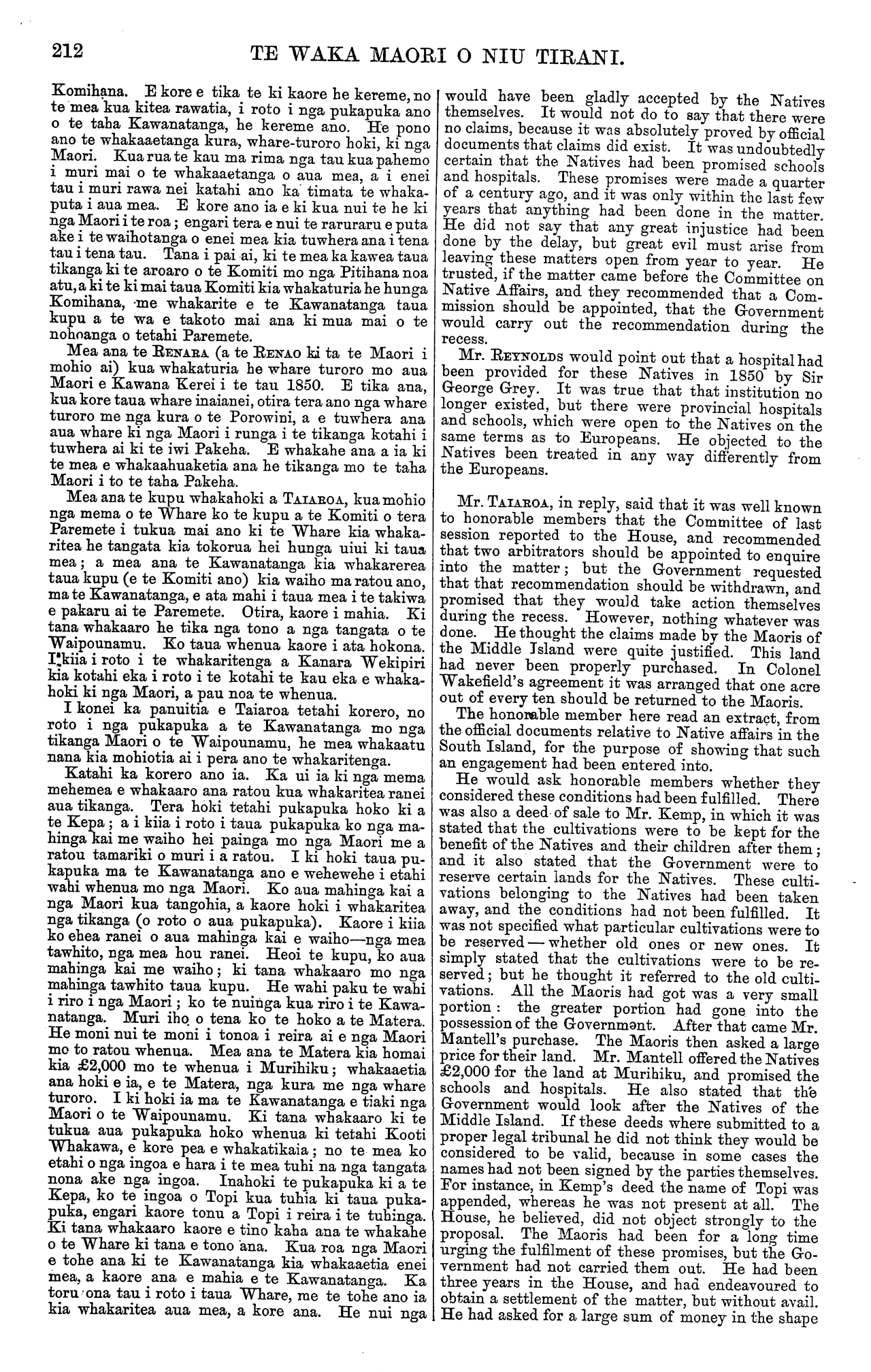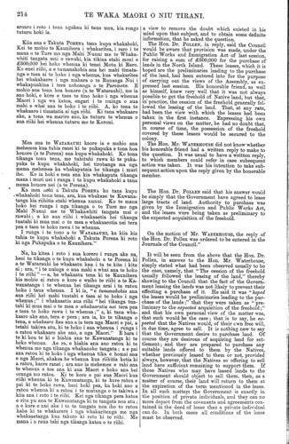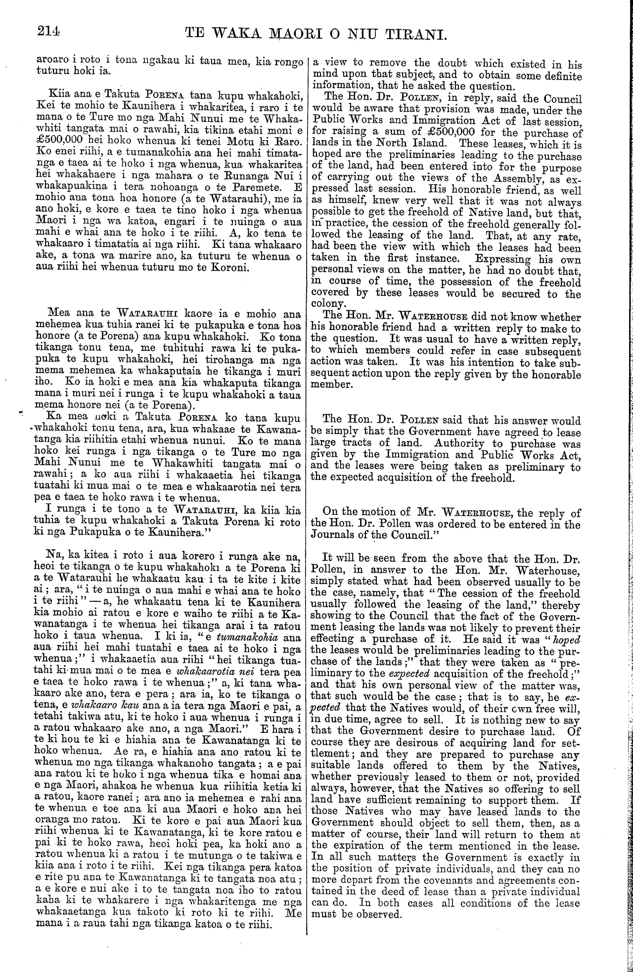 TE WAKA MAORI O NIU TIRANI. aroaro i roto i tona ngakau ki taua mea, kia rongo tuturu hoki ia. Kiia ana e Takuta PORENA tana kupu whakahoki, Kei te mohio te Kaunihera i whakaritea, i raro i te mana o te Ture mo nga Mahi Nunui me te Whaka- whiti tangata mai o rawahi, kia tikina etahi moni e £500,000 hei hoko whenua ki tenei Motu ki Raro. Ko enei riihi, a e tumanakohia ana hei mahi timata- nga e taea ai te hoko i nga whenua, kua whakaritea hei whakahaere i nga mahara o te Runanga Nui i whakapuakina i tera nohoanga o te Paremete. E mohio ana tona hoa honore (a te Watarauhi), me ia ano hoki, e kore e taea te tino hoko i nga whenua Maori i nga wa katoa, engari i te nuinga o aua mahi e whai ana te hoko i te riihi. A, ko tena te whakaaro i timataria ai nga riihi. Ki tana whakaaro ake, a tona wa marire ano, ka tuturu te whenua o aua riihi hei whenua tuturu mo te Koroni. Mea ana te WATARAUHI kaore ia e mohio ana mehemea kua tuhia ranei ki te pukapuka e tona hoa honore (a te Porena) ana kupu whakahoki. Ko tona tikanga tonu tena, me tuhituhi rawa ki te puka- puka te kupu whakahoki, hei tirohanga ma nga mema mehemea ka whakaputaia he tikanga i muri iho. Ko ia hoki e mea ana kia whakaputa tikanga mana i muri nei i runga i te kupu whakahoki a taua mema honore nei (a te Porena). Ka mea noki a Takuta PORENA. ko tana kupu whakahoki tonu tena, ara, kua whakaae te Kawana- tanga kia riihitia etahi whenua nunui. Ko te mana hoko kei runga i nga tikanga o te Ture mo nga Mahi Nunui me te Whakawhiti tangata mai o rawahi; a ko aua riihi i whakaaetia hei tikanga tuatahi ki mua mai o te mea e whakaarotia nei tera pea e taea te hoko rawa i te whenua. I runga i te tono a te WATARAUHI, ka kiia kia tuhia te kupu whakahoki a Takuta Porena ki roto ki nga Pukapuka o te Kaunihera." Na, ka kitea i roto i aua korero i runga ake na, heoi te tikanga o te kupu whakahoki a te Porena ki a te Watarauhi he whakaatu kau i ta te kite i kite ai; ara, " i te nuinga o aua mahi e whai ana te hoko i te riihi"—a, he whakaatu tena ki te Kaunihera kia mohio ai ratou e kore e waiho te riihi a te Ka- wanatanga i te whenua hei tikanga arai i ta ratou hoko i taua whenua. I ki ia, "e tumanakohia ana aua riihi hei mahi tuatahi e taea ai te hoko i nga whenua;" i whakaaetia aua riihi "hei tikanga tua- tahi ki mua mai o te mea e whakaarotia nei tera pea e taea te hoko rawa i te whenua ;" a, ki tana wha- kaaro ake ano, tera e pera ; ara ia, ko te tikanga o tena, e whakaaro kau ana a ia tera nga Maori e pai, a tetahi takiwa atu, ki te hoko i aua whenua i runga i a ratou whakaaro ake ano, a nga Maori." E hara i te ki hou te ki e hiahia ana te Kawanatanga ki te hoko whenua. Ae ra, e hiahia ana ano ratou ki te whenua mo nga tikanga whakanoho tangata ; a e pai aua ratou ki te hoko i nga whenua tika e homai ana e nga Maori, ahakoa he whenua kua riihitia ketia ki a ratou, kaore ranei; ara ano ia mehemea e rahi ana te whenua e toe ana ki aua Maori e hoko ana hei oranga mo ratou. Ki te kore o pai aua Maori kua riihi whenua ki te Kawanatanga, ki te kore ratou e pai ki te hoko rawa, heoi hoki pea, ka hoki ano a ratou whenua ki a ratou i te mutunga o te takiwa e kiia ana i roto i te riihi. Kei nga tikanga pera katoa e rite pu ana te Kawanatanga ki te tangata noa atu ; a e kore e nui ake i to te tangata noa iho to ratou kaha ki te whakarere i nga whakaritenga me nga whakaaetanga kua takoto ki roto ki te riihi. Me mana i a raua tahi nga tikanga katoa o te riihi. a view to remove the doubt which existed in his mind upon that subject, and to obtain some definite information, that he asked the question. The Hon. Dr. POLLEN, in reply, said the Council would be aware that provision was made, under the Public Works and Immigration Act of last session, for raising a sum of £500,000 for the purchase of lands in the North Island. These leases, which it is hoped are the preliminaries leading to the purchase of the land, had been entered into for the purpose of carrying out the views of the Assembly, as ex- pressed last session. His honorable friend, as well as himself, knew very well that it was not always possible to get the freehold of Native land, but that, in practice, the cession of the freehold generally fol- lowed the leasing of the land. That, at any rate, had been the view with which the leases had been taken in the first instance. Expressing his own personal views on the matter, he had no doubt that, in course of time, the possession of the freehold covered by these leases would be secured to the colony. The Hon. Mr. WATERHOUSE did not know whether his honorable friend had a written reply to make to the question. It was usual to have a written reply, to which members could refer in case subsequent action was taken. It was his intention to take sub- sequent action upon the reply given by the honorable member. The Hon. Dr. POLLEN said that his answer would be simply that the Government have agreed to lease large tracts of land. Authority to purchase was given by the Immigration and Public Works Act, and the leases were being taken as preliminary to the expected acquisition of the freehold. On the motion of Mr. WATERHOUSE, the reply of the Hon. Dr. Pollen was ordered to be entered in the Journals of the Council." It will be seen from the above that the Hon. Dr. Pollen, in answer to the Hon. Mr. Waterhouse, simply stated what had been observed usually to be the case, namely, that " The cession of the freehold usually followed the leasing of the land," thereby showing to the Council that the fact of the Govern- ment leasing the lands was not likely to prevent their effecting a purchase of it. He said it was " hoped the leases would be preliminaries leading to the pur- chase of the lands ;" that they were taken as " pre- liminary to the expected acquisition of the freehold;" and that his own personal view of the matter was, that such would be the case ; that is to say, he ex- pected that the Natives would, of their own free will, in due time, agree to sell. It is not