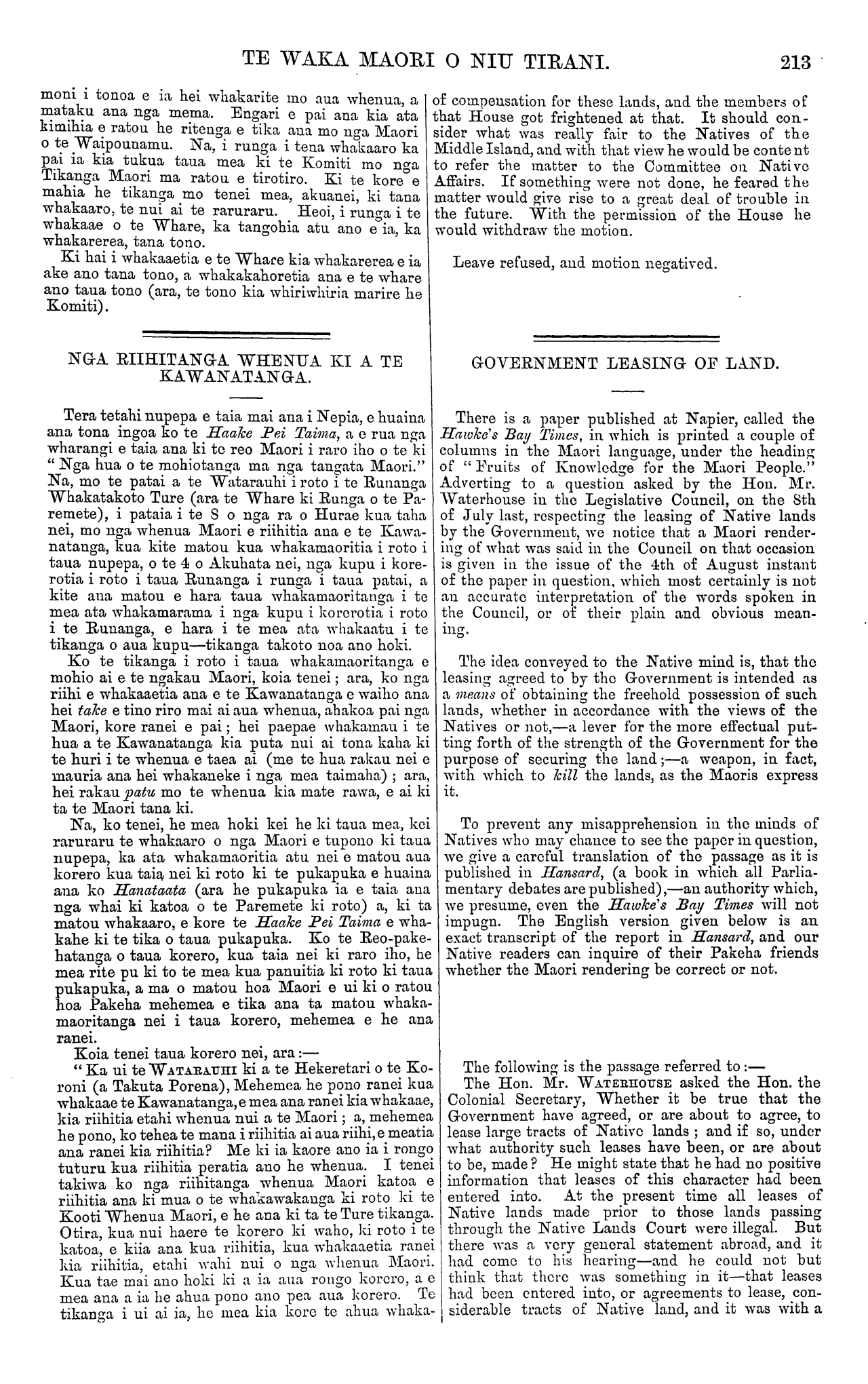 TE WAKA MAORI O NIU TIRANI. 213 moni i tonoa e ia hei whakarite mo aua whenua, a mataku ana nga mema. Engari e pai ana kia ata kimihia e ratou he ritenga e tika ana mo nga Maori o te Waipounamu. Na, i runga i tena whakaaro ka pai ia kia tukua taua mea ki te Komiti mo nga Tikanga Maori ma ratou e tirotiro. Ki te kore e mahia he tikanga mo tenei mea, akuanei, ki tana whakaaro, te nui ai te raruraru. Heoi, i runga i te whakaae o te Whare, ka tangohia atu ano e ia, ka whakarerea, tana tono. Ki hai i whakaaetia e te Whare kia whakarerea e ia ake ano tana tono, a whakakahoretia ana e te whare ano taua tono (ara, te tono kia whiriwhiria marire he Komiti). NGA RIIHITANGA WHENUA KI A TE KAWANATANGA. Tera tetahi nupepa e taia mai ana i Nepia, e huaina ana tona ingoa ko te Haake Pei Taima; a e rua nga wharangi e taia ana ki te reo Maori i raro iho o te ki " Nga hua o te mohiotanga ma nga tangata Maori." Na, mo te patai a te Watarauhi i roto i te Runanga Whakatakoto Ture (ara te Whare ki Runga o te Pa- remete), i pataia i te 8 o nga ra o Hurae kua taha nei, mo nga whenua Maori e riihitia ana e te Kawa- natanga, kua kite matou kua whakamaoritia i roto i taua nupepa, o te 4 o Akuhata nei, nga kupu i kore- rotia i roto i taua Runanga i runga i taua patai, a kite ana matou e hara taua whakamaoritanga i te mea ata whakamarama i nga kupu i korerotia i roto i te Runanga, e hara i te mea ata whakaatu i te tikanga o aua kupu—tikanga takoto noa ano hoki. Ko te tikanga i roto i taua whakamaoritanga o mohio ai e te ngakau Maori, koia tenei; ara, ko nga riihi e whakaaetia ana e te Kawanatanga e waiho ana hei take e tino riro mai ai aua whenua, ahakoa pai nga Maori, kore ranei e pai; hei paepae whakamau i te hua a te Kawanatanga kia puta nui ai tona kaha ki te huri i te whenua e taea ai (me te hua rakau nei e mauria ana hei whakaneke i nga mea taimaha) ; ara, hei rakau patu mo te whenua kia mate rawa, e ai ki ta te Maori tana ki. Na, ko tenei, he mea hoki kei he ki taua mea, kei raruraru te whakaaro o nga Maori e tupono ki taua nupepa, ka ata whakamaoritia atu nei e matou aua korero kua taia nei ki roto ki te pukapuka e huaina ana ko Hanataata (ara he pukapuka ia e taia aua nga whai ki katoa o te Paremete ki roto) a, ki ta matou whakaaro, e kore te Haake Pei Taima e wha- kahe ki te tika o taua pukapuka. Ko te Reo-pake- hatanga o taua korero, kua taia nei ki raro iho, he mea rite pu ki to te mea kua panuitia ki roto ki taua pukapuka, a ma o matou hoa Maori e ui ki o ratou hoa Pakeha mehemea e tika ana ta matou whaka- maoritanga nei i taua korero, mehemea e he ana ranei. Koia tenei taua korero nei, ara:— " Ka ui te WATARAUHI ki a te Hekeretari o te Ko- roni (a Takuta Porena), Mehemea he pono ranei kua whakaae te Kawanatanga, e mea ana ran ei kia whakaae, kia riihitia etahi whenua nui a te Maori ; a, mehemea he pono, ko tehea te mana i riihitia ai aua riihi, e meatia ana ranei kia riihitia? Me ki ia kaore ano ia i rongo tuturu kua riihitia peratia ano he whenua. I tenei takiwa ko nga riihitanga whenua Maori katoa e riihitia ana ki mua o te whakawakanga ki roto ki te Kooti Whenua Maori, e he ana ki ta te Ture tikanga. Otira, kua nui haere te korero ki waho, ki roto i te katoa, e kiia ana kua riihitia, kua whakaaetia ranei kia riihitia, etahi wahi nui o nga whenua Maori. Kua tae mai ano hoki ki a ia aua rongo korero, a e mea ana a ia he ahua pono ano pea aua korero. Te tikanga i ui ai ia, he mea kia koro te ahua whaka- of compensation for these lands, and the member's of that House got frightened at that. It should con- sider what was really fair to the Natives of the Middle Island, and with that view he would be content to refer the matter to the Committee on Native Affairs. If something were not done, he feared the matter would give rise to a great deal of trouble in the future. With the permission of the House he would withdraw the motion. Leave refused, and motion negatived. GOVERNMENT LEASING OF LAND. There is a paper published at Napier, called the Hawke's Bay Times, in which is printed a couple of columns in the Maori language, under the heading of " Fruits of Knowledge for the Maori People." Adverting to a question asked by the Hou. Mr. Waterhouse in the Legislative Council, on the 8th of July last, respecting the leasing of Native lands by the Government, we notice that a Maori render- ing of what was said in the Council on that occasion is given in the issue of the 4th of August instant of the paper in question, which most certainly is not an accurate interpretation of the words spoken in the Council, or of their plain and obvious mean- ing. The idea conveyed to the Native mind is, that the leasing agreed to by the Government is intended as a means of obtaining the freehold possession of such lands, whether in accordance with the views of the Natives or not,—a lever for the more effectual put- ting forth of the strength of the Government for the purpose of securing the land;—a weapon, in fact, with which to kill the lands, as the Maoris express it. To prevent any misapprehension in the minds of Natives who may chance to see the paper in question, we give a careful translation of the passage as it is published in Hansard, (a book in which all Parlia- mentary debates are published),—an authority which, we presume, even the Hawke's Bay Times will not impugn. The English version given below is an exact transcript of the report in Hansard, and our Native readers can inquire of their Pakeha friends whether the Maori rendering be correct or not. The following is the passage referred to :— The Hon. Mr. WATERHOUSE asked the Hon. the Colonial Secretary, Whether it be true that the Government have agreed, or are about to agree, to lease large tracts of Native lands ; and if so, under what authority such leases have been, or are about to be, made ? He might state that he had no positive information that leases of this character had been entered into. At the present time all leases of Native lands made prior 