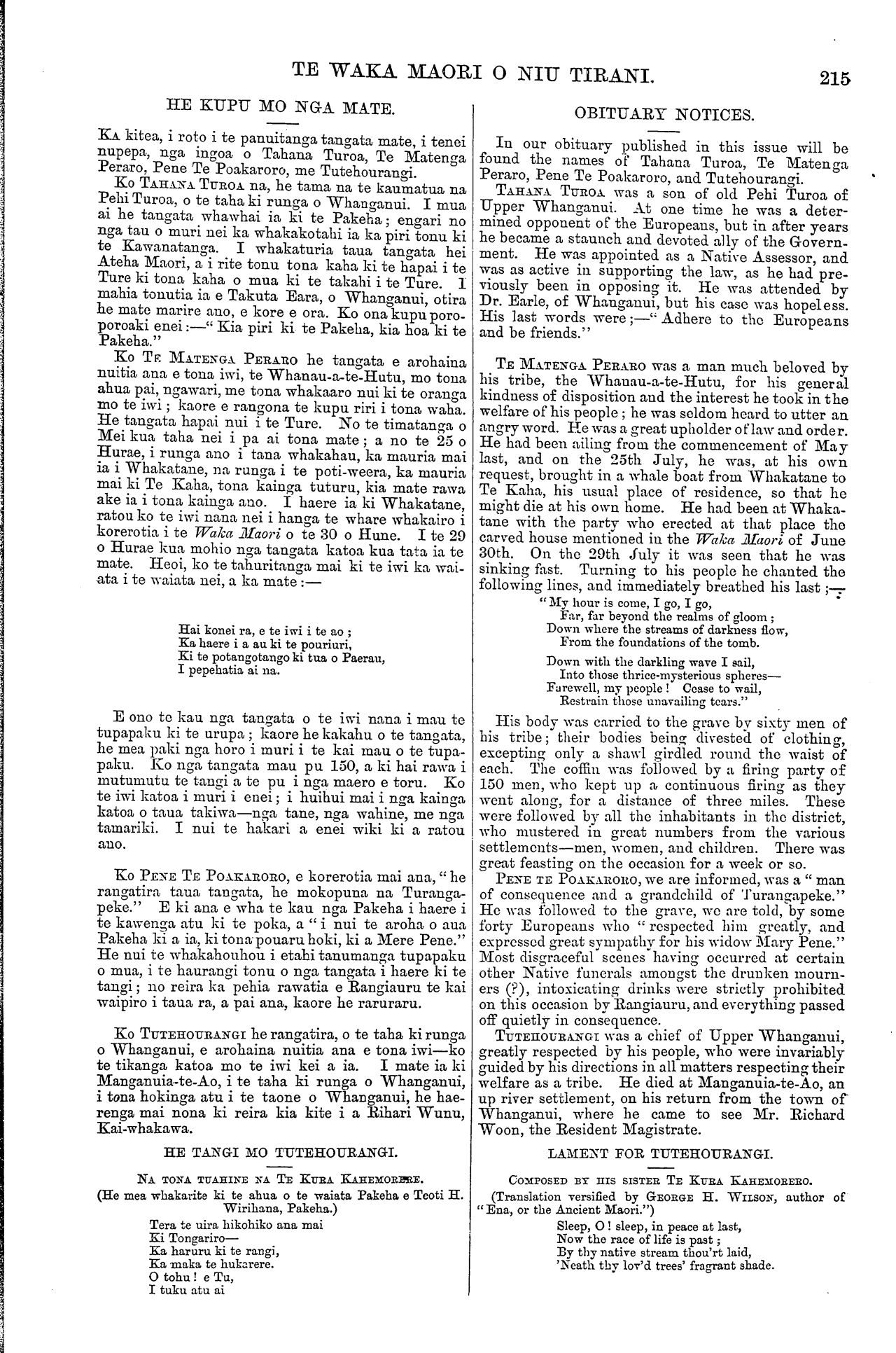 TE WAKA MAORI O NIU TIRANI 215 HE KUPU MO NGA MATE. EA kitea, i roto i te panuitanga tangata mate, i tenei nupepa, nga ingoa o Tahana Turoa, Te Matenga Peraro, Pene Te Poakaroro, me Tutehourangi. Ko TAHANA. TUROA na, he tama na te kaumatua na Pehi Turoa, o te taha ki runga o Whanganui. I mua ai he tangata whawhai ia ki te Pakeha ; engari no nga tau o muri nei ka whakakotahi ia ka piri tonu ki te Kawanatanga. I whakaturia taua tangata hei Ateha Maori, a i rite tonu tona kaha ki te hapai i te Ture ki tona kaha o mua ki te takahi i te Ture. 1 mahia tonutia ia e Takuta Eara, o Whanganui, otira he mate marire ano, e kore e ora. Ko ona kupu poro- poroaki enei:—" Kia piri ki te Pakeha, kia hoa ki te Pakeha." Ko TE MATENGA PERARO he tangata e arohaina nuitia ana e tona iwi, te Whanau-a-te-Hutu, mo tona ahua pai, ngawari, me tona whakaaro nui ki te oranga mo te iwi; kaore e rangona te kupu riri i tona waha. He tangata hapai nui i te Ture. No te timatanga o Mei kua taha nei i pa ai tona mate ; a no te 25 o Hurae, i runga ano i tana whakahau, ka mauria mai ia i Whakatane, na runga i te poti-weera, ka mauria mai ki Te Kaha, tona kainga tuturu, kia mate rawa ake ia i tona kainga ano. I haere ia ki Whakatane, ratou ko te iwi nana nei i hanga te whare whakairo i korerotia i te Waka Maori o te 30 o Hune. I to 29 o Hurae kua mohio nga tangata katoa kua tata ia te mate. Heoi, ko te tahuritanga mai ki te iwi ka wai- ata i te waiata nei, a ka mate:— Hai konei ra, e te iwi i te ao ; Ka haere i a au ki te pouriuri, Ki te potangotango ki tua o Paerau, I pepehatia ai na. E ono to kau nga tangata o te iwi nana i mau te tupapaku ki te urupa ; kaore he kakahu o te tangata, he mea paki nga horo i muri i te kai mau o te tupa- paku. Ko nga tangata mau pu 150, a ki hai rawa i mutumutu te tangi a te pu i nga maero e toru. Ko te iwi katoa i muri i enei; i huihui mai i nga kainga katoa o taua takiwa—nga tane, nga wahine, me nga tamariki. I nui te hakari a enei wiki ki a ratou ano. Ko PENE TE POAKARORO, e korerotia mai ana," he rangatira taua tangata, he mokopuna na Turanga- peke." E ki ana e wha te kau nga Pakeha i haere i te kawenga atu ki te poka, a " nui te aroha o aua Pakeha ki a ia, ki toua pouaru hoki, ki a Mere Pene." He nui te whakahouhou i etahi tanumanga tupapaku o mua, i te haurangi tonu o nga tangata i haere ki te tangi; no reira ka pehia rawatia e Rangiauru te kai waipiro i taua ra, a pai ana, kaore he raruraru. Ko TUTEHOURANGI he rangatira, o te taha ki runga o Whanganui, e arohaina nuitia ana e tona iwi—ko te tikanga katoa mo te iwi kei a ia. I mate ia ki Manganuia-te-Ao, i te taha ki runga o Whanganui, i tona hokinga atu i te taone o Whanganui, he hae- renga mai nona ki reira kia kite i a Rihari Wunu, Kai-whakawa. HE TANGI MO TUTEHOURANGI. NA TONA TUAHINE NA TE KURA KAHEMORERE. (He mea whakarite ki te ahua o te waiata Pakeha e Teoti H. Wirihana, Pakeha.) Tera te uira hikohiko ana mai Ki Tongariro— Ka haruru ki te rangi, Ka maka te hukarere. O tohu ! e Tu, I tuku atu ai OBITUARY NOTICES. In our obituary published in this issue will be found the names of Tahana Turoa, Te Matenga Peraro, Pene Te Poakaroro, and Tutehourangi. TAHANA. TUROA. was a son of old Pehi Turoa of "Upper Whanganui. At; one time he was a deter- mined opponent of the Europeans, but in after years he became a staunch and devoted ally of the Govern- ment. He was appointed as a Native Assessor, and was as active in supporting the law, as he had pre- viously been in opposing it. He was attended by Dr. Earle, of Whanganui, but his case was hopeless. His last words were ;—" Adhere to the Europeans and be friends." TE MATENGA. PERARO was a man much. beloved by his tribe, the Whanau-a-te-Hutu, for his general kindness of disposition and the interest he took in the welfare of his people ; he was seldom heard to utter an angry word. He was a great upholder of law and order. He had been ailing from the commencement of May last, and on the 25th July, he was, at his own request, brought in a whale boat from Whakatane to Te Kaha, his usual place of residence, so that he might die at his own home. He had been at Whaka- tane with the party who erected at that place the carved house mentioned in the Waka Maori of June 30th. On the 29th July it was seen that he was sinking fast. Turning to his people he chanted the following lines, and immediately breathed his last ;— " My hour is come, I go, I go, Far, far beyond the realms of gloom ; Down where the streams of darkness flow, from the foundations of the tomb. Down with the darkling wave I sail, Into those thrice-mysterious spheres— Farewell, my people ! Cease to wail, Restrain those unavailing tears." His body was carried to the grave by sixty men of his tribe; their bodies being divested of clothing, excepting only a shawl girdled round the waist of each. The coffin was followed by a firing party of 150 men, who kept up Or continuous firing as they went along, for a distance of three miles. These were followed by all the inhabitants in the district, who mustered in great numbers from the various settlements—men, women, and children. There was great feasting on the occasion for a week or so. PENE TE POAKARARO, we are informed, was a " man of consequence and a grandchild of Turangapeke." He was followed to the grave, we are told, by some forty Europeans who " respected him greatly, and expressed great sympathy for his widow Mary Pene." Most disgraceful scenes having occurred at certain other Native funerals amongst the drunken mourn- ers (?), intoxicating drinks were strictly prohibited on this occasion by Rangiauru, and everything passed off quietly in consequence. TUTEHOURANGI was a chief of Upper Whanganui, greatly respected by his people, who were invariably guided by his directions in all matters respecting their welfare as a tribe. He died at Manganuia-te-Ao, an up river settlement, on his return from the town of Whanganui, where he came to see Mr. Richard Woon, the Resident Magistra