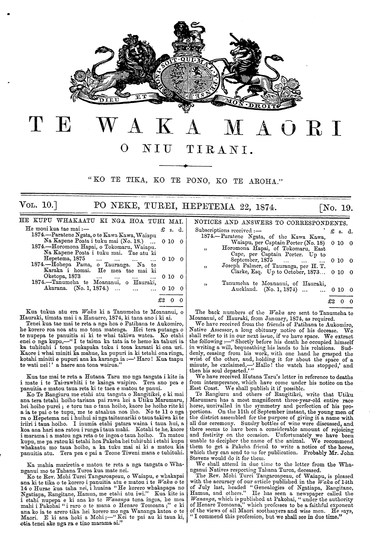 TE WAKA MAORI O NIU TIRANI. "KO TE TIKA, KO TE PONO, KO TE AROHA." VOL. 10.] PO NEKE, TUREI, HEPETEMA 22, 1874. [No. 19. HE KUPU WHAKAATU KI NGrA HOA TUHI MAI. He moni kua tae mai:— £ s. d. 1874.—Paratene Ngata, o te Kawa Kawa, Waiapu Na Kapene Poata i tuku mai (No. 18.) ... O 10 O 1874.—Horomona Hapai, o Tokomaru, Waiapu. Na Kapene Poata i tuku mai. Tae atu ki Hepetema, 1875 ... ... ... ... O 10 O 1874.—Hohepa Pama, o Tauranga. Na te Karaka i homai. He mea tae mai ki Oketopa, 1873 ... ... ... ... 010 O 1874.—Tanumeha te Moananui, o Hauraki, Akarana. (No. 1, 1874.) ... ... ... O 10 O £200 Kua tukua atu era Waka ki a Tanumeha te Moananui, o Hauraki, timata mai i a Hanuere, 1874, ki tana ano i ki ai. Tenei kua tae mai te reta a nga hoa o Patihana fce Aukomiro, he korero roa noa atu mo tona matenga. Hei tera putanga o te nupepa te panuitia ai ki te whai takiwa watea. Ko etahi enei o nga kupu,—" I te taima ka tata ia te hemo ka tahuri ia ka tuhituhi i tona pukapuka tuku i tona karaati ki ona uri. Kaore i whai miniti ka mahue, ka pupuri ia ki tetahi ona ringa, kotahi miniti e pupuri ana ka karanga ia :—' Haro' Kua taapu te wati nei!' a haere ana tona wairua." Kua tae mai te reta a Hutana Taru mo nga tangata i kite ia i mate i te Tai-rawhiti i te kainga waipiro. Tera ano pea e panuitia e matou taua reta ki te taea e matou te panui. Ko Te Rangiuru me etahi atu tangata o Rangitikei, e ki mai ana tera tetahi hoiho tariana pai rawa kei a Utiku Marumaru, hei hoiho purei; e tora tau o taua hoiho, kaore he hoiho rite ki a ia te pai o te tupu, me te ataahua noa iho. No te 11 o nga ra o Hepetema nei i huihui ai nga taitamariki o taua takiwa ki te iriiri i taua hoiho. I inumia etahi patara waina i taua hui, a koa ana hari ana ratou i runga i taua mahi. Kotahi te he, kaore i marama i a matou nga reta o te ingoa o taua hoiho. Ta matou kupu, me pa ratou ki tetahi hoa Pakeha hei tuhituhi i etahi kupu whakaatu mo taua hoiho, a ka tuku mai ai ki a matou kia panuitia atu. Tera pea e pai a Teone Tiweni mana e tuhituhi. Ka mahia mariretia e matou te reta a nga tangata o Wha- nganui mo te Tahana Turoa kua mate nei. Ko te Rev. Mohi Turei Tangaroapeau, o Waiapu, e whakapai ana ki te tika o te korero i panuitia atu e matou i te Waka o te 14 o Hurae kua taha nei, i huaina " He korero whakapapa no Ngatiapa, Rangitane, Hamua, me etahi atu iwi." Kua kite ia i etahi nupepa e ki ana ko te Wananga tona ingoa, he mea mahi i Pakohai " i raro o te mana o Henare Tomoana ;" e ki ana ko ia te arero tika hei korero mo nga Wananga katoa o te Maori. E ki ana hoki a Mohi;—" Kei te pai au ki taua ki, otia tenei ake nga ra e tino marama ai." NOTICES AND ANSWERS TO CORRESPONDENTS. Subscriptions received :— £ s. d. 1874. Paratene Ngata, of the Kawa Kawa, Waiapu, per Captain Porter (No. 18) O 10 O „ Horomona Hapai, of Tokomaru, East Cape, per Captain Porter. Up to September, 1875 ... ... ... O IO O „ Joseph Palmer, of Tauranga, per H. T. Clarke, Esq. Up to October, 1873... O IO O „ Tanumeha te Moananui, of Hauraki, Auckland. (No. 1, 187-1') ... ... O 10 O £200 The back numbers of the Waka are sent to Tanumeha te Moananui, of Hauraki, from January, 1874, as required. We have received from the friends of Patihana te Aukomiro, Native Assessor, a long obituary notice of his decease. Wo shall refer to it in our next issue, if we have space. We extract the following :—" Shortly before his death he occupied himself in writing a will, bequeathing his lands to his relations. Sud- denly, ceasing from his work, with one hand he grasped the wrist of the other, and, holding it for about the space of a minute, he exclaimed,—' Hallo! the watch has stopped,' and then his soul departed.'" Wo have received Hutana Taru's letter in reference to deaths from intemperance, which have come under his notice on the East Coast. We shall publish it if possible. Te Rangiuru and others of Rangitikei, write that Utiku Marumaru has a most magnificent three-year-old entire race horse, unrivalled in the symmetry and perfection of his pro- portions. On the 11th of September instant, the young men of the district assembled for the purpose of giving it a name with all due ceremony. Sundry bottles of wine were discussed, and there seems to have been a considerable amount of rejoicing and festivity on the occasion. Unfortunately wo have been unable to decipher the name of the animal. We recommend them to get a Pakeha friend to write a notice of the horse, which they can send to us for publication. Probably Mr. John Stevens would do it for them. We shall attend in due timu to the letter from the Wha- nganui Natives respecting Tahana Turoa, deceased. The Rev. Mohi Turei Tangaroapeau, of Waiapu, is pleased with the accuracy of our article published in the Waka of 14th of July last, headed " Genealogies of Ngatiapa, Rangitane, Hamua, and others." He has seen a newspaper called the Wananga, which is published at Pakohai, " under the authority of Henare Tomoana," which professes to be a faithful exponent of the views of all Maori soothsayers and wise men. He says, " I commend this profession, but we shall see in due time."