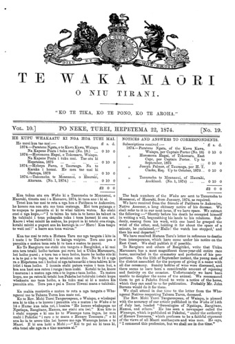 Te Waka Maori o Niu Tirani 1871-1877: Volume 10, Number 19. 22 September 1874 |
