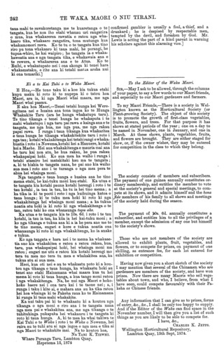 TE WAKA MAORI O NIU TIRANI. taua mahi te rawakoretanga me te kuaretanga o te tangata, kua he noa iho etahi whanau uri rangatira o mua, kua whakarerea rawatia e ratou nga wha- kaaro tika, whakaaro rangatira, tona mutunga kua whakamomori rawa. Ko te tu o te tangata kua tino riro pu tona whakaaro ki taua mahi, he porangi, he tupua-whiro, he kai waipiro ; he tangata ia e whaka- haweatia ana e nga tangata tika, e whakawaia ana e te rewera, e whakarerea ana e te Atua. Ko te Ruihi, e whakatupato nei i ona akonga ki tenei hara whakamataku, e rite ana ki tetahi matua aroha nui ki ona tamariki.] Ki a te Kai Tuhi o te Waka Maori. E HOA,—He tono taku ki a koe kia tukua etahi kupu maku ki roto ki to nupepa ki o tatou hoa Maori, ara ia, ki nga Maori whai maara, me nga Maori whai paamu. E aku hoa Maori,—Tenei tetahi hunga kei Were- ngitana nei e huaina ana tona ingoa ko te Hunga Whakakite Taru (ara he hunga whakatupu taru). Te tino tikanga o tenei hunga he whakaputa i te mahi whakatupu i nga taru pai rawa e kainga ana e te tangata, me nga hua, me nga pua, me nga rakau papai rawa. I runga i taua tikanga kua whakaritea e taua hunga he tikanga whakakitekite taru i roto i nga tau; kotahi whakakitenga kei tetahi rangi e whaka- huatia i roto i a Nowema, kotahi kei a Hanuere, kotahi kei a Maehe. Hei aua whakakitenga e mauria mai ana he taru kai noa atu, he hua rakau, he pua rakau whakapaipai hoki. Ko aua mea ka waiho i runga i tetahi atamiro hei matakitaki kau ma te tangata ; a, ki te hiahia te tangata nana, he pai ano kia waiho aua mea i roto ano i te turanga o nga mea pera te ahua hei whainga moni. Nga tangata o taua hunga e huaina ana he tino mema etahi, he kai-tuku moni kau etahi. Ka utua e te tangata kia kotahi pauna kotahi herengi i roto i te tau kotahi , ia tau ia tau, ka tu ia hei tino mema; a ka tika ia ki te pooti i roto i nga huihuinga katoa o taua hunga; ki te tuku mea hoki ki roto ki nga whakakitenga hei whainga moni mana; a ka tukua noatia atu hoki ia ki roto ki nga whakakitenga o te tau, ratou tahi ko ona whanaunga tupu ake. Ka utua e te tangata kia te 10s. 6d. i roto i te tau kotahi, ia tau ia tau, ka kiia ia hei kai-tuku moni; a ko nga tikanga e tukua ana ki a ia he pera ano me to te tino mema, engari e kore e tukua noatia ona whanaunga ki roto ki nga whakakitenga, ko ia anake e tukua. Ko nga tangata e hara nei i te mema ka whakaae- tia ano kia whakakitea e ratou a ratou rakau, hua, taru, pua whakapaipai hoki, hei whainga moni ma ratou; engari me utu e ratou kia kotahi herengi mo tera tu mea mo tera tu mea e whakakitea ana, ka tukua atu ai aua mea. Heoi, kua oti nei e au te whakaatu poto ki a kou- tou nga tikanga o taua hunga, ka whakaatu hoki au tenei ano etahi Hainamana whai maara kua tu hei mema ki roto ki taua hunga, a kua tango moni ratou i nga whakakitenga. Na, he nui nga Maori e hoko- hoko haere nei i ona taru kai i te taone nei; a, i runga i taku i kite ai, e mahara ana au ka tika ratou hei hoa whainga ki te Pakeha raua ko te Hainamana ki runga ki taua mahi whakakite. Ka nui taku pai ki te whakaatu ki a koutou nga tikanga o nga moni e riro ana i te tangata nana nga mea pai e whakakitea ana, me nga tikanga o te tuhituhinga pukapuka hei whakauru i te tangata ki roto ki taua hunga. A, ki te mea ka whai takiwa te Kai Tuhi o te Waka i roto i te Waka o Nowema, hei reira au te tuhi atu ai nga ingoa o nga mea e tika ai nga Maori te. whakakite mai. Na to koutou hoa, Na TARI K. TIEWHI. Whare Puranga Taru, Lambton Quay, Hepetema 15,1874 confirmed gambler is usually a fool, a thief, and a drunkard; he is despised by respectable men, tempted by the devil, and forsaken by God. Mr. Lewis is acting the part of a kind parent in warning his scholars against this alarming vice.] To the Editor of the Waka Maori. SIR,—May I ask to be allowed, through the columns of your paper, to say a few words to our Maori friends, and especially to our Maori gardeners and farmers. To my Maori friends,—There is a society in Wel- lington known as the Horticultural Society (or Plant-growing Society). The object of this society is to promote the growth of first-class vegetables, fruits, flowers, and trees. For that purpose it has shows at stated periods of the year ; one on a day to be named in November, one in January, and one in March. At these shows, plants, vegetables, fruits, and flowers are brought. They are either staged for show, or, if the owner wishes, they may be entered for competition in the class to which they belong. The society consists of members and subscribers. The payment of one guinea annually constitutes or- dinary membership, and entitles the member to vote at the society's general and special meetings, to com- pete at its shows, and it admits himself and the bona fide members of his family to all shows and meetings of the society held during the season. The payment of 10s. 6d. annually constitutes a subscriber, and entitles him to all the privileges of a member, except the admission of any one but himself to the society's shows. Those who are not members of the society are allowed to exhibit plants, fruit, vegetables, and flowers, or to compete for prizes, on payment of one shilling, as entrance fee, for each lot entered for exhibition or competition. Having now given you a short sketch of the society I may mention that several of the Chinamen who are gardeners are members of the society, and have won prizes. Now there are many Maoris who sell vege- tables about town, and who, I believe, from what I have seen, could compete favourably with their Pa- keha or Chinese friends. Any information that I can give as to prizes, forms of entry, &c., &c., I shall be only too happy to supply. And if the Editor of the Waka can find space in the November number, I will then give you a list of such things as you are likely to be able to compete for. I have, &c., CHARLES K. JEFFS. Wellington Horticultural Repository, Lambton Quay, 15th Sept, 1874.