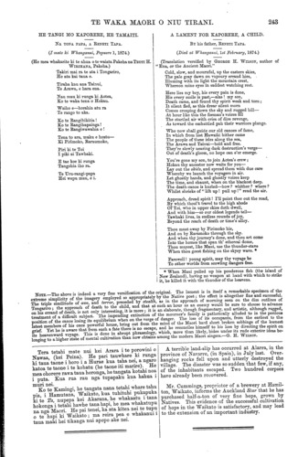 TE WAKA MAORI O NIU TIRANI. 243 HE TANGI MO KAPORERE, HE TAMAITI. NA TONA PAPA, A RENETI TAPA. (I mate ki Whanganui, Pepuere 1, 1874.) (He mea whakarite ki te ahua o te waiata Pakeha na TEOTI H. WIRIHANA, Pakeha.) Takiri mai ra te ata i Tongariro, He ata kai taua e. Tiraha kau ana Tainui, Te Arawa, e hara ena. Nau mau ki runga ki Aotea, Ko te waka tena o Hokau. Waiho e—horahia atu ra Te rango to aka. Ko te Rangihikitia! Ko te Rangihapainga! Ko te Rangiwawahia e ! Tena to ara, maku e hoatu— Ki Pirimoko, Ruraumoko, Piri ki te Toi I piki ai Tawhaki. E tae koe ki runga Tangohia iho ra. Te Uru-rangi-papa Hei wepu mau, e i. A LAMENT FOR KAPORERE, A CHILD. BY his father, RENETI TAPA. (Died at Whanganui, 1st February, 1874.) (Translation versified by GEORGE H. WILSON, author of "Ena, or the Ancient Maori." Cold, slow, and mournful, up the eastern skies, The pale gray dawn on vapoury errand skies, Illuming with its light the mountain crest, Whereon mine eyes in saddest watching rest. Here lies my boy, his every pain is done, His every smile is past,—alas ! my son, Death came, and found thy spirit weak and torn; It silent fled, as this drear silent morn Comes creeping down the sky and rugged hill— At hour like this the foeman's voices fill The startled air with cries of dire revenge, As toward the embattled pah their warriors plunge. Who now shall guide our old canoes of fame, In which from lost Hawaiki hither came The people of these isles along the sea, The Arawa and Tainui—bold and free. They're slowly nearing dark destruction's verge— Out of death's gloom, no hope can e'er emerge. You're gone my son, to join Aotea's crew; Hokau thy ancestor now waits for you— Lay out the skids, and spread them with due care Whereby we launch the voyagers in air. Let ghostly hands, and ghostly voices keep The time, and chaunt, when on the blackest deep. The death-canoe is hurled—how ? whither ? where ? Whilst shrieks of " lift up ! pull up!" rend the air. Approach, dread spirit! I'll point thee out the road, By which thoul't travel to the high abode Of Toi, who in upper skies doth dwell, And with him—so our oldest legends tell— Tawhaki lives, in endless rounds of joy, Beyond the reach of death or time's alloy. Thou must away by Pirimoko hie, And on by Raramoko through the sky. And when thy journey's done, and thou art come Into the homes that span th' ethereal dome, Thou mayest, like Maui, use the thunder-stave When thou goest fishing on the skyey wave. * Farewell! young spirit, may thy voyage be To other worlds from scowling dangers free. * When Maui pulled up his ponderous fish (the island of New Zealand), having no weapon at hand with which to strike it, he killed it with the thunder of the heavens. NOTE. The above is indeed a very free versification of the original. The lament is in itself a remarkable specimen of the extreme simplicity of the imagery employed so appropriately by the Native poet; the effect is altogether fine and successful. The triple similitude of awe, and terror, preceded by stealth, as in the approach of morning seen on the dim outlines of Tongariro the approach of death to the child, and that at such an hour as an enemy would be sure to choose to advance on his errand of death, is not only interesting, it is more ; it is an elaborate, though fragmentary, and artistic, although rugged, treatment of a difficult subject. The impending extinction of the mourner's family is pathetically alluded to in the perilous position of the canoe losing its equilibrium when on the verge of danger. The loss of its occupants, from the earliest to the latest members of his once powerful house, bring out from the mind of the Maori bard short broken sobbings of the keenest grief Yet he is aware that from such a fate there is no escape, and he reconciles himself to his loss by directing the spirit on its heavenward voyage. This is done in abrupt phraseology, which, more than likely, hides under its rude exterior ideas be- longing to a higher state of mental cultivation than now obtains among the modem Maori singers.—G. H. WILSON. Tera tetahi mate nui kei Arara i te porowini o Nawaa, (kei Peina). He pari tauwhare ki runga ki taua taone i horo i a Hurae kua taha nei, a ngaro katoa te taone i te kohatu (he taone iti marire). He mea ohorere rawa taua horonga, he tangata kotahi noa i puta. Kua rua rau nga tupapaku kua hahua i muri nei. Ko te Kamingi, he tangata nana tetahi whare tahu pia, i Hamutana, Waikato, kua tuhituhi pukapuka ki te Ta, nupepa kei Akarana, he whakaatu i tana hokonga i tetahi hawhe tana hapi, he mea whakatupu na nga Maori. He pai tenei, ka ata kitea nei te tupu o te hapi ki Waikato ; ma reira pea e whakanui i taua mahi hei tikanga nui apopo ake nei. A terrible land-slip has occurred at Alarra, in the province of Navarre, (in Spain), in July last. Over- hanging rocks fell upon and utterly destroyed the village. The disaster was so sudden that few, if any, of the inhabitants escaped. Two hundred corpses have already been recovered. Mr. Cummings, proprietor of a brewery at Hamil- ton, Waikato, informs the Auckland Star that he has purchased half-a-ton of very fine hops, grown by Natives. This evidence of the successful cultivation of hops in the Waikato is satisfactory, and may lead to the extension of an important industry.