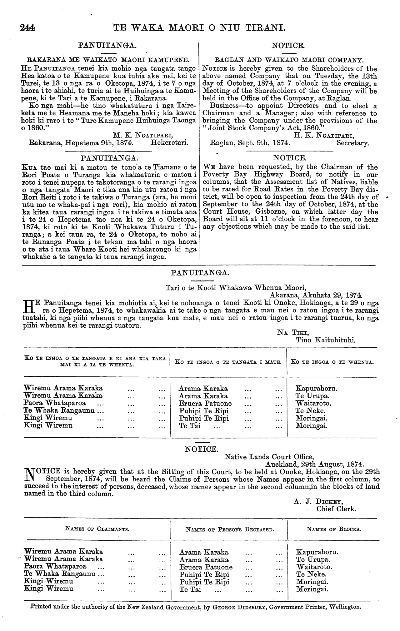TE WAKA MAORI O NIU TIRANI. PANUITANGA. RAKARANA. ME WAIKATO MAORI KAMUPENE. HE PANUITANGA tenei kia mohio nga tangata tango Hea katoa o te Kamupene kua tuhia ake nei, kei te Turei, te 13 o nga ra o Oketopa, 1874, i te 7 o nga haora i te ahiahi, te turia ai te Huihuinga a te Kamu- pene, ki te Tari a te Kamupene, i Rakarana. Ko nga mahi—he tino whakatuturu i nga Taire- keta me te Heamana me te Maneha hoki; kia kawea hoki ki raro i te " Ture Kamupene Huihuinga Taonga o I860." M. K. NGATIPARI, Rakarana, Hepetema 9th, 1874. Hekeretari. PANUITANGA. KUA tae mai ki a matou te tono a te Tiamana o te Rori Poata o Turanga kia whakaaturia e matou i roto i tenei nupepa te takotoranga o te rarangi ingoa o nga tangata Maori e tika ana kia utu rato u i nga Rori Reiti i roto i te takiwa o Turanga (ara, he moni utu mo te whaka-pai i nga rori), kia mohio ai ratou ka kitea taua rarangi ingoa i te takiwa e timata ana i te 24 o Hepetema tae noa ki te 24 o Oketopa, 1874, ki roto ki te Kooti Whakawa Tuturu i Tu- ranga; a kei taua ra, te 24 o Oketopa, te noho ai te Runanga Poata i te tekau ma tahi o nga haora o te ata i taua Whare Kooti hei whakarongo ki nga whakahe a te tangata ki taua rarangi ingoa. NOTICE. RAGLAN AND WAIKATO MAORI COMPANY. NOTICE is hereby given to the Shareholders of the above named Company that on Tuesday, the 13th day of October, 1874, at 7 o'clock in the evening, a Meeting of the Shareholders of the Company will be held in the Office of the Company, at Raglan. Business—to appoint Directors and to elect a Chairman and a Manager; also with reference to bringing the Company under the provisions of the " Joint Stock Company's Act, I860." H. K. NGATIPARI, Raglan, Sept. 9th, 1874. Secretary. NOTICE. WE have been requested, by the Chairman of the Poverty Bay Highway Board, to notify in our columns, that the Assessment list of Natives, liable to be rated for Road Rates in the Poverty Bay dis- trict, will be open to inspection from the 24th day of September to the 24th day of October, 1874, at the Court House, Gisborne, on which latter day the Board will sit at 11 o'clock in the forenoon, to hear any objections which may be made to the said list. PANUITANGA. Tari o te Kooti Whakawa Whenua Maori, Akarana, Akuhata 29, 1874. HE Panuitanga tenei kia mohiotia ai, kei te nohoanga o tenei Kooti ki Onoke, Hokianga, a te 29 o nga ra o Hepetema, 1874, te whakawakia ai te take o nga tangata e mau nei o ratou ingoa i te rarangi tuatahi, ki nga piihi whenua a nga tangata kua mate, e mau nei o ratou ingoa i te rarangi tuarua, ko nga piihi whenua kei te rarangi tuatoru. NA TIKI, Tino Kaituhituhi. KO TE INGOA O TE TANGATA E KI ANA EIA TAKA MAI KI A IA TE WHENUA. Wiremu Arama Karaka Wiremu Arama Karaka Paora Whataparoa Te Whaka Rangaunu ... Kingi Wiremu Kingi Wiremu KO TE INGOA O TE TANGATA I MATE. Arama Karaka Arama Karaka Eruera Patuone Puhipi Te Ripi Puhipi Te Ripi Te Tai KO TE INGOA O TE WHENUA. Kapurahoru. Te Urupa. Waitaroto. Te Neke. Moringai. Moringai. NOTICE. Native Lands Court Office, Auckland, 29th August, 1874. NOTICE is hereby given that at the Sitting of this Court, to be held at Onoke, Hokianga, on the 29th September, 1874, will be heard the Claims of Persons whose Names appear in the first column, to succeed to the interest of persons, deceased, whose names appear in the second column, in the blocks of land named in the third column. A. J. DICKEY, Chief Clerk. NAMES OF ClAIMANTS. Wiremu Arama Karaka Wiremu Arama Karaka Paora Whataparoa Te Whaka Rangaunu ... Kingi Wiremu Kingi Wiremu NAMES or PERSONS DECEASED. Arama Karaka Arama Karaka Eruera Patuone Puhipi Te Ripi Puhipi Te Ripi Te Tai NAMES OF BLOCKS. Kapurahoru. Te Urupa. Waitaroto. Te Neke. Moringai. Moringai. Printed under the authority of the New Zealand Government, by GEORGE DIDSBURY, Government Printer, Wellington.