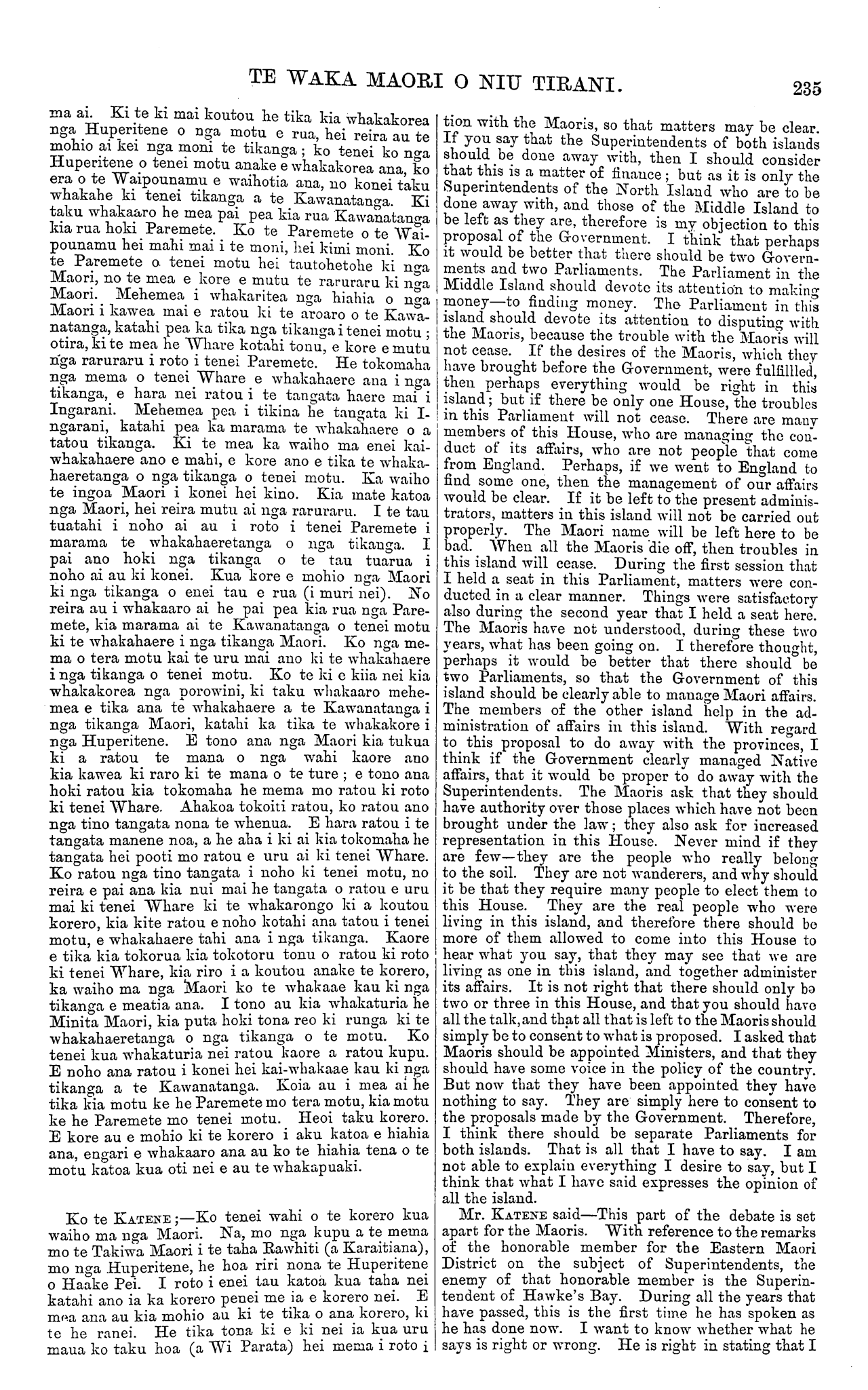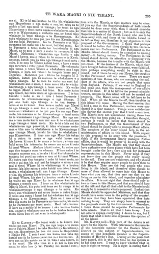TE WAKA MAORI O NIU TIRANI. 235 ma ai. Ki te ki mai koutou he tika kia whakakorea nga Huperitene o nga motu e rua, hei reira au te mohio ai kei nga moni te tikanga ; ko tenei ko nga Huperitene o tenei motu anake e whakakorea ana, ko era o te Waipounamu e waihotia ana, no konei taku whakahe ki tenei tikanga a te Kawanatanga. Ki taku whakaaro he mea pai pea kia rua Kawanatanga kia rua hoki Paremete. Ko te Paremete o te Wai- pounamu hei mahi mai i te moni, hei kimi moni. Ko te Paremete o. tenei motu hei tautohetohe ki nga Maori, no te mea e kore e mutu te raruraru ki nga Maori. Mehemea i wha.karitea nga hiahia o nga Maori i kawea mai e ratou ki te aroaro o te Kawa- natanga, katahi pea ka tika nga tikanga i tenei motu ; otira, ki te mea he Whare kotahi tonu, e kore e mutu nga raruraru i roto i tenei Paremete. He tokomaha nga mema o tenei Whare e whakahaere ana i nga tikanga, e hara nei ratou i te tangata haere mai i Ingarani. Mehemea pea i tikina he tangata ki I- ngarani, katahi pea ka marama te whakahaere o a tatou tikanga. Ki te mea ka waiho ma enei kai- whakahaere ano e mahi, e kore ano e tika te whaka- haeretanga o nga tikanga o tenei motu. Ka waiho te ingoa Maori i konei hei kino. Kia mate katoa nga Maori, hei reira mutu ai nga raruraru. I te tau tuatahi i noho ai au i roto i tenei Paremete i marama te whakahaere.tanga o nga tikanga. I pai ano hoki nga tikanga o te tau tuarua i noho ai au ki konei. Kua kore e mohio nga Maori ki nga tikanga o enei tau e rua (i muri nei). No reira au i whakaaro ai he pai pea kia rua nga Pare- mete, kia marama ai te Kawanatanga o tenei motu ki te whakahaere i nga tikanga Maori. Ko nga me- ma o tera motu kai te uru mai ano ki te whakahaere i nga tikanga o tenei motu. Ko te ki e kiia nei kia whakakorea nga porowini, ki taku whakaaro mehe- mea e tika ana te whakahaere a te Kawanatanga i nga tikanga Maori, katahi ka tika te whakakore i nga Huperitene. E tono ana nga Maori kia tukua ki a ratou te mana o nga wahi kaore ano kia kawea ki raro ki te mana o te ture ; e tono ana hoki ratou kia tokomaha he mema mo ratou ki roto ki tenei Whare. Ahakoa tokoiti ratou, ko ratou ano nga tino tangata nona te whenua. E hara ratou i te tangata manene noa, a he aha i ki ai kia tokomaha he tangata hei pooti mo ratou e uru ai ki tenei Whare. Ko ratou nga tino tangata i noho ki tenei motu, no reira e pai ana kia nui mai he tangata o ratou e uru mai ki tenei Whare ki te whakarongo ki a koutou korero, kia kite ratou e noho kotahi ana tatou i tenei motu, e whakahaere tahi ana i nga tikanga. Kaore e tika kia tokorua kia tokotoru tonu o ratou ki roto ki tenei Whare, kia riro i a koutou anake te korero, ka waiho ma nga Maori ko te whakaae kau ki nga tikanga e meatia ana. I tono au kia whakaturia he Minita Maori, kia puta hoki tona reo ki runga ki te whakahaeretanga o nga tikanga o te motu. Ko tenei kua whakaturia nei ratou kaore a ratou kupu. E noho ana ratou i konei hei kai-whakaae kau ki nga tikanga a te Kawanatanga. Koia au i mea ai he tika kia motu ke he Paremete mo tera motu, kia motu ke he Paremete mo tenei motu. Heoi taku korero. E kore au e mohio ki te korero i aku katoa e hiahia ana, engari e whakaaro ana au ko te hiahia tena o te motu katoa kua oti nei e au te whakapuaki. Ko te KATENE ;—Ko tenei wahi o te korero kua waiho ma nga Maori. Na, mo nga kupu a te mema mo te Takiwa Maori i te taha Rawhiti (a Karaitiana), mo nga Huperitene, he hoa riri nona te Huperitene o Haake Pei. I roto i enei tau katoa kua taha nei katahi ano ia ka korero penei me ia e korero nei. E mea ana au kia mohio au ki te tika o ana korero, ki te he ranei. He tika tona ki e ki nei ia kua uru maua ko taku hoa (a Wi Parata) hei mema i roto i tion with the Maoris, so that matters may be clear. If you say that the Superintendents of both islands should be done away with, then I should consider that this is a matter of finance ; but as it is only the Superintendents of the North Island who are to be done away with, and those of the Middle Island to be left as they are, therefore is my objection to this proposal of the Government. I think that perhaps it would be better that there should be two Govern- ments and two Parliaments. The Parliament in the Middle Island should devote its attention to making money—to finding money. The Parliament in this island should devote its attention to disputing with the Maoris, because the trouble with the Maoris will not cease. If the desires of the Maoris, which they have brought before the Government, were fulfilled, then perhaps everything would be right in this island; but if there be only oue House, the troubles in this Parliament will not cease. There are many members of this House, who are managing the con- duct of its affairs, who are not people that come from England. Perhaps, if we went to England to find some one, then the management of our affairs would be clear. If it be left to the present adminis- trators, matters in this island will not be carried out properly. The Maori name will be left here to be bad. When all the Maoris die off, then troubles in this island will cease. During the first session that I held a seat in this Parliament, matters were con- ducted in a clear manner. Things were satisfactory also during the second year that I held a seat here. The Maoris have not understood, during these two years, what has been going on. I therefore thought, perhaps it would be better that there should be two Parliaments, so that the Government of this island should be clearly able to manage Maori affairs. The members of the other island help in the ad- ministration of affairs in this island. With regard to this proposal to do away with the provinces, I think if the Government clearly managed Native affairs, that it would be proper to do away with the Superintendents. The Maoris ask that they should have authority over those places which have not been brought under the law; they also ask for increased representation in this House. Never mind if they are few—th