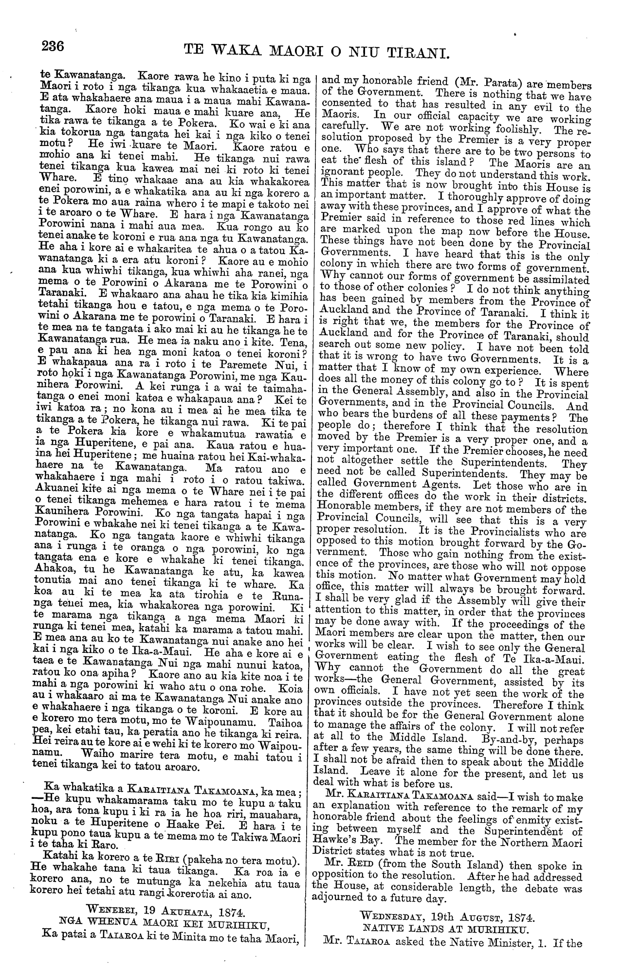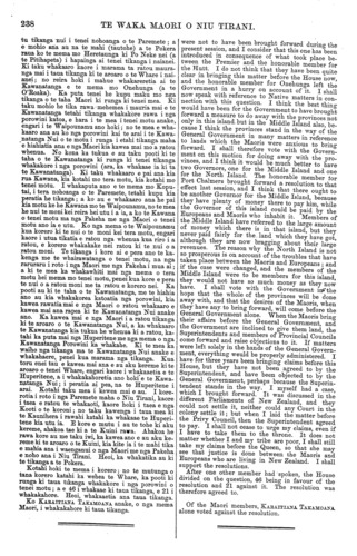 236 TE WAKA MAORI O NIU TIRANI. te Kawanatanga. Kaore rawa he kino i puta ki nga Maori i roto i nga tikanga kua whakaaetia e maua. E ata whakahaere ana maua i a maua mahi Kawana- tanga. Kaore hoki maua e mahi kuare ana, He I tika rawa te tikanga a te Pokera. Ko wai e ki ana kia tokorua nga tangata hei kai i nga kiko o tenei motu ? He iwi kuare te Maori. Kaore ratou e mohio ana ki tenei mahi. He tikanga nui rawa tenei tikanga kua kawea mai nei ki roto ki tenei Whare. E tino whakaae ana au kia whakakorea enei porowini, a e whakatika ana au ki nga korero a te Pokera mo aua raina whero i te mapi e takoto nei i te aroaro o te Whare. E hara i nga Kawanatanga Porowini nana i mahi aua mea. Kua rongo au ko tenei anake te koroni e rua ana nga tu Kawanatanga. He aha i kore ai e whakaritea te ahua o a tatou Ka- wanatanga ki a era atu koroni ? Kaore au e mohio ana kua whiwhi tikanga, kua whiwhi aha ranei, nga mema o te Porowini o Akarana me te Porowini o Taranaki. E whakaaro ana ahau he tika kia kimihia tetahi tikanga hou e tatou, e nga mema o te Poro- wini o Akarana me te porowini o Taranaki. E hara i te mea na te tangata i ako mai ki au he tikanga he te Kawanatanga rua. He mea ia naku ano i kite. Tena, e pau ana ki hea nga moni katoa o tenei koroni? E whakapaua ana ra i roto i te Paremete Nui, i roto hoki i nga Kawanatanga Porowini, me nga Kau- nihera Porowini. A kei runga i a wai te taimaha- tanga o enei moni katoa e whakapaua ana ? Kei te iwi katoa ra ; no kona au i mea ai he mea tika te tikanga a te Pokera, he tikanga nui rawa. Ki te pai a te Pokera kia kore e whakamutua rawatia e ia nga Huperitene, e pai ana. Kaua ratou e hua- ina hei Huperitene; me huaina ratou hei Kai-whakahaere na te Kawanatanga. Ma ratou ano e whakahaere i nga mahi i roto i o ratou takiwa. Akuanei kite ai nga mema o te Whare nei i te pai o tenei tikanga mehemea e hara ratou i te mema Kaunihera Porowini. Ko nga tangata hapai i nga Porowini e whakahe nei ki tenei tikanga a te Kawa- natanga. Ko nga tangata kaore e whiwhi tikanga ana i runga i te oranga o nga porowini, ko nga tangata ena e kore e whakahe ki tenei tikanga. Ahakoa, tu he Kawanatanga ke atu, ka kawea tonutia mai ano tenei tikanga ki te whare. Ka koa au ki te mea ka ata tirohia e te Runa- nga tenei mea, kia whakakorea nga porowini. Ki te marama nga tikanga a nga mema Maori ki runga ki tenei mea, katahi ka marama a tatou mahi. E mea ana au ko te Kawanatanga nui anake ano hei kai i nga kiko o te Ika-a-Maui. He aha e kore ai e taea e te Kawanatanga Nui nga mahi nunui katoa, ratou ko ona apiha ? Kaore ano au kia kite noa i te mahi a nga porowini ki waho atu o ona rohe. Koia au i whakaaro ai ma te Kawanatanga Nui anake ano e whakahaere i nga tikanga o te koroni. E kore au e korero mo tera motu, mo te Waipounamu. Taihoa pea, kei etahi tau, ka peratia ano he tikanga ki reira. Hei reira au te kore ai e wehi ki te korero mo Waipou- namu. Waiho marire tera motu, e mahi tatou i tenei tikanga kei to tatou aroaro. Ka whakatika a KARAITIANA TAKAMOANA, ka mea; —He kupu whakamarama taku mo te kupu a taku hoa, ara tona kupu i ki ra ia he hoa riri, mauahara, noku a te Huperitene o Haake Pei. E hara i te kupu pono taua kupu a te mema mo te Takiwa Maori i te taha ki Raro. Katahi ka korero a te RIRI (pakeha no tera motu). He whakahe tana ki taua tikanga. Ka roa ia e korero ana, no te mutunga ka nekehia atu taua korero hei tetahi atu rangi korerotia ai ano. WENEREI, 19 AKUHATA, 1874. NGA WHENUA MAORI KEI MURIHIKU, Ka patai a TAIAROA ki te Minita mo te taha Maori, and my honorable friend (Mr. Parata) are members of the Government. There is nothing that we have consented to that has resulted in any evil to the Maoris. In our official capacity we are working carefully. We are not working foolishly. The re- solution proposed by the Premier is a very proper one. Who says that there are to be two persons to eat the flesh of this island ? The Maoris are an ignorant people. They do not understand this work. This matter that is now brought into this House is an important matter. I thoroughly approve of doing away with these provinces, and I approve of what the Premier said in reference to those red lines which are marked upon the map now before the House. These things have not been done by the Provincial Governments. I have heard that this is the only colony in which there are two forms of government. Why cannot our forms of government be assimilated to those of other colonies ? I do not think anything has been gained by members from the Province of Auckland and the Province of Taranaki. I think it is right that we, the members for the Province of Auckland and for the Province of Taranaki, should search out some new policy. I have not been told that it is wrong to have two Governments. It is a matter that I know of my own experience. Where does all the money of this colony go to ? It is spent in the General Assembly, and also in the Provincial Governments, and in the Provincial Councils. And who bears the burdens of all these payments ? The people do; therefore I think that the resolution moved by the Premier is a very proper one, and a very important one. If the Premier chooses, he need not altogether settle the Superintendents. They need not be called Superintendents. They may be called Government Agents. Let those who are in the different offices do the work in their districts. Honorable members, if they are not members of the Provincial Councils, will see that this is a very proper resolution. It is the Provincialists who are opposed to this motion brought forward by the Go- vernment. Those who gain nothing from the exist- ence of the provinces, are those who will not oppose this motion. No matter what Government may hold office, this matter will always be brought forward. I shall be very glad if the Assembly will give their attention to this matter, in order that the provinces may be done away with. If the proceedings of the Maori members are clear upon the matter, then our works will be 