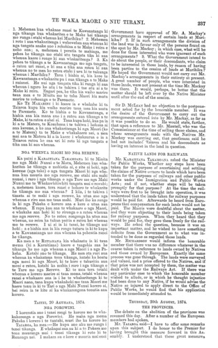 TE WAKA MAORI O NIU TIRANI. 237 1. Mehemea kua whakaae ranei te Kawanatanga ki nga tikanga kua whakaritea e te Make hei tikanga mo runga i etahi whenua kei Murihiku ? 2. Mehemea i roto i aua whakaritenga i wehewehea aua whenua ki nga tangata anake ano i rokohina e te Make i reira e noho ana; a, mehemea i peratia te mahinga, me pehea he tikanga mo etahi atu tangata tika ki aua whenua kaore i rongo ki aua whakaritenga ? 3. Ka pehea te tikanga a te Kawanatanga mo nga tangata o ratou uri ranei, e ki ana e tika ana ratou ki aua whenua no te mea ko ratou etahi i uru Id te tukunga whenua i Murihiku ? Tana i hiahia a.i, kia kore te Kawanatanga e whakarite pu i aua tikanga a to Make i naianei. He nui nga tangata tika ki runga ki aua whenua i ngaro ke atu i te takiwa i tae atu ai a te Make ki reira. Engari pea, ho tika kia waiho marire taua mea e te Minita mo to taha Maori kia mutu marire te nohoanga o te Paremete. Ko TE MAKARINI i ki kaore ia e whakahe Id ta Taiaroa kupu Ida waiho marire taua mea kia mutu te Paremete. Ko te hiahia o to Kawanatanga, e hiahia ana kia mana ano i a ratou aua tikanga a te Make, ki ta ratou e ahei ai. Tana kupu hoki, kua pa ia ki a te Matera, te Komihana i te takiwa i hokona ai aua kereme, a ko ana whakaritenga ki nga Maori (ko a te Matera) ta te Make e whakahaere nei, a mea mai ana te Matera ki a ia kaore i whakaurua e ia a Taiaroa ratou ko ona uri ki roto ki nga tangata o tika ana ki aua whenua. NGA. WHENUA MAORI MO NGA REREWE. Ka patai a KARAITIANA TAKAMOANA ki to Minita mo nga Mahi Nunui o te Motu, Mehemea kua wha- karitea he tikanga e mohiotia ai, e rite ai hoki, nga kereme (nga ta.ke.) o nga tangata Maori ki nga whe- nua kua mauria mo nga rerewe, me etahi atu mahi nunui, i raro i nga tikanga o nga Ture mo nga Mahi Nunui nae te Whakawhitiwhiti taumata mai o rawahi; a mehemea kaore, tera ranei o hohoro te whakarite he tikanga mo aua whenua, ? I kiia, i to takiwa i timata ai te mahi i nga rerewe, ka utua ano nga whenua e riro aua mo taua mahi. Muri iho ka rongo ia ki nga Pakeha e korero ana e kore e utua aua whenua. E rapu kau aua te whakaaro o nga Maori, e whakahe ana hoki ki te rironga o a ratou whenua mo nga rerewe. No to ratou rongonga ka utua aua whenua, no reira ka tukua paitia e ratou hei whenua mo te rerewe. I ui ai ia ki tenei, ho tikanga, nui hoki; a e hiahia ana ia kia rongo tuturu ia ki te kupu a te Kawanatanga mo aua whenua ka peheatia ranei he tikanga. Ka mea a te RITIAHANA kia whakaatu ia ki taua mema (ki a Karaitiana) kaore e tangohia ana he tikanga ke mo nga whenua a nga Maori i a nga Pa- keha. Kotahi ano te tikanga. He mea ata ruri aua whenua ka whakataua tona tikanga, katahi ka hoatu nga moni Id nga Maori, ki te koro e tahuritia aua moni e ratou, katahi ka mahia i raro i nga tikanga o te Ture mo nga Rerewe. Ki te mea tera, tetahi whenua e korero marire ai taua mema, tetahi whenua ranei e whakaaro ana ia i he te whakaritenga ki te Maori nana, tana kupu whakahoki mo taua Maori me haere tonu ia ki te Tari o nga Mahi Nunui korero ai, hei reira ia te kite ai ka whakarongona tonutia aua korero. TAITEI, 20 AKUHATA, 187-1. NGA POROWINI. I korerotia ano i tenei rangi te korero mo te wha- kakorenga o nga Porowini. He maha nga mema Pakeha i korero i te tuatahi, muri iho ka korero ko TAIAROA, ka mea: He kupu ano aku mo runga i tenei tikanga. E whakapai ana au ki a to Pokera mo tona mauranga mai i tenei tikanga ki roto Ia te Runanga nei. I mahara au e kore e mauria mai enei Government have approved of Mr. A. Mackay's arrangements in respect of certain lands at Muri- kihu? 2. If in such arrangements the division of the land was in favour only of the persons found on the spot by Mr. Mackay; in which case, what will be done for those interested who were ignorant of such arrangements ? 3. What the Government intend to do about the people, or their descendants, who claim to be interested in those lands, by reason of having been parties to the cession of lands at Murihiku? He hoped the Government would not carry out Mr. Mackay's arrangements in their entirety at present. A great number of people, who were interested in those lands, were not present at the time Mr. Mackay was there. It would, perhaps, be better that the matter should be left; over by the Native Minister until after the cud of the session. Sir D. MCLEAN had no objection to the postpone- ment asked for by the honorable member. It was the desire of the Government to carry out the arrangements entered into by Mr. Mackay, as far as it was possible to do so. He would state, further, that upon a reference to Mr. Mantell, who was the Commissioner at; the time of selling those claims, and whose arrangements made with the Natives Mr. Mackay was carrying out, that gentleman said he had not included Taiaroa and his descendants as having an interest in the land in question. NATIVE LANDS FOR RAILWAYS. Mr. KARAITIANA. TAKAMOANA asked the Minister for Public Works, Whether any steps have been taken for the purpose of ascertaining and settling the claims of Native owners to lands which have been taken for the purposes of railways and other public works under the Immigration and Public Works Acts; and if not, whether steps will be taken promptly for that purpose ? At the time the rail- ways were first to be brought into operation, it was understood that the lands taken for railway purposes would be paid for. Afterwards he heard from Euro- peans that compensation for such lands would not be paid. The Maoris were doubtful about the matter, and they were objecting to their lands being taken for railway purposes. When they heard that they would bo paid for, they gave them freely for the rail- ways. Ho asked the question, because it was an important matter, and he wished to have something definite from the Government as to what was in- tended to be done as regarded those lands. Mr. RICHARDSON would inform the honorable member that there was no difference whatever in the course taken in reference to lands owned by Natives a
