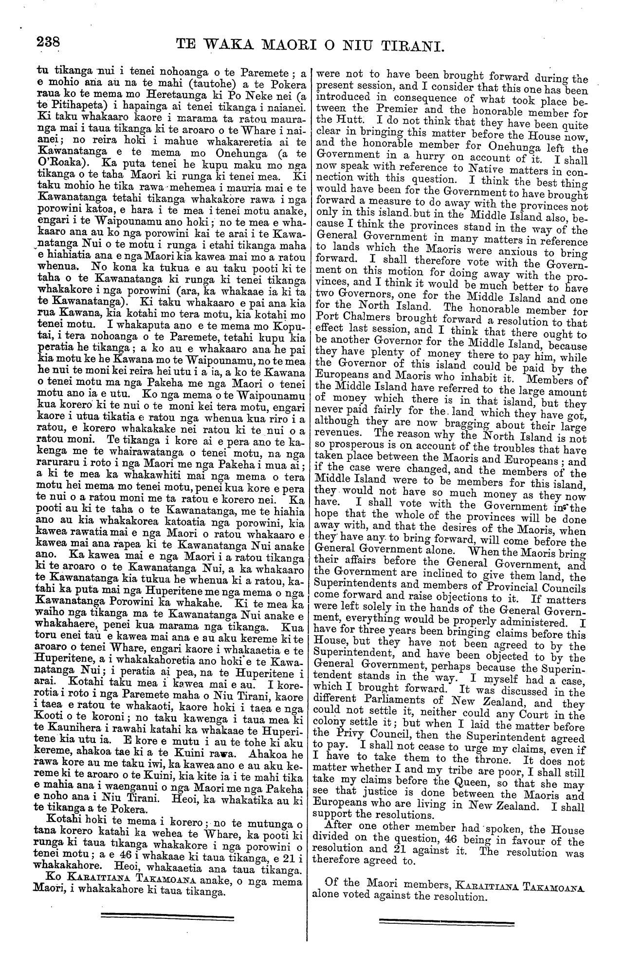 238 TE WAKA MAORI O NIU TIRANI. tu tikanga nui i tenei nohoanga o te Paremete ; a e mohio aria au na te mahi (tautohe) a te Pokera raua ko te mema mo Heretaunga ki Po Neke nei (a te Pitihapeta) i hapainga ai tenei tikanga i naianei. Ki taku whakaaro kaore i marama ta ratou maura- nga mai i taua tikanga ki te aroaro o te Whare i nai- anei; no reira hoki i mahue whakareretia ai te Kawanatanga e te mema mo Onehunga (a te O'Roaka). Ka puta tenei he kupu maku mo nga tikanga o te taha Maori ki runga ki tenei mea. Ki taku mohio he tika rawa mehemea i mauria mai e te Kawanatanga tetahi tikanga whakakore rawa i nga porowini katoa, e hara i te mea i tenei motu anake, engari i te Waipounamu ano hoki; no te mea e wha- kaaro ana au ko nga porowini kai te arai i te Kawa- natanga Nui o te motu i runga i etahi tikanga maha e hiahiatia ana e nga Maori kia kawea mai mo a ratou whenua. No kona ka tukua e au taku pooti ki te taha o te Kawanatanga ki runga ki tenei tikanga whakakore i nga porowini (ara, ka whakaae ia ki ta te Kawanatanga). Ki taku whakaaro e pai ana kia rua Kawana, kia kotahi mo tera motu, kia kotahi mo tenei motu. I whakaputa ano e te mema mo Kopu- tai, i tera nohoanga o te Paremete, tetahi kupu kia peratia he tikanga; a ko au e whakaaro ana he pai kia motu ke he Kawana mo te Waipounamu, no te mea he nui te moni kei reira hei utu i a ia, a ko te Kawana o tenei motu ma nga Pakeha me nga Maori o tenei motu ano ia e utu. Ko nga mema o te Waipounamu kua korero ki te nui o te moni kei tera motu, engari kaore i utua tikatia e ratou nga whenua kua riro i a ratou, e korero whakakake nei ratou ki te nui o a ratou moni. Te tikanga i kore ai e pera ano te ka- kenga me te whairawatanga o tenei motu, na nga raruraru i roto i nga Maori me nga Pakeha i mua ai; a ki te mea ka whakawhiti mai nga mema o tera motu hei mema mo tenei motu, penei kua kore e pera te nui o a ratou moni me ta ratou e korero nei. Ka pooti au ki te taha o te Kawanatanga, me te hiahia ano au kia whakakorea katoatia nga porowini, kia kawea rawatia mai e nga Maori o ratou whakaaro e kawea mai ana rapea ki te Kawanatanga Nui anake ano. Ka kawea mai e nga Maori i a ratou tikanga ki te aroaro o te Kawanatanga Nui, a ka whakaaro te Kawanatanga kia tukua he whenua ki a ratou, ka- tahi ka puta mai nga Huperitene me nga mema o nga Kawanatanga Porowini ka whakahe. Ki te mea ka waiho nga tikanga ma te Kawanatanga Nui anake e whakahaere, penei kua marama nga tikanga. Kua toru enei tau e kawea mai ana e au aku kereme kite aroaro o tenei Whare, engari kaore i whakaaetia e te Huperitene, a i whakakahoretia ano hoki e te Kawa- natanga Nui; i peratia ai pea, na te Huperitene i arai. Kotahi taku mea i kawea mai e au. I kore- rotia i roto i nga Paremete maha o Niu Tirani, kaore i taea e ratou te whakaoti, kaore hoki i taea e nga Kooti o te koroni; no taku kawenga i taua mea ki te Kaunihera i rawahi katahi ka whakaae te Huperi- tene kia utu ia. E kore e mutu i au te tohe ki aku kereme, ahakoa tae ki a te Kuini rawa. Ahakoa he rawa kore au me taku iwi, ka kawea ano e au aku ke- reme ki te aroaro o te Kuini, kia kite ia i te mahi tika e mahia ana i waenganui o nga Maori me nga Pakeha e noho ana i Niu Tirani. Heoi, ka whakatika au ki te tikanga a te Pokera. Kotahi hoki te mema i korero ; no te mutunga o tana korero katahi ka wehea te Whare, ka pooti ki runga ki taua tikanga whakakore i nga porowini o tenei motu; a e 46 i whakaae ki taua tikanga, e 21 i whakakahore. Heoi, whakaaetia ana taua tikanga. Ko KARAITIANA TAKAMOANA anake, o nga mema Maori, i whakakahore ki taua tikanga. were not to have been brought forward during the present session, and I consider that this one has been introduced in consequence of what took place be- tween the Premier and the honorable member for the Huti. I do not think that they have been quite clear in bringing this matter before the House now, and the honorable member for Onehunga left the Government in a hurry on account of it. I shall now speak with reference to Native matters in con- nection with this question. I think the best thing would have been for the Government to have brought forward a measure to do away with the provinces not only in this island but in the Middle Island also, be- cause I think the provinces stand in the way of the General Government in many matters in reference to lands which the Maoris were anxious to bring forward. I shall therefore vote with the Govern- ment on this motion for doing away with the pro- vinces, and I think it would be much better to have two Governors, one for the Middle Island and one for the North Island. The honorable member for Port Chalmers brought forward a resolution to that effect last session, and I think that there ought to be another Governor for the Middle Island, because they have plenty of money there to pay him, while the Governor of this island could be paid by the Europeans and Maoris who inhabit it. Members of the Middle Island have referred to the large amount of money which there is in that island, but they never paid fairly for the. land which they have got, although they are now bragging about their large revenues. The reason why the North Island is not so prosperous is on account of the troubles that have taken place between the Maoris and Europeans ; and if the case were changed, and the members of the Middle Island were to be members for this island, they would not have so much money as they now have. I shall vote with the Government in the hope that the whole of the provinces will be done away with, and that the desires of the Maoris, when they have any. to bring forward, will come before the General Government alone. When the Maoris bring their affairs before the General Government, and the Government are inclined to give them land, the Superintendents and members of Provincial Councils were left solely in the hands of the General Govern- ment, everything would be properly administered. I have for three years been bringing claims before this House, but 