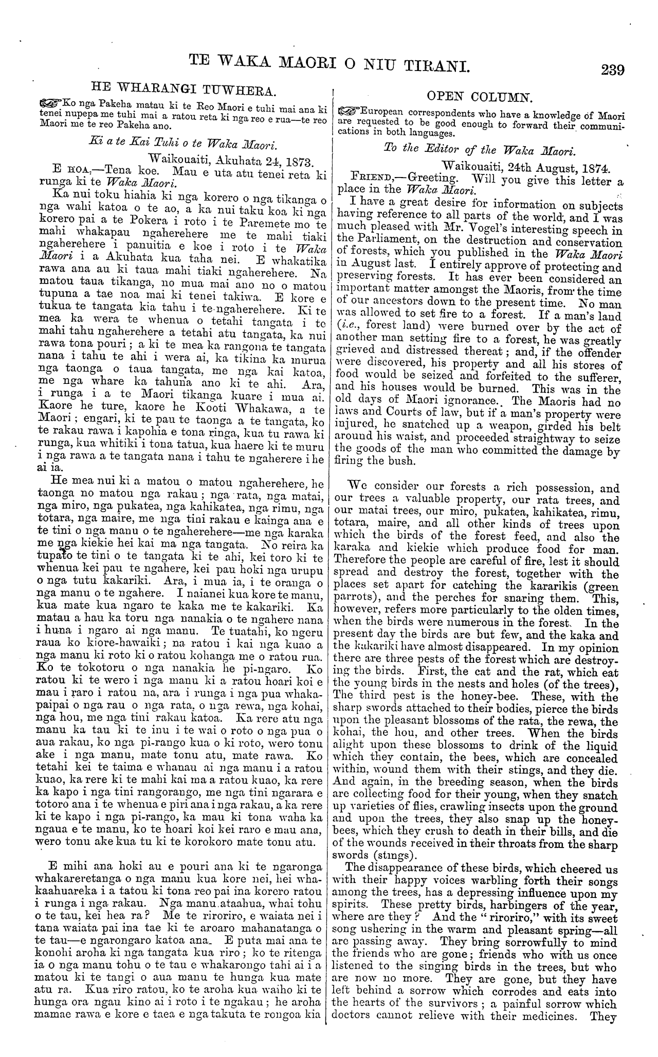 TE WAKA MAORI O NIU TIRANI. 239 HE WHARANGI TUWHERA. I Ko nga Pakeha matau ki te Reo Maori e tuhi mai ana ki tenei nupepa me tuhi mai a ratou reta ki nga reo e rua—te reo Maori me te reo Pakeha ano. Ki a te Kai Tuhi o te Waka Maori. Waikouaiti, Akuhata 24, 1873. E HOA;—Tena koe. Mau e uta atu tenei reta ki runga ki te Waka Maori. Ka nui toku hiahia ki nga korero o nga tikanga o nga wahi katoa o te ao, a ka nui taku koa ki nga korero pai a te Pokera i roto i te Paremete mo te mahi whakapau ngaherehere me te mahi tiaki ngaherehere i panuitia e koe i roto i te Waka Maori i a Akuhata kua taha nei. E whakatika rawa ana au ki taua mahi tiaki ngaherehere. Na I matou taua tikanga, no mua mai ano no o matou tupuna a tae noa mai ki tenei takiwa. E kore e tukua te tangata kia tahu i te ngaherehere. Ki te mea ka wera te whenua o tetahi tangata i te mahi tahu ngaherehere a tetahi atu tangata, ka nui rawa tona pouri ; a ki te mea ka rangona te tangata nana i tahu te ahi i wera ai, ka tikina ka murua nga taonga o taua tangata, me nga kai katoa, me nga whare ka tahuna ano ki te ahi. Ara, | i runga i a te Maori tikanga kuare i mua ai. Kaore he ture, kaore he Kooti Whakawa, a te Maori ; engari, ki te pau te taonga a te tangata, ko te rakau rawa i kapohia e tona ringa, kua tu rawa ki runga, kua whitiki i tona tatua, kua haere ki te muru i nga rawa a te tangata nana i tahu te ngaherere i he ai ia. He mea nui ki a matou o matou ngaherehere, he taonga no matou nga rakau ; nga rata, nga matai, nga miro, nga pukatea, nga kahikatea, nga rimu, nga totara, nga maire, me nga tini rakau e kainga aua e te tini o nga manu o te ngaherehere—me nga karaka I me nga kiekie hei kai ma nga tangata. No reira ka tupato te tini o te tangata ki te ahi, kei toro ki te whenua kei pau te ngahere, kei pau hoki nga urupu o nga tutu kakariki. Ara, i mua ia, i te oranga o nga manu o te ngahere. I naianei kua kore te manu, kua mate kua ngaro te kaka me te kakariki. Ka matau a hau ka toru nga nanakia o te ngahere nana i huna i ngaro ai nga manu. Te tuatahi, ko ngeru raua ko kiore-hawaiki; na. ratou i kai nga kuao a nga manu ki roto ki o ratou kohanga me o ratou rua. Ko te tokotoru o nga nanakia he pi-ngaro. Ko ratou ki te wero i nga manu ki a ratou hoari koi e mau i raro i ratou na, ara i runga i nga pua whaka- paipai o nga rau o nga rata. o nga rewa, nga kohai, nga hou, me nga tini rakau katoa. Ka rore atu nga manu ka tau ki te inu i te wai o roto o nga pua o aua rakau, ko nga pi-rango kua o ki roto, wero tonu ake i nga manu, mate tonu atu, mate rawa. Ko tetahi kei te taima e whanau ai nga manu i a ratou kuao, ka rere ki te mahi kai ma a ratou kuao, ka rere ka kapo i nga tini rangorango, me nga tini ngarara e totoro ana i te whenua e piri ana i nga rakau, a ka rere ki te kapo i nga pi-rango, ka mau ki tona waha ka ngaua e te manu, ko te hoari koi kei raro e mau ana, wero tonu ake kua tu ki te korokoro mate tonu atu. E mihi ana hoki au e pouri ana, ki te ngaronga whakareretanga o nga manu kua kore nei, hei wha- kaahuareka i a tatou ki tona reo pai ina korero ratou i runga i nga rakau. Nga manu, ataahua, whai tohu o te tau, kei hea ra ? Me te riroriro, e waiata nei i tana waiata pai ina tae ki te aroaro mahanatanga o te tau—e ngarongaro katoa ana. E puta mai ana te konohi aroha ki nga tangata kua riro ; ko te ritenga ia o nga manu tohu o te tau e whakarongo tahi ai i a matou ki te tangi o aua manu te hunga kua mate atu ra. Kua riro ratou, ko te aroha kua. waiho ki te hunga ora ngau kino ai i roto i te ngakau ; he aroha mamae rawa e kore e taea e nga takuta te rongoa kia OPEN COLUMN. European correspondents who have a knowledge of Maori are requested to be good enough to forward their communi- cations in both languages. To the Editor of the Waka Maori. Waikouaiti, 24th August, 1874. FRIEND,—Greeting. Will you give this letter a place in the Waka. Maori. I have a great desire for information on subjects having reference to all parts of the world, and I was much pleased with Mr. Vogel's interesting speech in the Parliament, on the destruction and conservation of forests, which you published in the Waka Maori in August last. I entirely approve of protecting and preserving forests. It has ever been considered an important matter amongst the Maoris, from the time of our ancestors down to the present time. No man was allowed to set fire to a forest. If a man's land (i.e., forest land) were burned over by the act of another man setting tire to a forest, he was greatly grieved and distressed thereat; and, if the offender were discovered, his property and all his stores of food would be seized and forfeited to the sufferer, and his houses would be burned. This was in the old days of Maori ignorance.. The Maoris had no laws and Courts of law, but if a man's property were injured, he snatched up a weapon, girded his belt around his waist, and proceeded straightway to seize the goods of the man who committed the damage by firing the bush. We consider our forests a rich possession, and our trees a valuable property, our rata trees, and our matai trees, our miro, pukatea, kahikatea, rimu, totara, maire, and all other kinds of trees upon which the birds of the forest feed, and also the karaka and kiekie which produce food for man. Therefore the people are careful of fire, lest it should spread and destroy the forest, together with the places set apart for catching the kararikis (green parrots), and the perches for snaring them. This, however, refers more particularly to the olden times, when the birds were numerous in the forest. In the present day the birds are but few, and the kaka and the kakariki have almost disappeared. In my opinion there are three pests of the forest which are destroy- ing the birds. First, the cat and the rat, which eat the young birds in the nests and holes (of the trees), The third pest is the honey-bee. These, with the sharp swords attached to their bodies, pierce the birds upon the pleasant blossoms of the rata, the