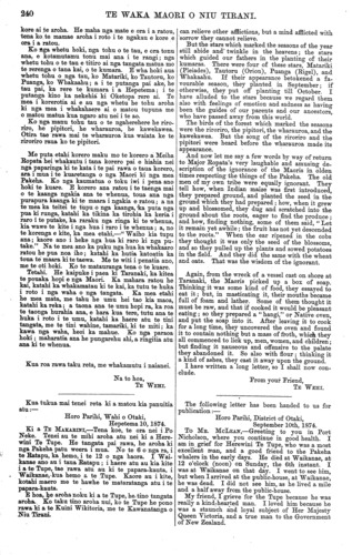 240 TE WAKA MAORI O NIU TIRANI. kore ai te aroha. He maha nga mate e ora i a ratou, tena ko.te mamae aroha i roto i te ngakau e kore e ora i a ratou. Ko nga whetu hoki, nga tohu o te tau, e ora tonu ana, e kotamutamu tonu mai ana i te rangi; nga whetu tohu o te tau e titiro ai nga tangata matua mo te rerenga o tana kai, o te kumara. E wha hoki aua whetu tohu o nga tau, ko Matariki, ko Tautoru, ko Puanga, ko Whakaahu; a i te putanga pai ake, he tau pai, ka rere te kumara i a Hepetema; i te putanga kino ka nekehia ki Oketopa rere ai. Te mea i korerotia ai e au nga whetu he tohu aroha ki nga mea i whakahaere ai o matou tupuna me o matou matua kua ngaro atu nei i te ao. Ko nga manu tohu tau o te ngaherehere he riro- riro, he pipitori, he wharauroa, he kawekawea. Otira tae rawa mai te wharauroa kua waiata ke te riroriro raua ko te pipitori. Me puta etahi korero maku mo te korero a Meiha Ropata hei whakautu i tana korero pai e hiahia nei nga paparinga ki te kata i te pai rawa o taua korero, ara i mua i te kuaretanga o nga Maori ki nga mea Pakeha. Ko nga kaumatua o toku iwi i pena ano hoki te kuare. E korero ana ratou i te taenga mai o te kaanga ngakia ana te whenua, toua ana nga purapura kaanga ki te maara i ngakia e ratou; a na te mea ka teitei te tupu o nga kaanga, "ka puta nga pua ki runga, katahi ka tikina ka tirohia ka keria i raro i te putake, ka raraku nga ringa ki te whenua, kia wawe te kite i nga hua i raro i te whenua; a, no te korenga e kite, ka mea etahi,—" Waiho kia tupu ana; kaore ano i heke nga hua ki raro ki nga pu- take." Na te mea ano ka puku nga hua ka whakaaro ratou he pua noa iho; katahi ka hutia katoatia ka toua te maara ki te taewa. Me te witi i penatia ano, me te oti hoki. Ko te matauranga tena o te kuare. Tetahi. He kaipuke i paea ki Taranaki, ka kitea te pouaka hopi e nga Maori. Ka mahara ratou he kai, katahi ka whakamatau ki te kai, ka tutu te huka i roto i nga waha o nga tangata. Ka mea etahi he mea mata, me tahu he umu hei tao kia maoa, katahi ka reka; a taona ana te umu hopi ra, ka roa te taonga hurahia ana, e hara kua tere, tutu ana te huka i roto i te umu, katahi ka haere atu te tini tangata, me te tini wahine, tamariki, ki te miti; ka kawa nga waha, heoi ka mahue. Ko nga paraoa hoki; maharatia ana he pungarehu ahi, a ringitia atu ana ki te whenua. Kua roa rawa taku reta, me whakamutu i naianei. Na to hoa, TE WEHI. Kua tukua mai tenei reta ki a matou kia panuitia atu:— Horo Parihi, Wahi o Otaki, Hepetema 10,1874. Ki a TE MAKARINI,—Tena koe, te ora nei i Po Neke. Tenei au te mihi aroha atu nei ki a Here- wini Te Tupe. He tangata pai rawa, he aroha ki nga Pakeha patu weera i mua. No te 6 o nga ra, i te Ratapu, ka hemo, i te 12 o nga haora. I Wai- kanae ano au i taua Ratapu ; i haere atu au kia kite i a te Tupe, tae rawa atu au ki te papara-kauta, i Waikanae, kua hemo a te Tupe. Kaore au i kite, kotahi maero me te hawhe te mataratanga atu i te papara-kauta. E hoa, he aroha noku ki a te Tupe, he. tino tangata aroha. Ko taku tino aroha nui, ko te Tupe he pono rawa ki a te Kuini Wikitoria, me te Kawanatanga o Niu Tirani. can relieve other afflictions, but a mind afflicted with sorrow they cannot relieve. But the stars which marked the seasons of the year still abide and twinkle in the heavens; the stars which guided our fathers in the planting of their kumaras. There were four of these stars, Matariki (Pleiades), Tautoru (Orion), Puanga (Rigel), and Whakaahu. If their appearance betokened a fa- vourable season, they planted in September; if otherwise, they put off planting till October. I have alluded to the stars because we regard them also with feelings of emotion and sadness as having been the guides of our parents and our ancestors, who have passed away from this world. The birds of the forest which marked the seasons were the riroriro, the pipitori, the wharauroa, and the kawekawea. But the song of the riroriro and the pipitori were heard before the wharauroa made its appearance. And now let me say a few words by way of return to Major Ropata's very laughable and amusing de- scription of the ignorance of the Maoris in olden times respecting the things of the Pakeha. The old men of my own tribe were equally ignorant. They tell how, when Indian maize was first introduced, they prepared ground, and planted the seed in the ground which they had prepared ; how, when it grew up and blossomed, they dug and scratched into the ground about the roots, eager to find the produce ; and how, finding nothing, some of them said, " Let it remain yet awhile; the fruit has not yet descended to the roots." When the ear ripened in the cobs they thought it was only the seed of the blossoms, and so they pulled up the plants and sowed potatoes in the field. And they did the same with the wheat and oats. That was the wisdom of the ignorant. Again, from the wreck of a vessel cast on shore at Taranaki, the Maoris picked up a box of soap. Thinking it was some kind of food, they essayed to eat it; but, in masticating it, their mouths became full of foam and lather. Some of them thought it must be raw, and that if cooked it would be pleasant eating ; so they prepared a "hangi," or Native oven, and put the soap into it. After leaving it to cook for a long time, they uncovered the oven and found it to contain nothing but a mass of froth, which they all commenced to lick up, men, women, and children; but finding it nauseous and offensive to the palate they abandoned it. So also with flour ; thinking it a kind of ashes, they cast it away upon the ground. I have written a long letter, so I shall now con- clude. From your Friend, TE WEHI. The following letter has been handed to us for publication:— Horo Parihi, District of Otaki, September 10th, 1874. To ME. MCLEAN,—Greeting to you in Port Nicholson, where you continue in good health. I am in grief for Herewini Te Tupe, who was a most excellent man, and a good friend to the Pakeha whalers in the early days. He died at Waikanae, at 12 o'cl