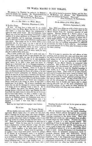 TE WAKA MAORI O NIU TIRANI. 241 Mo apopo, i te Parairei, ka nehuai; ko Makiwi- remu he minita hei karakia. Ko Ngatiraukawa ka hui atu i te tanumanga i a te Tupe. Heoi ano. Na TAMIHANA TE RAUPARAHA. Ki a te Kai Tuhi o te Waka Maori. Matatera, Hepetema 6, 1874 E TE KAI TUHI, E hoa. E kore koe e tuku mai ki au tetahi takiwa i roto i te Waka Maori, kia uru ai he korero ako maku i o taua hoa Maori kia whakamutua e ratou te mahi purei kaari. He kai-whakaako kura Maori au, a he nui nga pouritanga rawatanga o taku ngakau ki te ahua ngoikore, tu a hiamoe nei, o etahi o nga tamariki, me te ngaronga rawatanga atu o etahi e taea ano te haere ma.i mehemea e ngakau pera ana ratou. Kua rongo au ko ta ratou mahi, a aua tamariki nei, he oho tonu i te roa o nga po ki te purei kaari; a na taua mahi oho roa, i roto ano hoki i nga whare pumahumahu rawa, na reira i pera ai ratou me taku kua kiia i runga ake nei. A, ko te mea tino he, he purei moni ta ratou mahi, he mea ano ko a ratou kahu rawa ano. Na, e kitea noatia ana nga he e puta mai ana i roto i tenei mahi, nga he ano ki nga tangata ake ano e mahi ana i taua mahi, me nga he ki nga tangata e matakitaki ana; a ka tino tohe au ki nga rangatira, me nga matua, me nga kaumatua o te iwi, kia kaha rawa ratou ki te pehi i taua mahi kia mutu ai. Kaore au e wareware ana ki te tikanga-koretanga o te iwi Maori, ara te kore tikanga whakangahau, rite ki a tatou nei ki a te Pakeha. Otira ki te mea ka hihiri ratou ki te tango i nga tikanga pai e hiahiatia ana e te Kawanatanga kia hoatu ki a ratou, a ka ako ratou ki te korero pukapuka reo Pakeha, katahi ka rite ki te mea he ao hou tonu e tuwhera ana hei tiro- hanga mo ratou, hei ahuarekatanga mo ratou. Katahi ka tika ratou te noho ki te taha o te ahi korero puka- puka ai i nga mea miharo nui kaore ano i rangona e ratou i mua atu, a ka rongo ai ratou ki nga mahi e mahia ana i te ao katoa. Ki te mea e tumanako ana ratou kia nui ake he tikanga ki a ratou o nga tikanga o te motu, na ko te tikanga tenei e taea ai. Ki te mea e hiahia ana ratou kia whiwhi ratou ki nga painga katoa e whiwhi nei tatou nga Pakeha, kia ora tonu hoki kia kaha tonu to ratou iwi hei iwi ki te ao, kia tu tonu hoki ratou i te taha o tetahi o nga iwi tino marama tino matau tino kaha o te ao katoa (ara, ko te Pakeha), penei me whakarere rawa atu e ratou nga mea katoa e whakangoikore ana i te tangata, a e kore e taro kua taea e ratou aua tikanga. Heoi ra, koi kapi hoki te nupepa i enei korero. Na to hoa Na TAMATI RUIHI. [E tino hiahia rawa ana matou ki nga tamariki o nga kura Maori katoa atu o te motu nei kia kore ratou e taringa hoi ki nga kupu ako, kupu whakatu- pato, i roto i te reta kua taia ki runga ake nei. Tena ano e mohio ratou heoi rawa te tikanga i puta ai aua kupu he aroha ki a ratou, he mea kia kite ratou i te ora. Tena pea rat.ou kai te whakaaro he mea noa te purei kaari. Otira ko tena mea ko te purei, ki te kore e whakarerea e ratou, akuanei e tupu ake ana o ratou tinana e tupu tahi ake ana hoki taua he i roto i o ratou ngakau, a ka kaha haere tonu hei tikanga i roto i a ratou. Kaore rawa he ngatanga o te ngakau i roto i taua mahi purei; kaore he painga ki te tinana, ki te hinengaro ranei, o te tangata i roto i taua mahi. Ko te tikanga o taua mahi he, ki ta te iwi Pakeha i kitea ai tona tikanga, he whakatupu i te mangere, i te tahae, me te haurangi me te tini- hanga noatanga atu, i roto i nga tangata ware ; a, i roto i te hunga ahua rangatira, kua haere tahi i He will be buried to-morrow, Friday, and the Rev. J. McWilliam will officiate. The Ngatiraukawa tribe will attend the funeral. This is all. From TAMIHANA TE RAUPARAHA. To the Editor of the Waka Maori. Matatera, September 6, 1874. SIR,—Will you oblige me with a little space in the Waka Maori to endeavour to dissuade some of our Maori friends from the excessive practice of card playing. Having charge of a Native school, I am often pained to observe the sleepy listlessness of some of the pupils, and the absence of others who I think might attend. I am informed that they are in the habit of sitting up most of the night playing cards, and this in a stifling atmosphere is sufficient to account for what I above refer to. And perhaps the worst feature of it is they play for money, or even for their clothing. Now it is easy to perceive the evil effects of this practice, both on those who play and those who look on, and I would earnestly urge on the chiefs, parents, and elders, to do all in their power to discourage such practices. I am not unmindful of the disad- vantages of our Maori friends, as compared with ourselves. But if they will avail themselves of the advantages the Government are anxious to put in their way, and learn to read the English language, a new world, as it were, of entertainment would be opened up to them. They could sit by their fireside and read of wonders they never heard of before, and learn what is going on in all parts of the world. If they are anxious for larger political privileges this is the way to obtain them. If they would wish to en- joy all the advantages we ourselves enjoy—to pre- serve their race in health and vigour, and to stand side by side with one of the most enlightened and powerful nations of the earth, let them abandon all enervating habits and they may soon attain to it. Trusting the above will not be too great an intru- sion on your space, I am, &c., THOMAS LEWIS. [We do sincerely hope that the pupils attending the various Native schools throughout the country will not turn a deaf ear to the words of advice and warning contained in the above letter. They must feel that such words can only emanate from an affec- tionate desire for their welfare. Possibly they think a game of cards is a very innocent matter. But gambling, if they do not shake off the habit, is a vice which will grow with their growth and become, as it were, a part of their very nature. Gambling leaves no satisfaction behind it; it in no way profits either body or mind. Among Europ