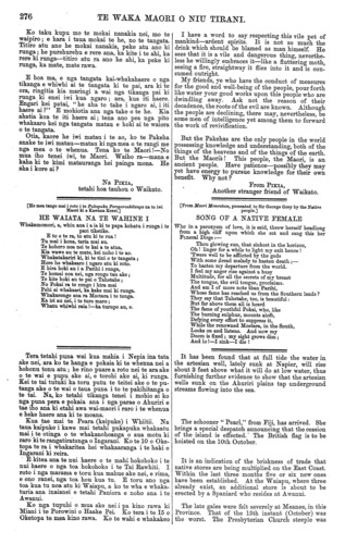 276 TE WAKA MAORI O NIU TIRANI. Ko taku kupu mo te mokai nanakia nei, mo te waipiro; e hara i taua mokai te he, no te tangata. Titiro atu ano he mokai nanakia, peke atu ano ki runga; he purehurehu e rere ana, ka kite i te ahi, ka rere ki runga—titiro atu ra ano he ahi, ka peke ki runga, ka mate, mate rawa. E hoa ma, e nga tangata kai-whakahaere o nga tikanga e whiwhi ai te tangata ki te pai, ara ki te ora, ringitia kia maringi "a wai nga tikanga pai ki runga ki enei iwi kua ngaro ; ara, kua iti haere. Engari kei patai, " he aha te take i ngaro ai, i iti haere ai?" E mohiotia ana nga take o te he. Kia ahatia koa te iti haere ai; tena ano pea nga pito whakaaro kei nga tangata matau e hoki ai te waiora o te tangata. Otia, kaore he iwi matau i te ao, ko te Pakeha anake te iwi matau—matau ki nga mea o te rangi me nga mea o te whenua. Tena ko te Maori!—No mua iho tenei iwi, te Maori. Waiho ra—mana e kaha ki te kimi matauranga hei painga mona. He aha i kore ai ? Na PIKIA, tetahi hoa tauhou o Waikato. [He mea tango mai i roto i te Pukapuka, Poroporoakitanga na ta iwi Maori ki a Kawana Kerei.] HE WAIATA NA TE WAHINE I Whakamomori, a, whiu ana i a ia ki te papa kohatu i runga i te pari tiketike. E to e te ra, to atu ki te rua! Tu mai i kona, taria mai au. Te hohoro noa nei te kai a te atua, Kia wawe au te mate, kei noho i te ao. Whakatakariri ki, ki te tini o te tangata ; Hore he whakaaro i ngaro atu ki roto. E hira hoki au i a Parihi i runga, Te homai noa nei, nga rongo tau ake; Te kite hoki au te pai o Tahetahe ; No Pokai ra te rongo i hira mai Pehi ai whakaari, ka kake mai ki runga. Whakarongo ana ra Moetara i te tonga. Ka iri au nei, i te ture maro; Whatu whiwhi raia!—ka turupo au, e. Tera tetahi puna wai kua mahia i Nepia ina tata ake nei, ara ko te hanga e pokaia ki te whenua nei a hohonu tonu atu; he rino puare a roto nei te ara ake o te wai e pupu ake ai, e torohi ake ai, ki runga. Kei te tai tutuki ka toru putu te teitei ake o te pu- tanga ake o te wai o taua puna i to te pakihitanga o te tai. Na, ko tetahi tikanga tenei i mohio ai ko nga puna pera e pokaia ana i nga parae o Ahuriri e tae iho ana ki etahi awa wai-maori i raro i te whenua e heke haere ana ki te moana. Kua tae mai te Peara (kaipuke) i Whiitii. Na taua kaipuke i kawe mai tetahi pukapuka whakaatu mai i te otinga o te whakanohoanga o aua motu ki raro ki te rangatiratanga o Ingarani. Ko te 10 o Oke- topa te ra i whakaritea hei whakaaranga i te haki o Ingarani ki reira. E kitea ana te nui haere o te mahi hokohoko i te nui haere o nga toa hokohoko i te Tai Rawhiti. I roto i nga marama e toru kua mahue ake nei, e rima, e ono ranei, nga toa hou kua tu. E toru ano nga toa kua tu noa atu ki Waiapu, a ko te wha e whaka- turia ana inaianei e tetahi Paniora e noho ana i te Awanui. Ko nga tupuhi o mua ake nei i pa kino rawa ki Miani i te Porowini o Haake Pei. Ko tera i te 15 o Oketopa te mea kino rawa. Ko te wahi e whakakeo I have a word to say respecting this vile pet of mankind—ardent spirits. It is not so much the drink which should be blamed as man himself. He sees that it is a vile and dangerous thing, neverthe- less he willingly embraces it—like a fluttering moth, seeing a fire, straightway it flies into it and is con- sumed outright. My friends, ye who have the conduct of measures for the good and well-being of the people, pour forth like water your good works upon this people who are dwindling away. Ask not the reason of their decadence, the roots of the evil are known. Although the people are declining, there may, nevertheless, be some men of intelligence yet among them to forward the work of revivification. But the Pakehas are the only people in the world possessing knowledge and understanding, both of the things of the heavens and of the things of the earth. But the Maoris! This people, the Maori, is an ancient people. Have patience—possibly they may yet have energy to pursue knowledge for their own benefit. Why not ? From PIKIA., Another stranger friend of Waikato. [From Maori Mementoes, presented to Sir George Grey by the Native people.] SONG Or A NATIVE FEMALE Who in a paroxysm of love, it is said, threw herself headlong from a high cliff upon which she sat and sang this her Funeral Dirge;— Thou glowing sun, that sinkest in the horizon, Oh! linger for a while to light my exit hence ! 'Twere well to be afflicted by the gods With some dread malady to hasten death;— To hasten my departure from the world. I feel my anger rise against a busy Multitude, for all the secrets of my breast The tongue, the evil tongue, proclaims. And am I of more note than Parihi, Whose fame has reached us from the Southern lands ? They say that Tahetahe, too, is beautiful; But far above them all is heard The fame of youthful Pokai, who, like The burning sulphur, mounts aloft, Defying every effort to suppress it, While the renowned Moetara, in the South, Looks on and listens. And now my Doom is fixed; my sight grows dim; And lo!—I sink—I die ! It has been found that at full tide the water in the artesian well, lately sunk at Napier, will rise about 3 feet above what it will do at low water, thus furnishing further evidence to show that the artesian wells sunk on the Ahuriri plains tap underground streams flowing into the sea. The schooner " Pearl," from Fiji, has arrived. She brings a special despatch announcing that the cession of the island is effected. The British flag is to be hoisted on the 10th October. It is an indication of the briskness of trade that native stores are being multiplied on the East Coast. Within the last three months five or six new ones have been established. At the Waiapu, where three already exist, an additional store is about to be erected by a Spaniard who resides at Awanui. The late gales were felt severely at Meanee, in this Province. That of the 15th instant (October) was the worst. The Presbyterian Church steeple was