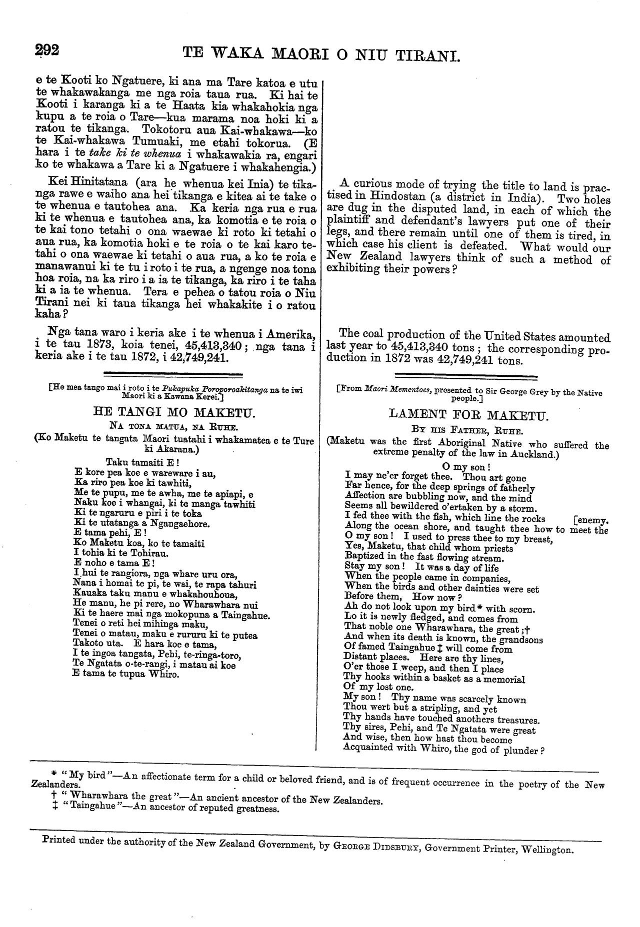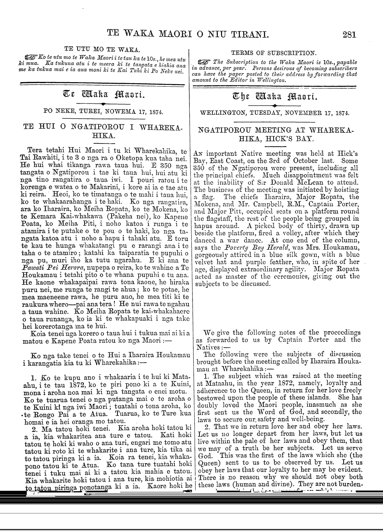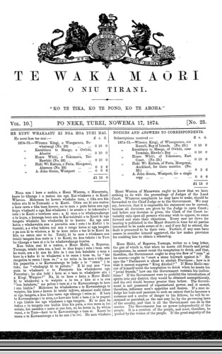 Te Waka Maori o Niu Tirani 1871-1877: Volume 10, Number 23. 17 November 1874 |