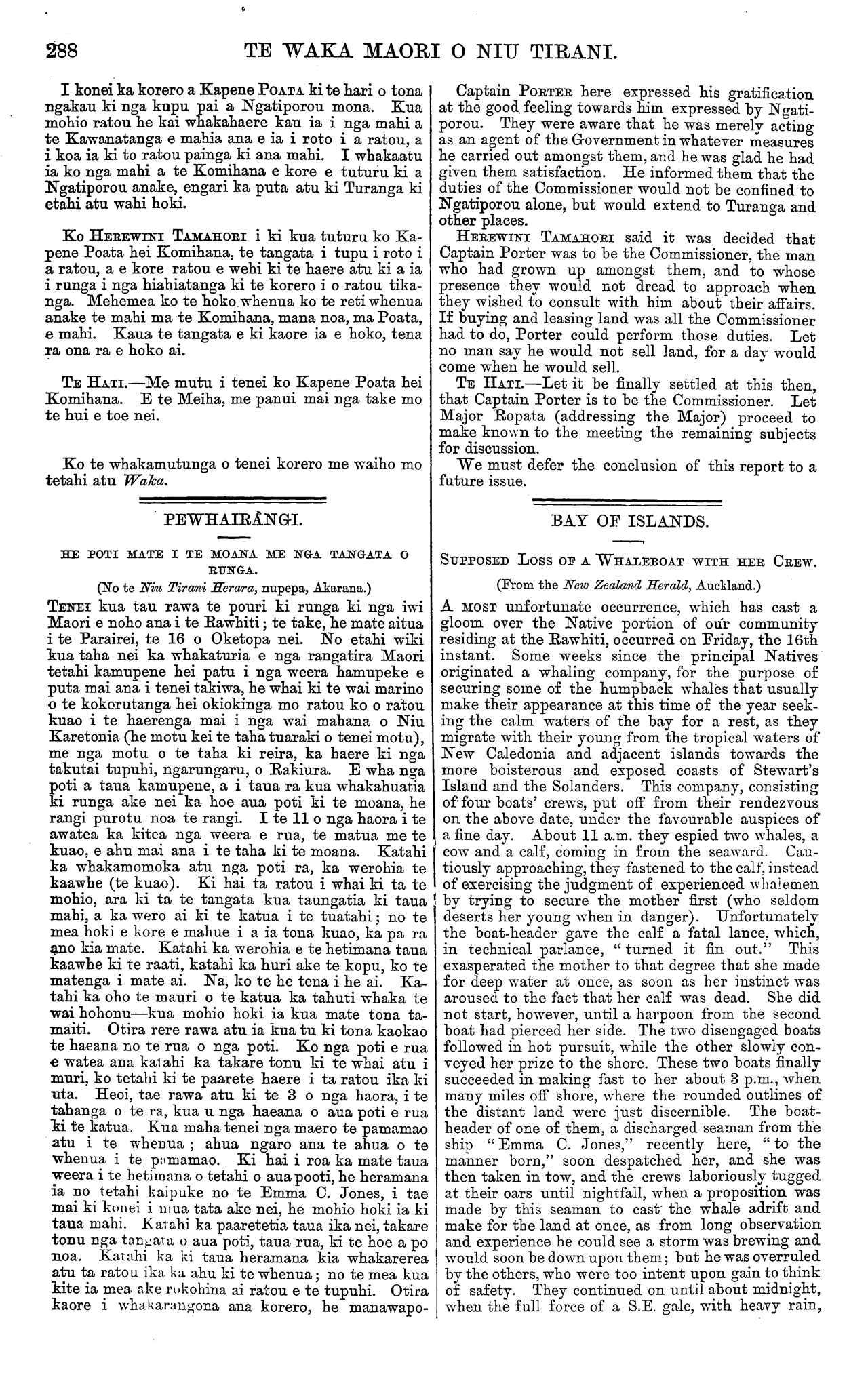 288 TE WAKA MAORI O NIU TIRANI. I konei ka korero a Kapene POATA ki te hari o tona ngakau ki nga kupu pai a Ngatiporou mona. Kua mohio ratou he kai whakahaere kau ia i nga mahi a te Kawanatanga e mahia ana e ia i roto i a ratou, a i koa ia ki to ratou painga ki ana mahi. I whakaatu ia ko nga mahi a te Komihana e kore e tuturu ki a Ngatiporou anake, engari ka puta atu ki Turanga ki etahi atu wahi hoki. Ko HEREWINI TAMAHORI i ki kua tuturu ko Ka- pene Poata hei Komihana, te tangata i tupu i roto i a, ratou, a e kore ratou e wehi ki te haere atu ki a ia i runga i nga hiahiatanga ki te korero i o ratou tika- nga. Mehemea ko te hoko whenua ko te reti whenua anake te mahi ma te Komihana, mana noa, ma Poata, e mahi. Kaua te tangata e ki kaore ia e hoko, tena ra ona ra e hoko ai. TE HATI.—Me mutu i tenei ko Kapene Poata hei Komihana. E te Meiha, me panui mai nga take mo te hui e toe nei. Ko te whakamutunga o tenei korero me waiho mo tetahi atu Waka. PEWHAIRANGI. HE POTI MATE I TE MOANA ME NGA TANGATA O RUNGA. (No te Niu Tirani Herara, nupepa, Akarana.) TENEI kua tau rawa te pouri ki runga ki nga iwi Maori e noho ana i te Rawhiti; te take, he mate aitua i te Parairei, te 16 o Oketopa nei. No etahi wiki kua taha nei ka whakaturia e nga rangatira Maori tetahi kamupene hei patu i nga weera hamupeke e puta mai ana i tenei takiwa, he whai ki te wai marino o te kokorutanga hei okiokinga mo ratou ko o ratou kuao i te haerenga mai i nga wai mahana o Niu Karetonia (he motu kei te taha tuaraki o tenei motu), me nga motu o te taha ki reira, ka haere ki nga takutai tupuhi, ngarungaru, o Rakiura. E wha nga poti a taua kamupene, a i taua ra kua whakahuatia ki runga ake nei ka hoe aua poti ki te moana, he rangi purotu noa te rangi. I te 11 o nga haora i te awatea ka kitea nga weera e rua, te matua me te kuao, e ahu mai ana i te taha ki te moana. Katahi ka whakamomoka atu nga poti ra, ka werohia te kaawhe (te kuao). Ki hai ta ratou i whai ki ta te mohio, ara ki ta te tangata kua taungatia ki taua mahi, a ka wero ai ki te katua i te tuatahi; no te mea hoki e kore e mahue i a ia tona kuao, ka pa ra ano kia mate. Katahi ka werohia e te hetimana taua kaawhe ki te raati, katahi ka huri ake te kopu, ko te matenga i mate ai. Na, ko te he tena i he ai. Ka- tahi ka oho te mauri o te katua ka tahuti whaka te wai hohonu—kua mohio hoki ia kua mate tona ta- maiti. Otira rere rawa atu ia kua tu ki tona kaokao te haeana no te rua o nga poti. Ko nga poti e rua e watea ana katahi ka takare tonu ki te whai atu i muri, ko tetahi ki te paarete haere i ta ratou ika ki uta. Heoi, tae rawa atu ki te 3 o nga haora, i te tahanga o te ra, kua u nga haeana o aua poti e rua ki te katua. Kua maha tenei nga maero te pamamao atu i te whenua ; ahua ngaro ana te ahua o te whenua i te pamamao Ki hai i roa ka mate taua weera i te hetimana o tetahi o aua pooti, he heramana ia no tetahi kaipuke no te Emma C. Jones, i tae mai ki konei i mua tata ake nei, he mohio hoki ia ki taua mahi. Katahi ka paaretetia taua ika nei, takare tonu nga tangata o aua poti, taua rua, ki te hoe a po noa. Katahi ka ki taua heramana kia whakarerea atu ta ratou ika ka ahu ki te whenua; no te mea kua kite ia mea. ake rokohina ai ratou e te tupuhi. Otira kaore i whakarangona ana korero, he manawapo- Captain PORTER here expressed his gratification at the good. feeling towards him expressed by Ngati- porou. They were aware that he was merely acting as an agent of the Government in whatever measures he carried out amongst them, and he was glad he had given them satisfaction. He informed them that the duties of the Commissioner would not be confined to Ngatiporou alone, but would extend to Turanga and other places. HEREWINI TAMAHORI said it was decided that Captain Porter was to be the Commissioner, the man who had grown up amongst them, and to whose presence they would not dread to approach when they wished to consult with him about their affairs. If buying and leasing land was all the Commissioner had to do, Porter could perform those duties. Let no man say he would not sell land, for a day would come when he would sell. TE HATI.—Let it be finally settled at this then, that Captain Porter is to be the Commissioner. Let Major Ropata (addressing the Major) proceed to make known to the meeting the remaining subjects for discussion. We must defer the conclusion of this report to a future issue. BAY OF ISLANDS. SUPPOSED LOSS OF A WHALEBOAT WITH HER CREW. (From the New Zealand Herald, Auckland.) A MOST unfortunate occurrence, which has cast a gloom over the Native portion of our community residing at the Rawhiti, occurred on Friday, the 16th instant. Some weeks since the principal Natives originated a whaling company, for the purpose of securing some of the humpback whales that usually make their appearance at this time of the year seek- ing the calm waters of the bay for a rest, as they migrate with their young from the tropical waters of New Caledonia and adjacent islands towards the more boisterous and exposed coasts of Stewart's Island and the Solanders. This company, consisting of four boats' crews, put off from their rendezvous on the above date, under the favourable auspices of a fine day. About 11 a.m. they espied two whales, a cow and a calf, coming in from the seaward. Cau- tiously approaching, they fastened to the calf, instead of exercising the judgment of experienced whalemen by trying to secure the mother first (who seldom deserts her young when in danger). Unfortunately the boat-header gave the calf a fatal lance which, in technical parlance, " turned it fin out." This exasperated the mother to that degree that she made for deep water at once, as soon as her instinct was aroused to the fact that her calf was dead. She did not start, however, until a harpoon from the second boat had pierced her side. The two disengaged boats followed in hot pursuit, while the other slowly con- veyed her prize to the shore. These two boats finally succeeded in making fast to her a