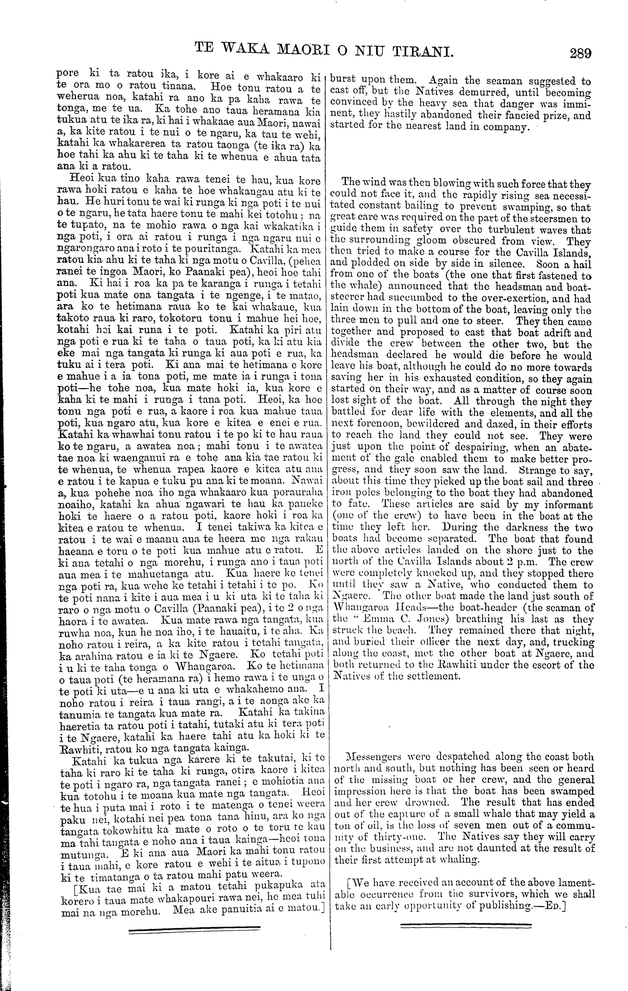 TE WAKA MAORI O NIU TIRANI. 289 pore ki ta ratou ika, i kore ai e whakaaro ki te ora mo o ratou tinana. Hoe tonu ratou a te weherua noa, katahi ra ano ka pa kaha rawa te tonga, me te ua. Ka tohe ano taua heramana kia tukua atu te ika ra, ki hai i whakaae aua Maori nawai a, ka kite ratou i te nui o te ngaru, ka tau te wehi katahi ka whakarerea ta ratou taonga (te ika ra) ka hoe tahi ka ahu ki te taha ki te whenua e ahua tata ana ki a ratou. Heoi kua tino kaha rawa tenei te hau, kua kore rawa hoki ratou e kaha te hoe whakangau atu ki te hau. He huri tonu te wai ki runga ki nga poti i te nui o te ngaru, he tata haere tonu te mahi kei totohu ; na te tupato, na te mohio rawa o nga kai whakatika i nga poti, i ora ai ratou i runga i nga ngaru nui e ngarongaro ana i roto i te pouritanga. Katahi ka mea ratou kia ahu ki te taha ki nga motu o Cavilla, (pehea ranei te ingoa Maori, ko Paanaki pea), heoi hoe tahi ana. Ki hai i roa ka pa te karanga i runga i tetahi poti kua mate ona tangata i te ngenge, i te matao, ara ko te hetimana raua ko te kai whakaue, kua takoto raua ki raro, tokotoru tonu i mahue hei hoe, kotahi hoi kai runa i te poti. Katahi ka piri atu nga poti e rua ki te taha o taua poti, ka ki atu kia eke mai nga tangata ki runga ki aua poti e rua, ka tuku ai i tera poti. Ki ana mai te hetimana e kore e mahue i a ia tona poti, me mate ia i runga i tona poti—he tohe noa, kua mate hoki ia, kua kore e kaha ki te mahi i runga i tana poti. Heoi, ka hoe tonu nga poti e rua, a kaore i roa kua mahue taua poti, kua ngaro atu, kua kore e kitea e enei e rua. Katahi ka whawhai tonu ratou i te po ki te hau raua ko te ngaru, a awatea noa ; mahi tonu i te awatea tae noa ki waenganui ra e tohe ana kia tae ratou ki te whenua, te whenua rapea kaore e kitea atu ana e ratou i te kapua e tuku pu ana ki te moana. Nawai a, kua pohehe noa iho nga whakaaro kua porauraha noaiho, katahi ka ahua ngawari te hau ka paneke hoki te haere o a ratou poti, kaore hoki i roa ka kitea e ratou te whenua. I tenei takiwa ka kitea e ratou i te wai e maanu aua te heera me nga rakau haeana e toru o te poti kua mahue atu o ratou. E ki aua tetahi o nga morehu, i runga ano i taua poti aua mea i te mahuetanga atu. Kua haere ko tenei nga poti ra, kua wehe ke tetahi i tetahi i to po. Ko te poti nana i kite i aua mea i u ki uta ki to taha ki raro o nga motu o Cavilla (Paanaki pea), i to 2 o nga haora i te awatea. Kua mate rawa nga tangata, kua ruwha noa, kua he noa iho, i te hauaitu, i te aha. Ka noho ratou i reira, a ka kite ratou i tetahi tangata,, ka arahina ratou e ia ki te Ngaere. Ko tetahi poti i u ki te taha tonga o Whangaroa. Ko te hetimana o taua poti (te heramana ra) i hemo rawa i te unga o te poti ki uta—e u ana ki uta e whakahemo aua. I noho ratou i reira i taua rangi, a i te aonga ake ka tanumia te tangata kua mate ra. Katahi ka takina haeretia ta ratou poti i tatahi, tutaki atu ki. tera poti i te Ngaere, katahi ka haere tahi atu ka hoki ki te Rawhiti, ratou ko nga tangata kainga. Katahi ka tukua nga karere ki te takutai, ki te taha ki raro ki te taha ki runga, otira kaore i kitea te poti i ngaro ra, nga tangata ranei; e mohiotia aua kua totohu i te moana kua mate nga tangata. Heoi te hua i puta mai i roto i te matenga o tenei weera paku nei, kotahi nei pea tona tana hinu, ara ko nga tangata tokowhitu ka mate o roto o te toru te kau ma tahi tangata e noho a.na i taua kainga—heoi tona mutunga. E ki ana aua Maori ka mahi tonu ratou i taua mahi, e kore ratou e wehi i te aitua i tupono ki te timatanga o ta ratou mahi patu weera. [Kua tae mai ki a matou tetahi pukapuka ata korero i taua mate whakapouri rawa nei, he mea tuhi mai na nga morehu. Mea ake panuitia ai e matou.] burst upon them. Again the seaman suggested to cast off, but the Natives demurred, until becoming convinced by the heavy sea that danger was immi- nent, they hastily abandoned their fancied prize, and started for the nearest laud in company. The wind was then blowing with such force that they could not face it, and the rapidly rising sea necessi- tated constant bailing to prevent swamping, so that great care was required on the part of the steersmen to guide them in safety over the turbulent waves that the surrounding gloom obscured from view. They then tried to make a course for the Cavilla Islands, and plodded on side by side in silence. Soon a hail from one of the boats (the one that first fastened to the whale) announced that the headsman and boat- steerer succumbed to the over-exertion, and had lain down in the bottom of the boat, leaving only the three men to pull and one to steer. They then came together and proposed to cast that boat adrift and divide the crew between the other two, but the headsman declared he would die before he would leave his boat, although he could do no more towards saving her in his exhausted condition, so they again started on their way, and as a matter of course soon lost sight of the boat. All through the night they battled for dear life with the elements, and all the next forenoon, bewildered and dazed, in their efforts to reach the land they could not see. They were just upon the point of despairing, when an abate- ment of the gale enabled them to make better pro- gress, and they soon saw the land. Strange to say, about this time they picked up the boat sail and three iron poles belonging to the boat they had abandoned to fate. These articles are said by my informant (one of the crew) to have been in the boat at the timu they loft her. During the darkness the two boats had become separated. The boat that found the above articles landed on the shore just to the north of the Cavilla Islands about 2 p.m. The crew were completely knocked up, and they stopped there until they saw a Native, who conducted them to Ngaere. The other boat made the land just south of Whangaroa Heads—the boat-header (the seaman of the Emma C. Jones) breathing his last as they struck the beach. They remained there that night, and buried their officer