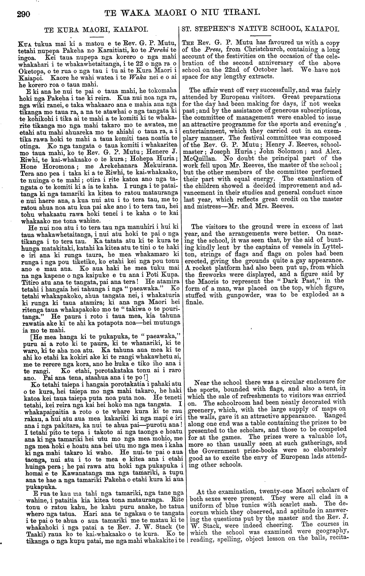 290 TE WAKA MAORI O NIU TIRANI. TE KURA MAORI, KAIAPOI. KUA. tukua mai ki a matou e te Rev. G. P. Mutu, tetahi nupepa Pakeha no Karaitiati, ko te Perehi te ingoa. Kei taua nupepa nga korero o nga mahi whakahari i te whakawhetaitanga, i te 22 o nga ra, o Oketopa, o te rua o nga tau i tu ai te Kura Maori i Kaiapoi. Kaore he wahi watea i te Waka nei e o ai he korero roa o taua mahi. E ki ana he nui te pai o taua mahi, he tokomaha hoki nga Pakeha i tae ki reira. Kua nui noa nga ra, nga wiki ranei, e taka whakaaro ana e mahia aua nga tikanga mo taua ra, a na te atawhai o nga tangata ki te kohikohi i tika ai te mahi a te komiti ki te whaka- rite tikanga mo nga mahi takaro mo te awatea, me etahi atu mahi ahuareka mo te ahiahi o taua ra, a i tika rawa hoki te mahi a taua komiti taea noatia te otinga. Ko nga tangata o taua komiti i whakaritea mo taua mahi, ko te Rev. G. P. Mutu; Henere J. Riwhi, te kai-whakaako o te kura; Hohepa Huria; Hone Horomona; me Arekehanara Mekuirana. Tera ano pea i taka ki a te Riwhi, te kai-whakaako, te nuinga o te mahi ; otira i rite katoa ano nga ta- ngata o te komiti ki a ia te kaha. I runga i te patai- tanga ki nga tamariki ka kitea to ratou matauranga e nui haere ana, a kua nui atu i to tera tau, me to ratou ahua noa atu kua pai ake ano i to tera tau, hei tohu whakaatu rawa hoki tenei i te kaha o te kai whakaako me tona wahine. He nui noa atu i to tera tau nga manuhiri i hui ki taua whakawhetaitanga, i nui atu hoki te pai o nga tikanga i to tera tau. Ka tatata atu ki te kura te hunga matakitaki, katahi ka kitea atu te tini o te haki e iri ana ki runga taura, he mea whakamaro ki runga i nga pou tiketike, ko etahi kei nga pou tonu ano e mau ana. Ko aua haki he mea tuku mai na nga kapene o nga kaipuke e tu ana i Poti Kupa. Titiro atu ana te tangata, pai ana tera! He atamira tetahi i hangaia hei tahunga i nga " paeawaka." Ko tetahi whakapakoko, ahua tangata nei, i whakaturia ki runga ki taua atamira; ki ana nga Maori hei ritenga taua whakapakoko mo te " takiwa o te pouri- tanga." He paura i roto i taua mea, kia tahuna rawatia ake ki te ahi ka potapota noa—hei mutunga ia mo te mahi. [He mea hanga ki te pukapuka, te " paeawaka," puru ai a roto ki te paura, ki te whanariki, ki te waro, ki te aha noa atu. Ka tahuna aua mea ki te ahi ko etahi ka kokiri ake ki te rangi whakawhetu ai, me te rerere nga kora, ano he huka e tiko iho ana i te rangi. Ko etahi, porotakataka tonu ai i raro ano. Pai ana tena, ataahua ana i te po!] Ko tetahi taiepa i hangaia porotakatia i pahaki atu o te kura, hei taiepa mo nga mahi takaro, he haki katoa kei taua taiepa puta noa puta noa. He teneti tetahi, kei reira nga kai hei hoko ma nga tangata. I whakapaipaitia a roto o te whare kura ki te rau rakau, a hui atu aua mea kakariki ki nga mapi e iri ana i nga pakitara, ka nui te ahua pai—purotu ana! I tetahi pito te tepa i takoto ai nga taonga e hoatu ana ki nga tamariki hei utu mo nga mea mohio, me nga mea hoki e hoatu ana hei utu mo nga mea i kaha ki nga mahi takaro ki waho. He nui. te pai o aua taonga, nui atu i to te mea e kitea ana i etahi huinga pera; he pai rawa atu hoki nga pukapuka i homai e te Kawanatanga ma nga tamariki, a tupu ana te hae a nga tamariki Pakeha o etahi kura ki aua pukapuka. E rua te kau ma tahi nga tamariki, nga tane nga wahine, i pataitia kia kitea tona matauranga. Rite tonu o ratou kahu, he kahu puru anake, he tatua whero nga tatua. Hari ana te ngakau o te tangata i te pai o te ahua o aua tamariki me te matau ki te whakahoki i nga patai a te Rev. J. W. Stack (te Taaki) raua ko te kai-whakaako o te kura. Ko te tikanga o nga kupu patai, me nga mahi whakakite i te I ST. STEPHEN'S NATIVE SCHOOL, KAIAPOI. THE Rev. G. P. Mutu has favoured us with a copy of the Press, from Christchurch, containing a long account of the festivities on the occasion of the cele- bration of the second anniversary of the above school on the 22nd of October last. We have not space for any lengthy extracts. The affair went off very successfully, and was fairly attended by European visitors. Great preparations for the day had been making for days, if not weeks past; and by the assistance of generous subscriptions, the committee of management were enabled to issue an attractive programme for the sports and evening's entertainment, which they carried out in an exem- plary manner. The festival committee was composed of the Rev. G. P. Mutu; Henry J. Reeves, school- master ; Joseph Huria ; John Solomon; and Alex. McQuillan. No doubt the principal part of the work fell upon Mr. Reeves, the master of the school; but the other members of the committee performed their part with equal energy. The examination of the children showed a decided improvement and ad- vancement in their studies and general conduct since last year, which reflects great credit on the master and mistress—Mr. and Mrs. Reeves. The visitors to the ground were in excess of last year, and the arrangements were better. On near- ing the school, it was seen that, by the aid of bunt- ing kindly lent by the captains of vessels in Lyttel- ton, strings of flags and flags on poles had been erected, giving the grounds quite a gay appearance. A rocket platform had also been put up, from which the fireworks were displayed, and a figure said by the Maoris to represent the " Dark Past," in the form of a man, was placed on the top, which figure, stuffed with gunpowder, was to be exploded as a finale. Near the school there was a circular enclosure for the sports, bounded with flags, and also a tent, in which the sale of refreshments to visitors was carried on. The schoolroom had been neatly decorated with greenery, which, with the large supply of maps on the walls, gave it an attractive appearance. Ranged along one end was a table containing the prizes to be presented to the scholars, and those to be competed for at the games. The prizes were a valuable lot, more so than usually seen at such gatherings, and the Government prize-books were so elaborately go