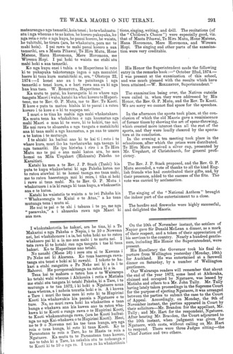 TE WAKA MAORI O NIU TIRANI. 291 matauranga o nga tamariki koia tenei; ko te whakaatu- atu i nga whenua o te ao katoa, he korero pukapuka, ko nga reta o roto o nga kupu, he panui korero, he waiata he tuhituhi, he tirara (ara, he whakatutu, pera mo te mahi hoia). I pai rawa te mahi panui korero a aua tamariki, ara a Maata Pihawai, Te Hira Mutu, Hone Matene, Hana Horomona, Mere Horomona, me Wiremu Hopi. I pai hoki te waiata me etahi atu mahi hoki a aua tamariki. Ko nga kupu enei i tuhia o te Huperitene ki roto ki te pukapuka takotoranga ingoa o nga manuhiri haere ki taua kura matakitaki ai, ara, " Oketopa 22, 1874:—I konei ano au i te pataitanga i nga tamariki o tenei kura, a e hari rawa aua au ki nga hua kua taea. W. RORETONA, Huperitene." Ka mutu te patai, ka karangatia ki ro whare nga tangata Maori i waho, katahi ka whai korero te Huperi- tene, me te Rev. G. P. Mutu, me te Rev. Te Kooti. E kore e puta ta matou hiahia ki te panui i a ratou korero i te kore o o ki te nupepa nei. I muri o te tina ka mahia nga mahi whakatakaro. Ka mutu tena ka whakakitea e nga kaumatua nga mahi Maori o mua ki te wero, ki te kokiri, tao nei He nui rawa te ahuareka o nga tangata o matakitaki ana ki taua mahi a nga kaumatua, a pa aua to umere a te katoa i te mutunga. I te ahiahi ka huihui ano ki te kai ti i roto i te whare kura, muri iho ka tuwhatuwha nga taonga ki nga tamariki. He ipu hiriwha i riro i a Te Hira Mutu mo te pai o aua mahi katoa atu, ho mea homai na Mita Urquhart (Hakuata) Pakeha no Karaitiati. Katahi ka mea a te Rev. J. P. Stack (Taaki) kia puta te kupu whakawhetai ki nga Pakeha katoa mo to ratou atawhai ki te homai taonga mo taua mahi, me to ratou haeretanga mai ki reira, i tika ai hoki i rawe ai taua mahi. Na te Rev. G. P. Mutu i whakatuara i a ia ki runga ki taua kupu, a whakaaetia ana e te katoa. Katahi ka waiatatia te waiata a to iwi Pakeha kia "Whakaorangia te Kuini e te Atua," a ko tona mutunga tena i mutu ai. He nui te pai o te ahi i tahuna i te po, me nga " paeawaka," a i ahuareka rawa nga Maori ki aua mea. I whakatakototia he hakari, ara he tina, ki a Te Makarini e nga Pakeha o Nepia, i te .10 o Nowema nei, hei whakahonore i a ia, hei tohu hoki no to ratou whakaaro pai ki a ia mo ana mahi i te motu nei. I tata rawa ki te kotahi rau nga tangata i tae ki taua hakari. Ko te Huperitene ano tetahi. No nanahi (Mane 16) i rere atu ai te Kawana i Po Neke nei ki Akarana. Ko tona haerenga rawa- tanga atu tenei e hoki ai ki rawahi. I tokoto te ha- kari a etahi rangatira o Po Neke nei ki a ia i te Rahoroi. He poroporoakitanga na ratou ki a ia. Tena kai te mahara o tatou hoa o te Wairarapa ko tetahi wahi whenua i Ahikouka i retia e Matiaha me etahi atu tangata ki tetahi Pakeha, ki a Tare, i te mutunga o te tau 1872, i ki hoki a Ngatuere nona taua whenua, a i nohoia tonutia hoki e ia. Ai kawea e Tare i muri iho taua mea ki roto ki te Hupirimi Kooti kia whakawakia kia panaia a Ngatuere e te ture. Na, no muri rawa hoki ka whakaritea e taua hunga e whakawa ana kia kawea ano ta ratou wha- kawa ki te Kooti o runga rawa o te Hupirimi Kooti, te Kooti whakamutunga rawa, (ara he Kooti huihui- nga no nga Kai-whakawa o te Hupirimi Kooti). Heoi, no te 9 o Nowema nei ka tae taua hunga, ara nga roia o taua hunga, ki roto ki taua Kooti. Ko te Paranatana te roia a Tare, ko te Haata te roia a Ngatuere. Ka mutu ta te Paranatana tana korero, mo te taha ki a Tare, ka nekehia atu te nohoanga o te Kooti ki te 10 o nga ra. I taua ra ka whakatikaia tions, singing, writing, and drill. The recitations (of the Children's Choice ") were especially good, viz. that of Maata Pihawai, Te Hira Mutu, Hone Matene, Hana Horomona, Mere Horomona, and Wiremu Hopi. The singing and other parts of the examina- tion were very creditable. His Honor the Superintendent made the following- entry in the remarks book;—" October 22nd, 1874. I was present at the examination of this school and was much pleased with the results which have been attained.—W. ROLLESTON, Superintendent." The examination being over, the Natives outside were called in. when they were addressed by His Honor, the Rev. G. P. Mutu, and the Rev. Te Kooti. We aro sorry wo cannot find space for the speeches. In the afternoon the sports took place, at the con- clusion of which the old Maoris gave a reminiscence of former times by showing the art of spear-throwing,. which created more interest than all the rest of the sports, and they were loudly cheered by the specta- tors at its conclusion. In the evening a tea meeting; took place in the schoolroom, after which the prizes were distributed. Te Hira Mutu received a silver cup, presented by Mr. Urquhart, of Christchurch, for general profi- ciency. The Rev. J. P. Stack proposed, and the Rev. G. P. Mutu seconded, a vote of thanks to all the kind Eng- lish friends who had contributed their gifts, and, by their presence, added to the success of the fete. The vote was carried by acclamation. The singing of the "National Anthem" brought the indoor part of the entertainment to a close. The bonfire and fireworks were highly successful,. and delighted the Maoris. On the 10th of November instant, the settlers of Napier gave Sir Donald McLean a dinner, as a mark of their respect, and a token of their appreciation of his services to the country. Nearly a hundred gentle- men, including His Honor the Superintendent, were present. His Excellency the Governor took his final de- parture from Wellington yesterday (Monday, 16th) for Auckland. He was entertained at a farewell dinner on Saturday, by a number of Wellington gentlemen. Our Wairarapa readers will remember that about the end of the year 1872, some land at Ahikouka, claimed and occupied by Ngatuere, was leased by Matiaha and others to a Mr. John Tully. Mr. Tully having lately taken proceedings in the Supreme Court for the purpose of ejecting Ngatuere, it was arranged between the parties to submit the case to the Court of Appeal. Accordingly, on Monday, the 9th of November instant, the pa