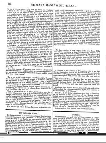 TE WAKA MAORI O NIU TIRANI. ———————————————————— "KO TE TIKA, KO TE PONO, KO TE AROHA." VOL. 10.] PO NEKE, TUREI, NOWEMA 17, 1874. [No. 23. HE KUPU WHAKAATU KI NGrA HOA TUHI MAI. He moni kua tae mai:— £ 5. d. 1874-75.—Wiremu "Kingi, o Wangaruru, Pe- whairangi (No. 23) ... ... O 10 O „ Karaitiana te Mango, o Owhiti, Ahuriri ... ... ... ... O 10 O „ Hoare Whiti, o Tokomaru, Tai- Rawhiti (No. 23) ... ... ... O 10 O „ Haki Wi Kaitaia, o Peria, Mongonui, Akarana (No. 23) ... ... O 2 6 „ A. John Green, Westport ... ... O O 6 £1 13 0 Nana noa i kore e mohio, a Hemi Warena, o Manawatu, kaore ho tikanga i a matou mo nga Kai-whakawa o te Kooti Whenua. Mehemea he korero whakahe tana, e tika ana kia tukua atu ki te Tumuaki o te Kooti. Otira me ki ano matou e kore rawa e tika tana korero, no te mea e puta katoa ana nga kupu whakaoti a nga Kai-whakawa i te aroaro o te tokomaha i roto i te Kooti e tuwhera aua; a, ki mua o te whakapuakanga o te kupu, e karanga tonu ana te Kai-tuhituhi o te Kooti ki nga tangata whakahe kia whakatika ki te korero. Ko nga mea katoa e whakawakia ana e panuitia ana i roto i te Kahiti i te tuatahi, a e whai takiwa roa ana e rongo katoa ai nga tangata e pa ana ki te whenua, a ki te kore ratou e tae ki te Kooti ka kiia na ratou ano te he. Tetahi, ki te mea e whakaaro ana tetahi tangata kua mate ia i te Kooti, na kua takoto i te Ture he tikanga e taea ai e ia he whakawakanga tuarua. Kua tuhia mai ki a matou, e Hone Heihi, o Reporua, Turanga, tetahi roto roa, a heoi te tino kupu i roto i taua reta ko tenei, ara e ki ana ka kite ia i ona hoa katakata o mua e kore ia e kaha ki te whakawai a te rama i taua ra, he " kai rangatira te rama i taua ra;" a no reira ia ka mea e tika ana kia papanitia e te Kawanatanga te heke o te " rama" i te take, me " whakapipi ki te pohatu." E ki mai ana " kua puta te whakaaro o te Paremete kia whakakorea nga Porowini; he aha hoki i kore ai e taea te whakakore atu i a Kingi Waipiro?" Na, ki te kore e kaha a Hone Heihi ki te whakawai a te waipiro a te wa e kite ai e ia ona " hoa katakata," me pehea e taea ai e te Kawanatanga te here i ona hiahia ? Mehemea ka whakakorea e te Kawanatanga te waipiro, kia kore e kawea ki tetahi takiwa, akuanei mahi tahae ai nga tangata, a kua kino rawa nga tikanga i reira ai. E hara to Kawanatanga i te atua, a e kore ano hoki e taea e ia te pupuri i nga hiahia me nga whakaaro o nga tangata. Ki te mea ka tukua e te tangata ona hiahia kino kia puta, a riro rawa ia hei. autaia, hei nanakia e mate ai ona hoa, na ka herea ia, ka whiua ranei, e te Ture—heoi to te Kawanatanga e taea ai. Kaore he mana o te Kawanatanga e tu ke ana i te iwi. He mea whakatu NOTICES AND ANSWERS TO CORRESPONDENTS. Subscriptions received ;— £ s. d. 1874-75.—Wiremu Kingi, of Whangaruru, via Russell, Bay of Islands. (No. 23.) O IO O „ Karaitiana te Mango, of Owhiti, near Taradale, Hawke's Bay ... ... 010 O „ Hoare Whiti, of Tokomaru, East Coast. (No. 23.) ... ... O IO O „ Haki Wi Kaitaia, of Peria, Mongonui, Auckland, for three months. (No. 23.) ... ... ... ... O 2 6 „ A. John Green, Westport, for a single copy ... ... ... ... O O 6 £1 13 0 Hemi Warena of Manawatu ought to know that we have nothing to do with the proceedings of Judges of the Land Court. Whatever complaints he may have to make, should bo forwarded to the Chief Judge or to the Government. We may say, however, that it is impossible his statement can bo correct, because all decisions are given by the Judge in open Court.; and before any decision is given, the Clerk of the Court in- variably calls upon all persons who may wish to oppose, to come forward and state their objections. Every case set down Ior hearing is published in the Maori Gazette in time for all parties interested to be made aware of it; and if any fail to attend, the fault is presumed to be their own. Further, if any man have reason to consider himself aggrieved, the law makes provision for enabling him to obtain a rehearing. Hone Heihi, of Reporua, Turanga, writes us a long letter, the gist of which is, that when he meets old friends and jovial companions, he cannot resist the temptation to drink, and that, therefore, the Government ought to stop the flow of " rum " at its source ought to " erect a stone bulwark against it." He says the " Parliament is about to abolish Provinces ; how is it that it cannot suppress " King Alcohol ? " If Hone Heihi can- not of himself resist the temptation to drink when he meets his "jovial friends," how can the Government restrain his inclina- tions ? If the Government were to prohibit the introduction of spirits into any district, they would be obtained surreptitiously, and the evil would become greater than before. The Govern- ment is not possessed of supernatural power, and it cannot, therefore, influence men's appetites and desires. If a man in- dulge his lusts and passions to such an extent that he becomes a nuisance and a source of danger to his fellows, he will be re- strained or punished, as the case may be, by the governing laws of the country, and that is all the Government can do in the matter. The Government has no power independently of the people. It. is a creation of the people, and must, therefore, be guided by the wishes of the people. If the great majority of the